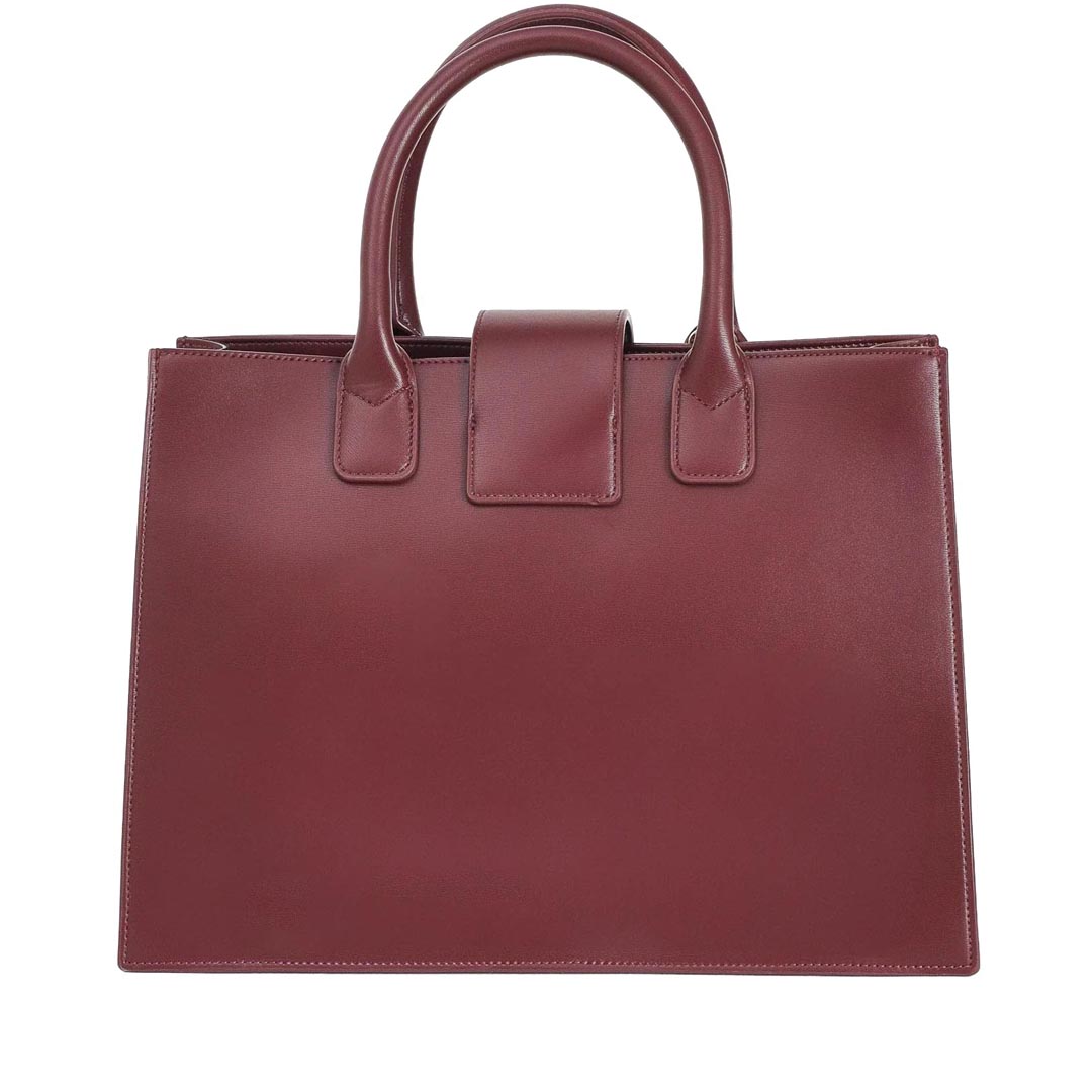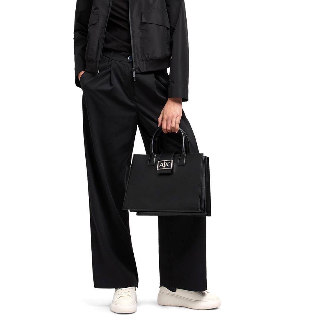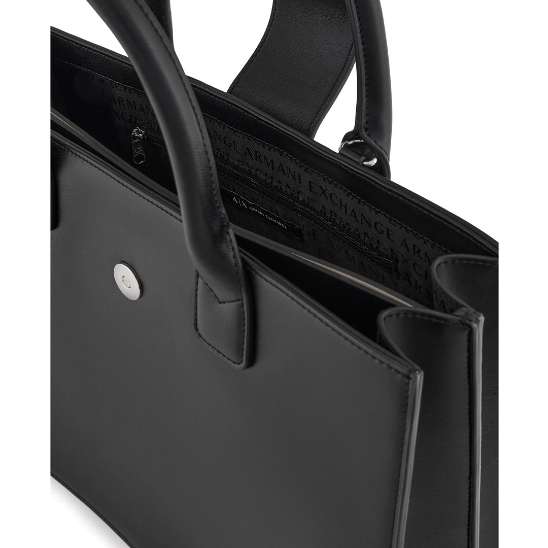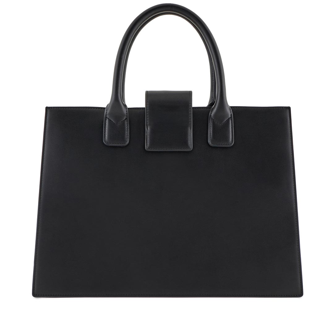Elegant and sophisticated trapezoid-shaped handbag. The structured design gives it a modern and versatile look, perfect for any occasion. The removable shoulder strap allows it to easily transform from a handbag or shoulder bag, offering practicality and style. The snap closure ensures security and ease of use, while the logo decoration adds a distinctive and refined touch. A chic and functional accessory, ideal for completing any outfit with elegance. Faux leather handbag. Decorative logo detail. Snap closure. Two handles. Internal pocket. Removable shoulder strap. Dimensions: 33.5 x 14 x 23 cm.