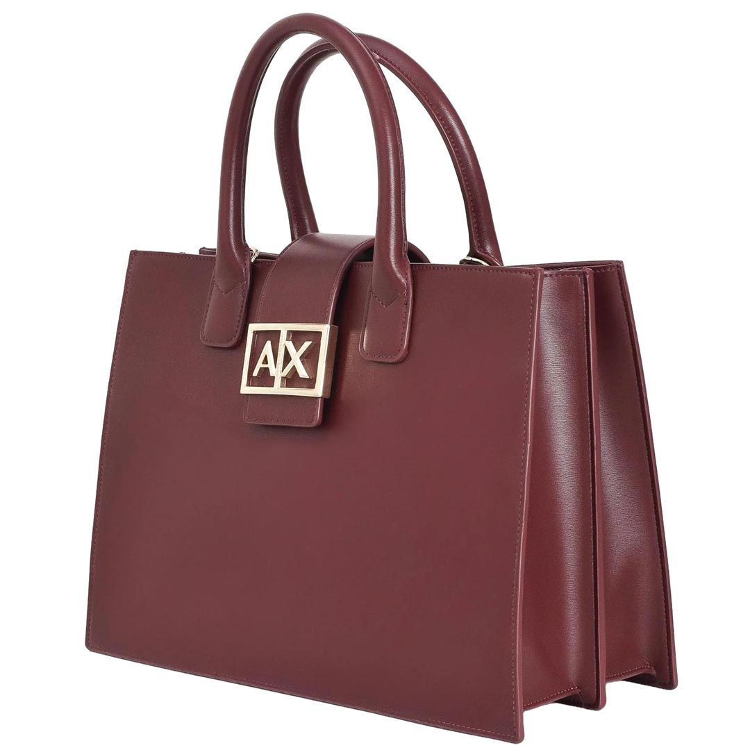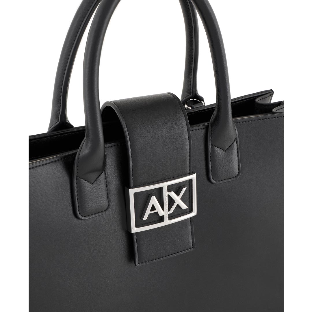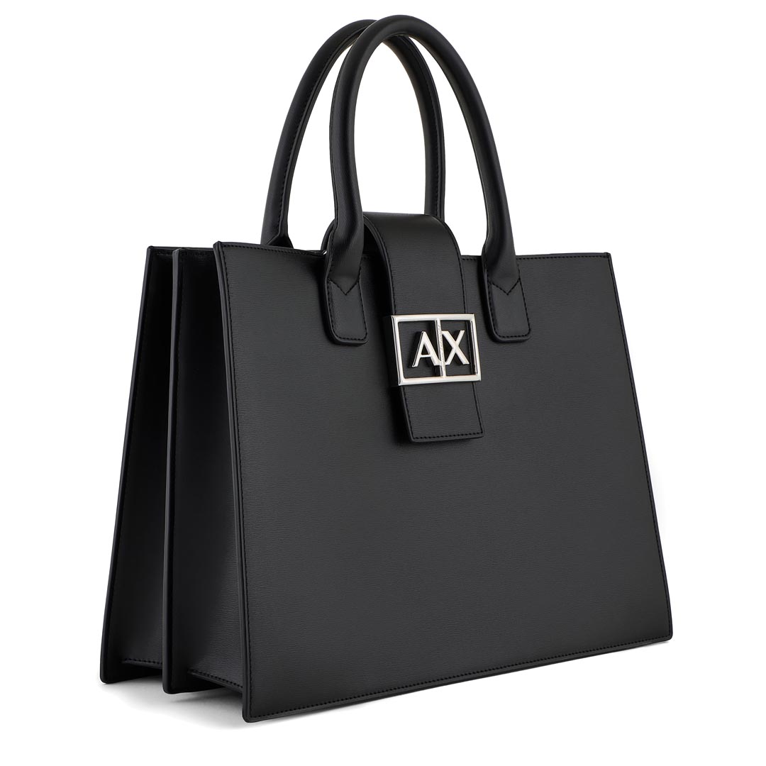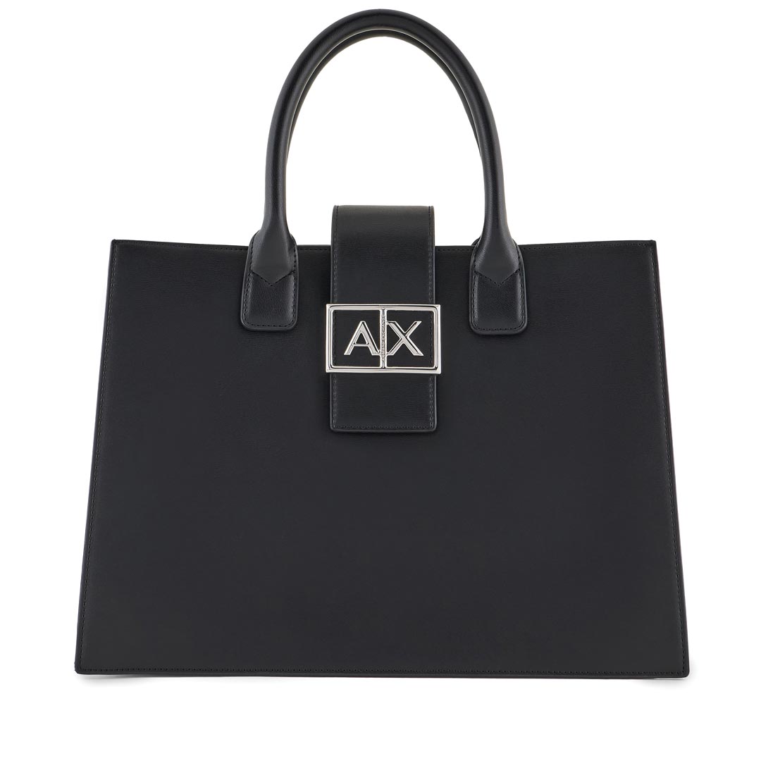 Elegant and sophisticated trapezoid-shaped handbag. The structured design gives it a modern and versatile look, perfect for any occasion. The removable shoulder strap allows it to easily transform from a handbag or shoulder bag, offering practicality and style. The snap closure ensures security and ease of use, while the logo decoration adds a distinctive and refined touch. A chic and functional accessory, ideal for completing any outfit with elegance. Faux leather handbag. Decorative logo detail. Snap closure. Two handles. Internal pocket. Removable shoulder strap. Dimensions: 33.5 x 14 x 23 cm.