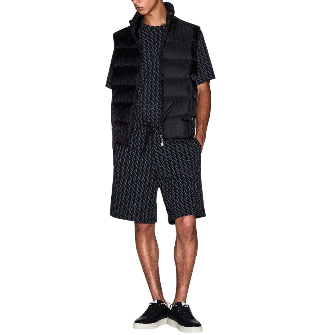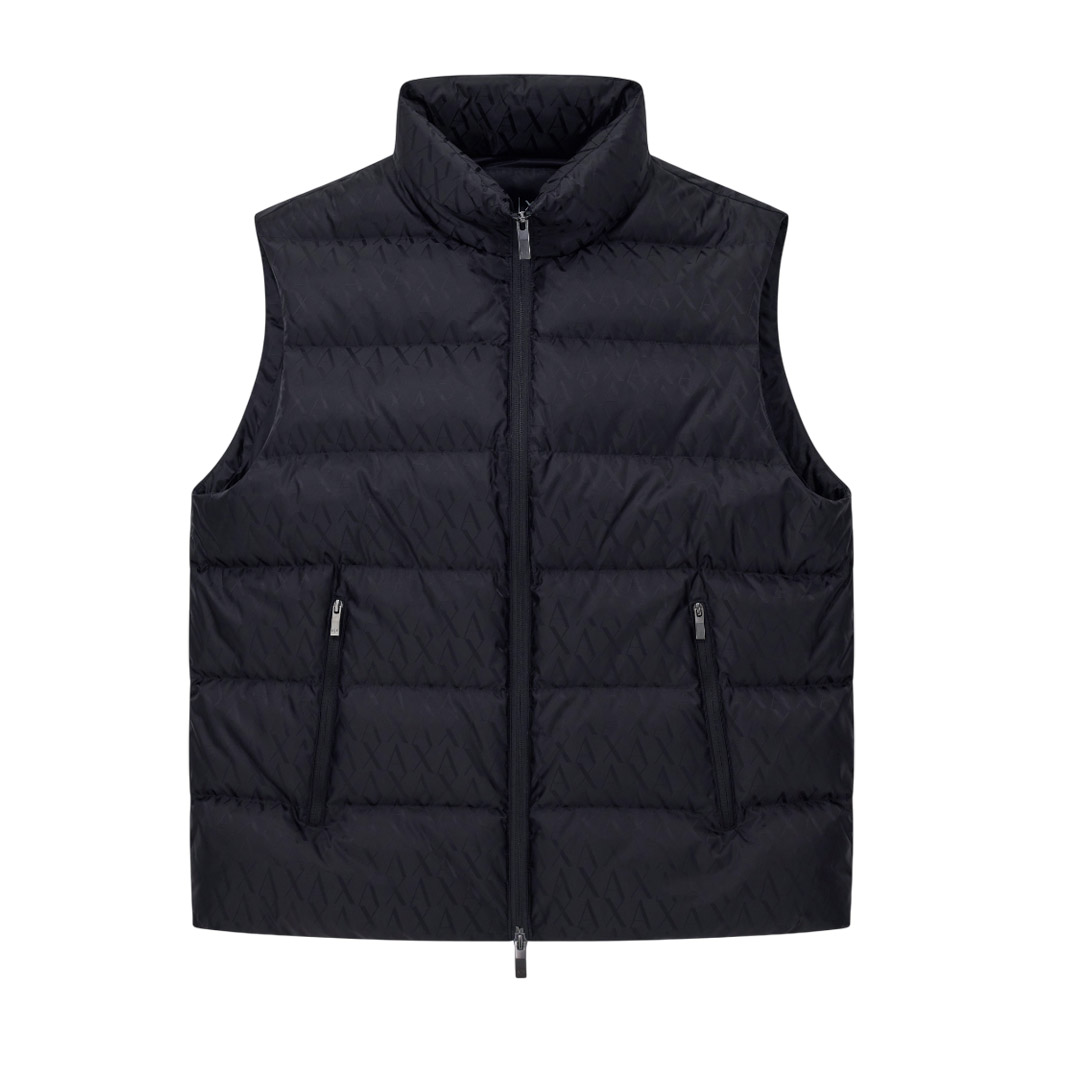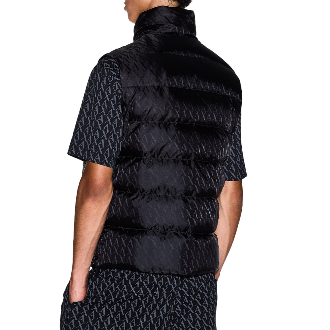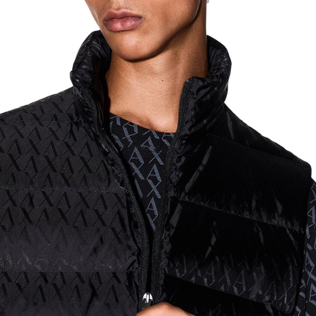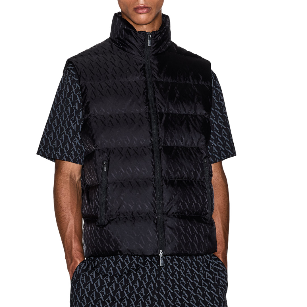 This padded vest made with a technical nylon exterior and warm padding is the perfect piece for braving the cold with unmistakable style. This jacket stands out for its sophisticated all-over jacquard workmanship with a tone-on-tone A|X logo, a detail that adds a touch of understated elegance and a strong identity. The high collar, front zip closure, and practical side zip pockets define its functional design.