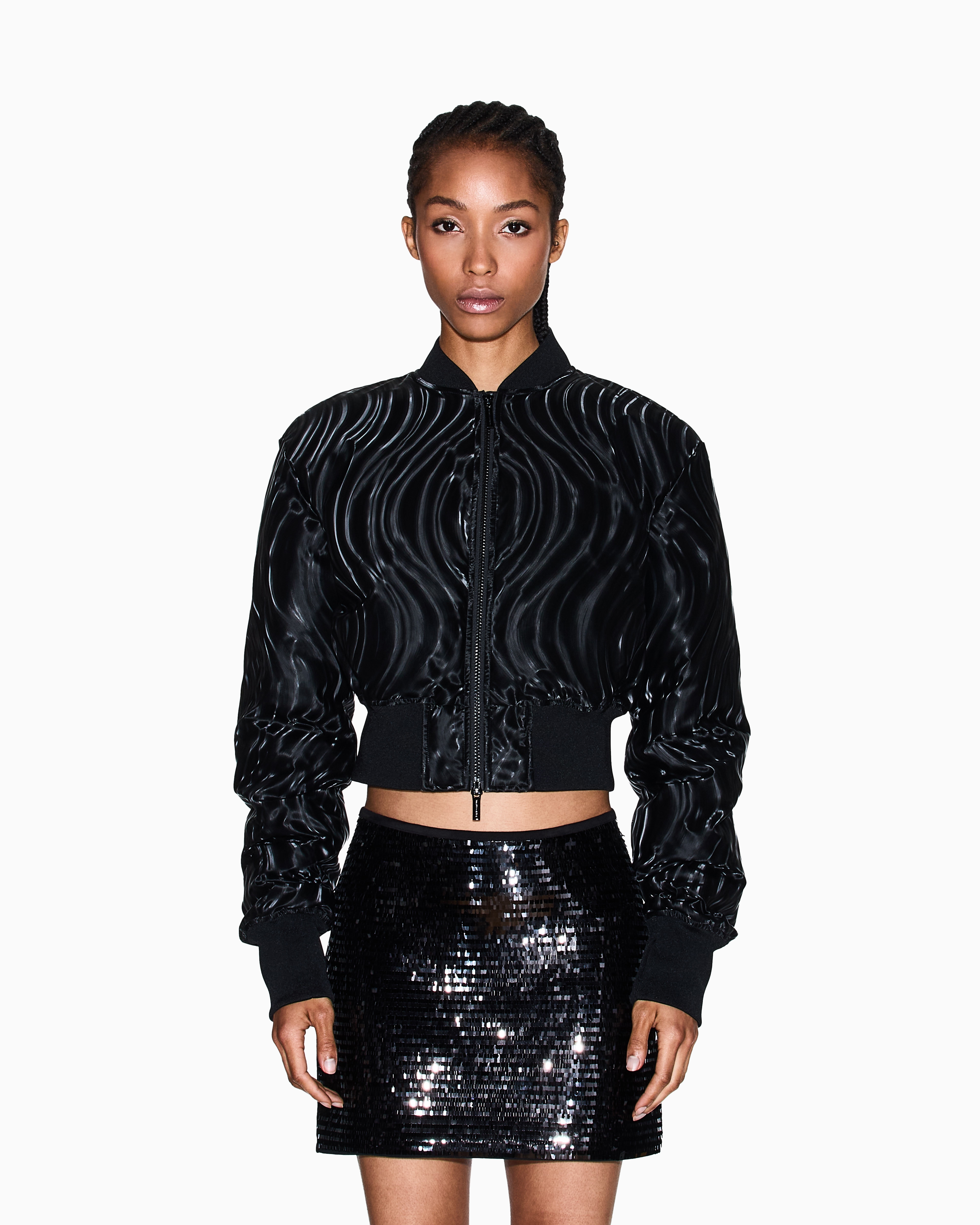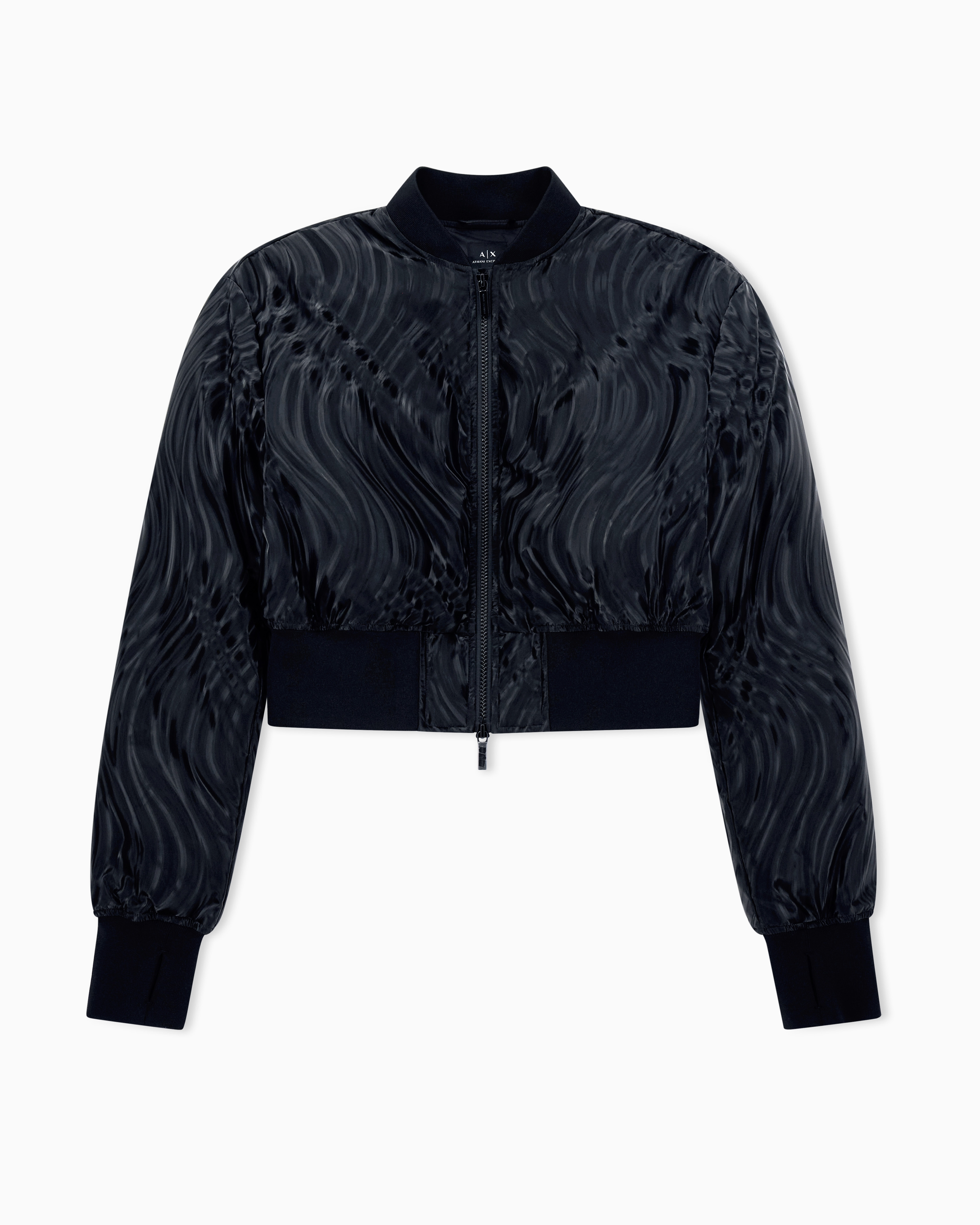 This cropped bomber jacket is crafted from technical fabric with a distinctive embossed finish that creates a tone-on-tone wavy pattern, ideal for a dynamic and sophisticated look. This piece reinterprets an urbanwear classic with a touch of contemporary elegance, perfect for Milanese evenings or adding a statement element to a casual outfit. The three-dimensional texture catches the light, lending movement and depth to the essential design.