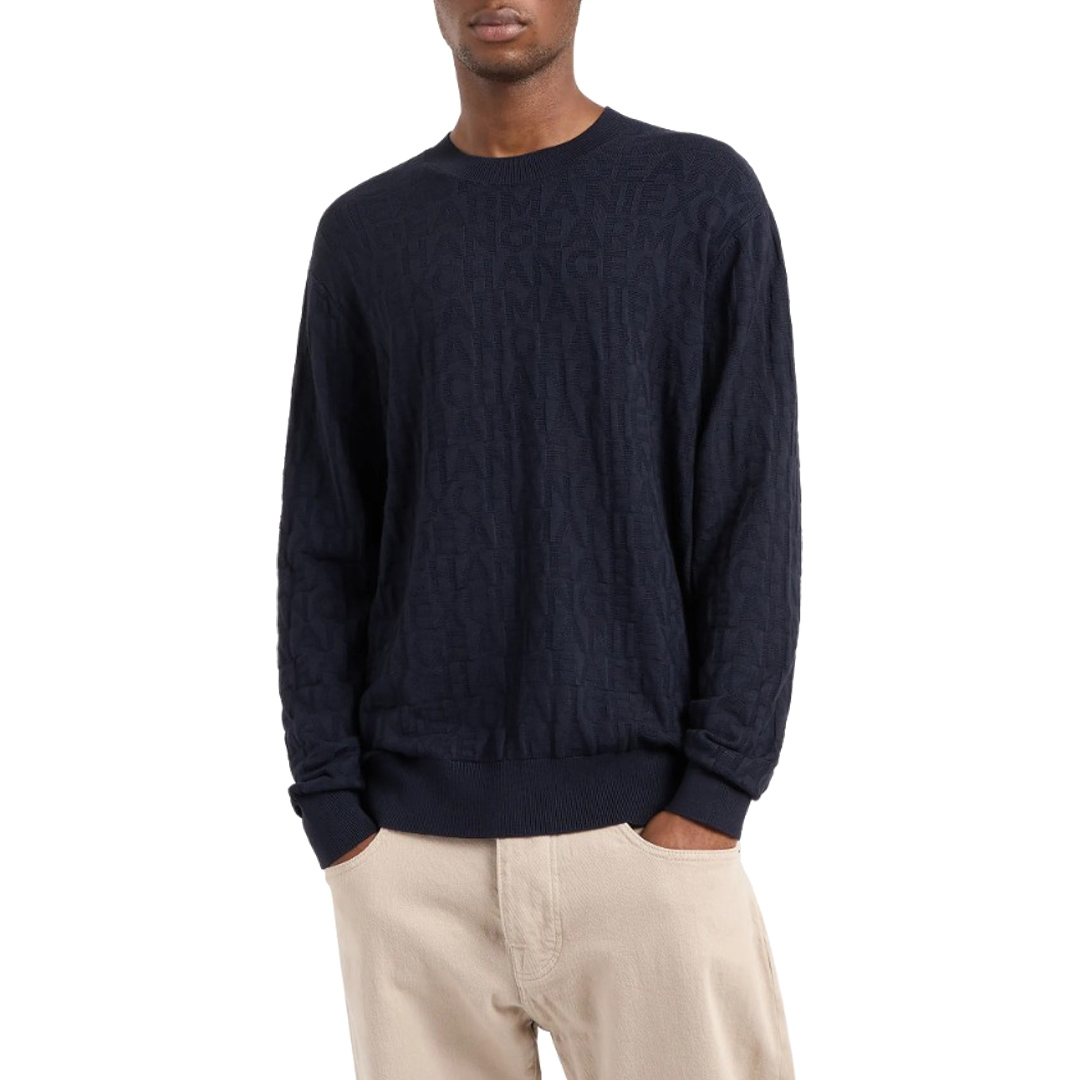 Armani Exchange AX men's blue crew neck sweater with all over logo pattern Jacquard Logo pattern Round neck
