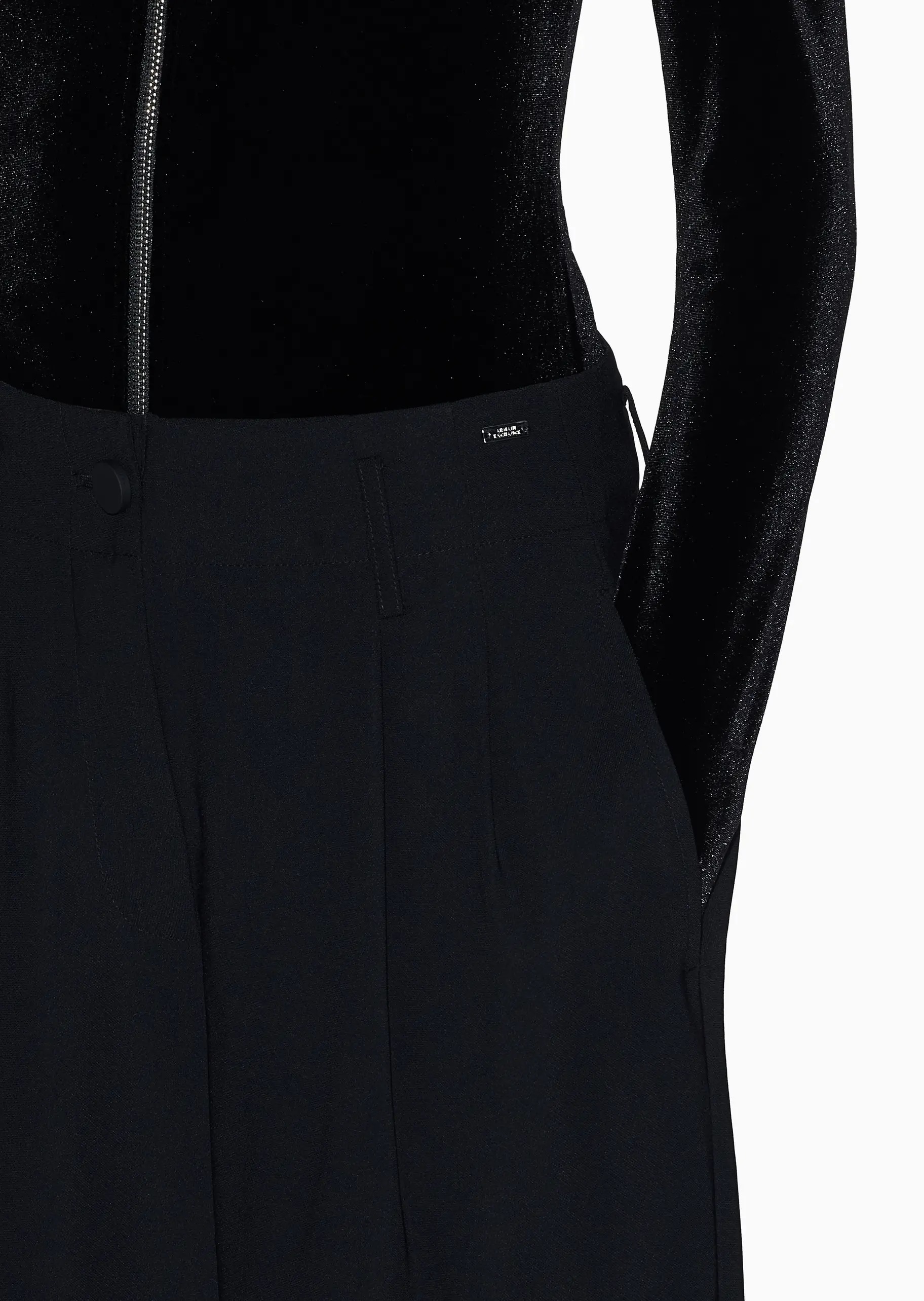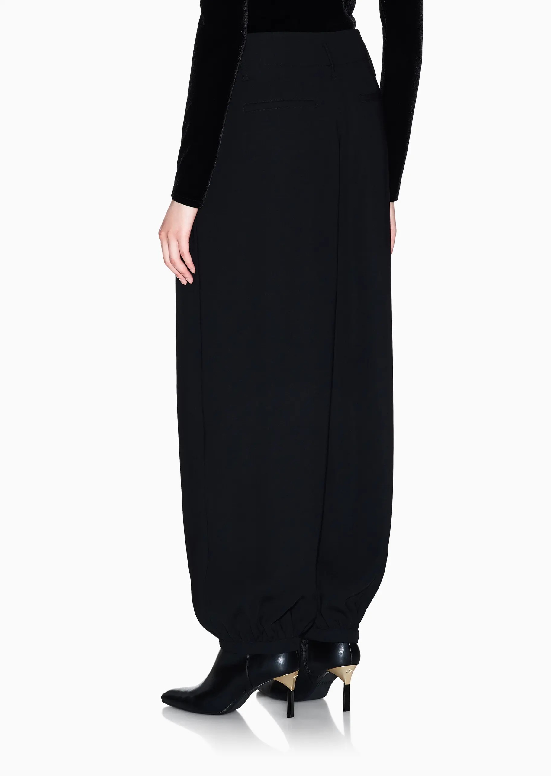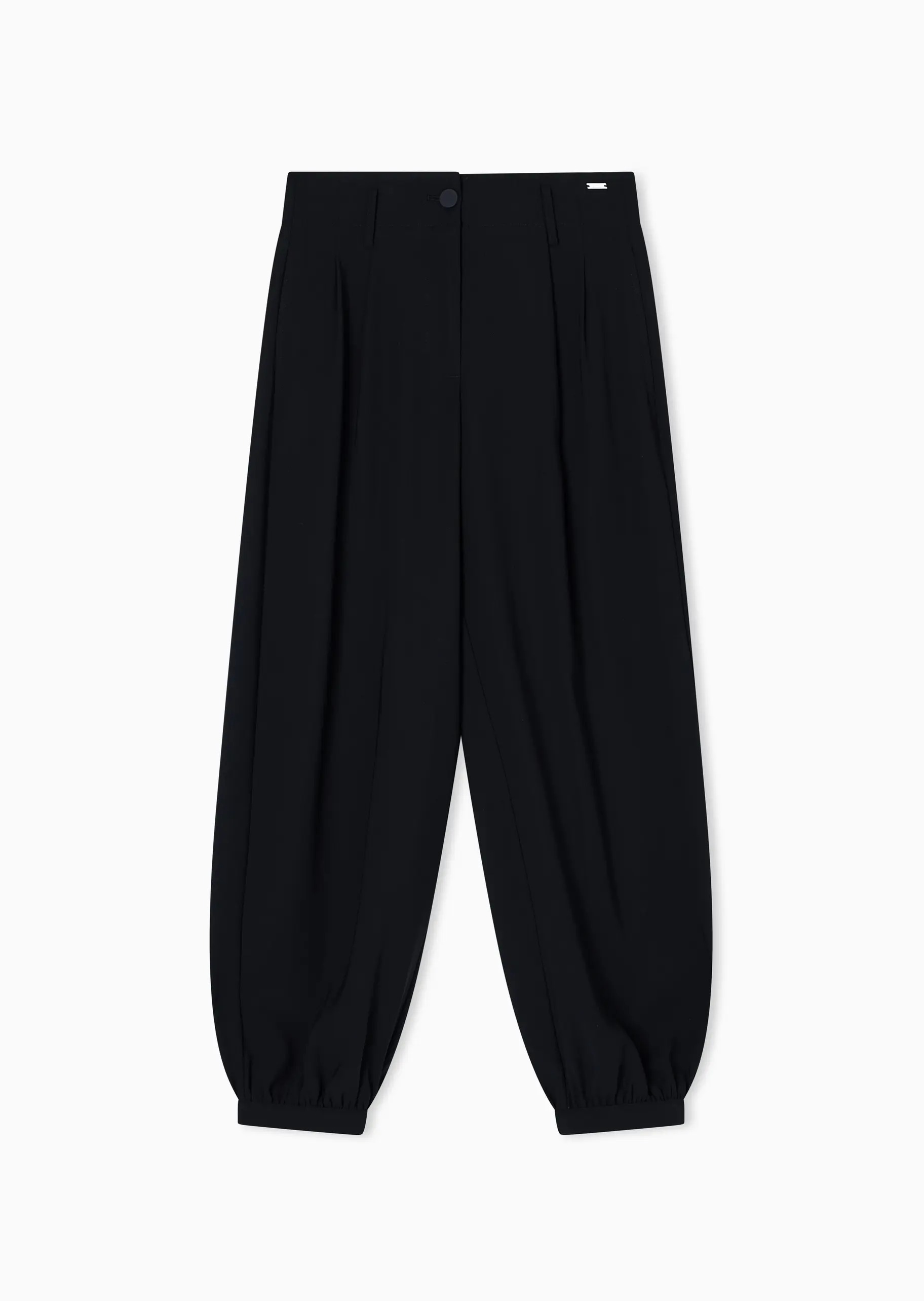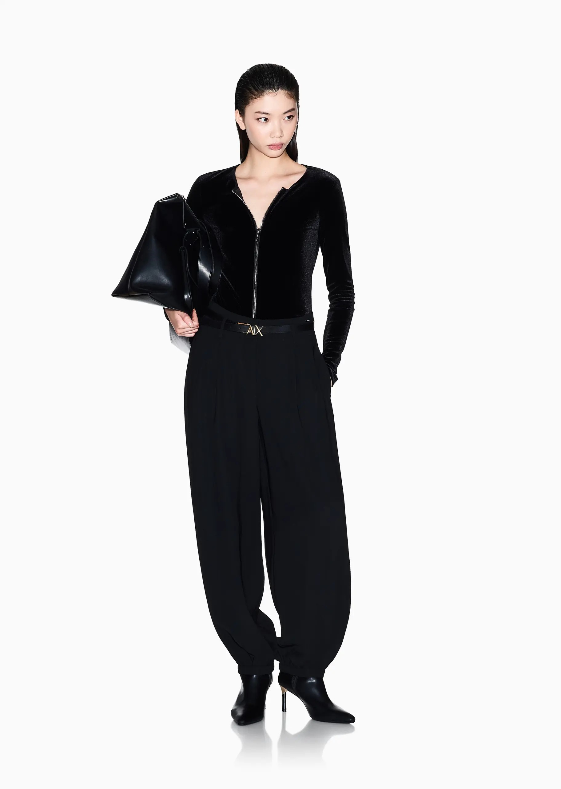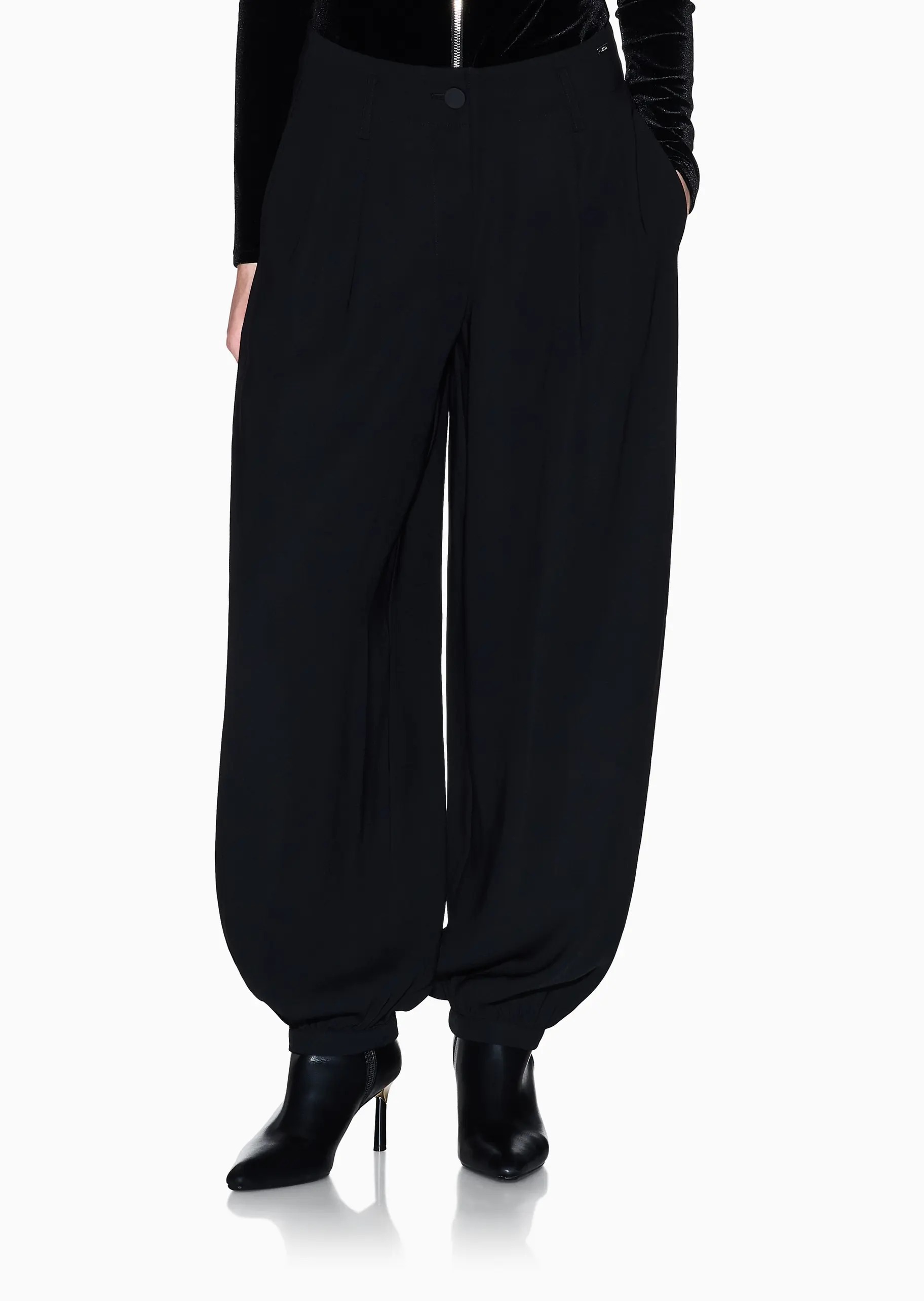 These casual ARMANI EXCHANGE pants are crafted from draped fabric for comfort and easy care. Tapered cuffs create a sleek, flattering silhouette. Paired with a crop top, they flatter your proportions. The metal logo at the waist creates a simple yet elegant look, perfect for everyday wear or a night out.