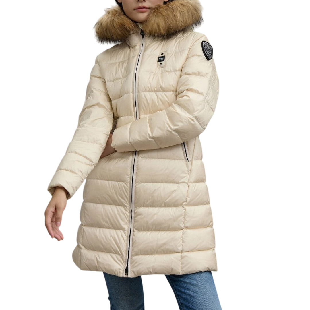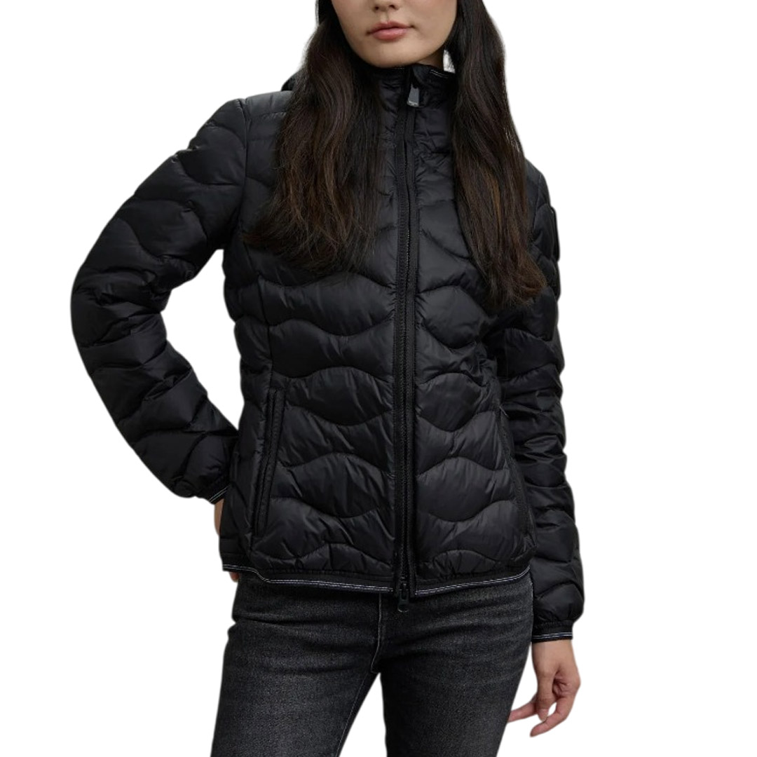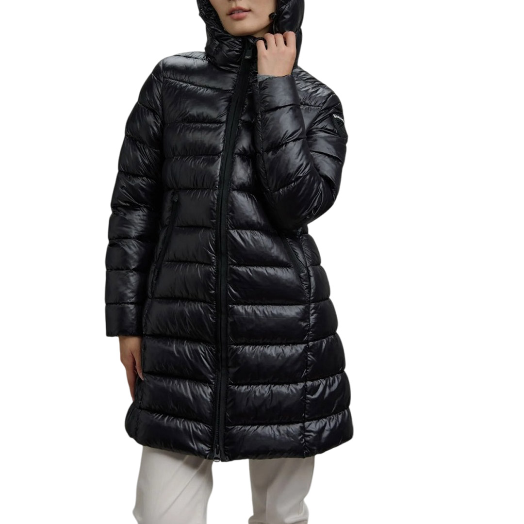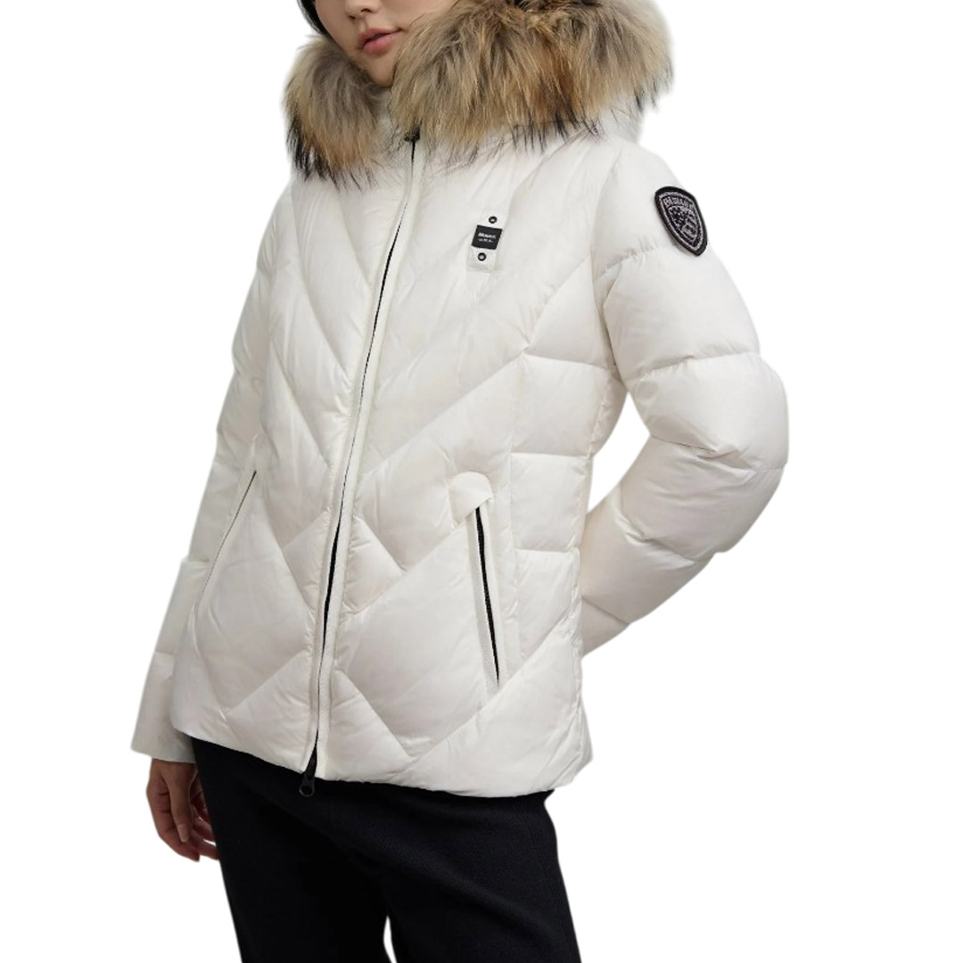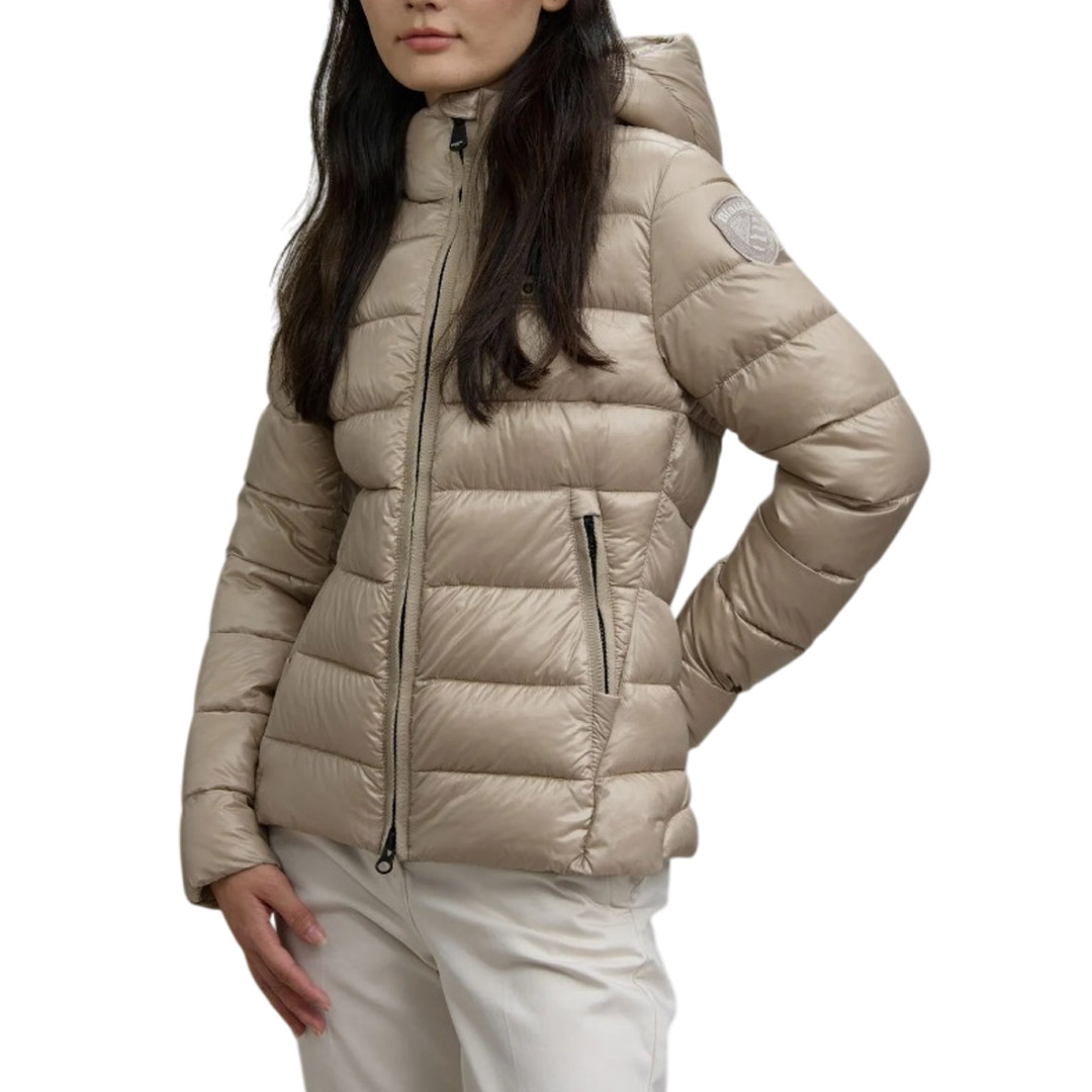 Lightweight unlined jacket with fixed hood, drawstring cord and heat-sealed knot. Central closure with double-slider coated zip and internal zip para. Cape on the shoulders sewn on the sides and with a slit in the center of the back. Two double pockets on the front: one with vertical opening and one with horizontal zip hidden by a flap. Two other pockets with velcro inside. Rounded head and slightly longer in the back. Sleeve bottom with tongue and double snaps for an adjustable closure. Characteristic Blauer loop sewn on the left chest and patch on the sleeve with velcro and Swarovski.