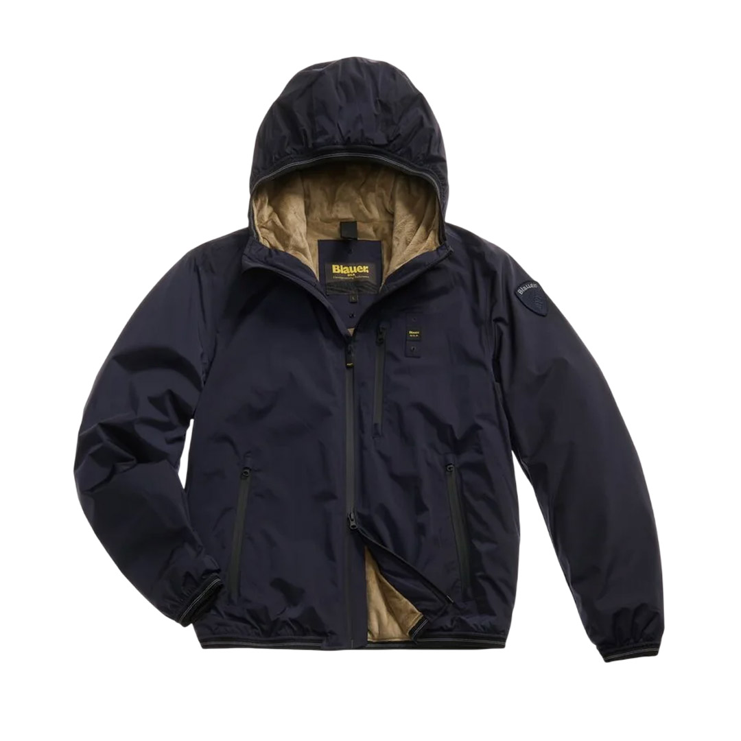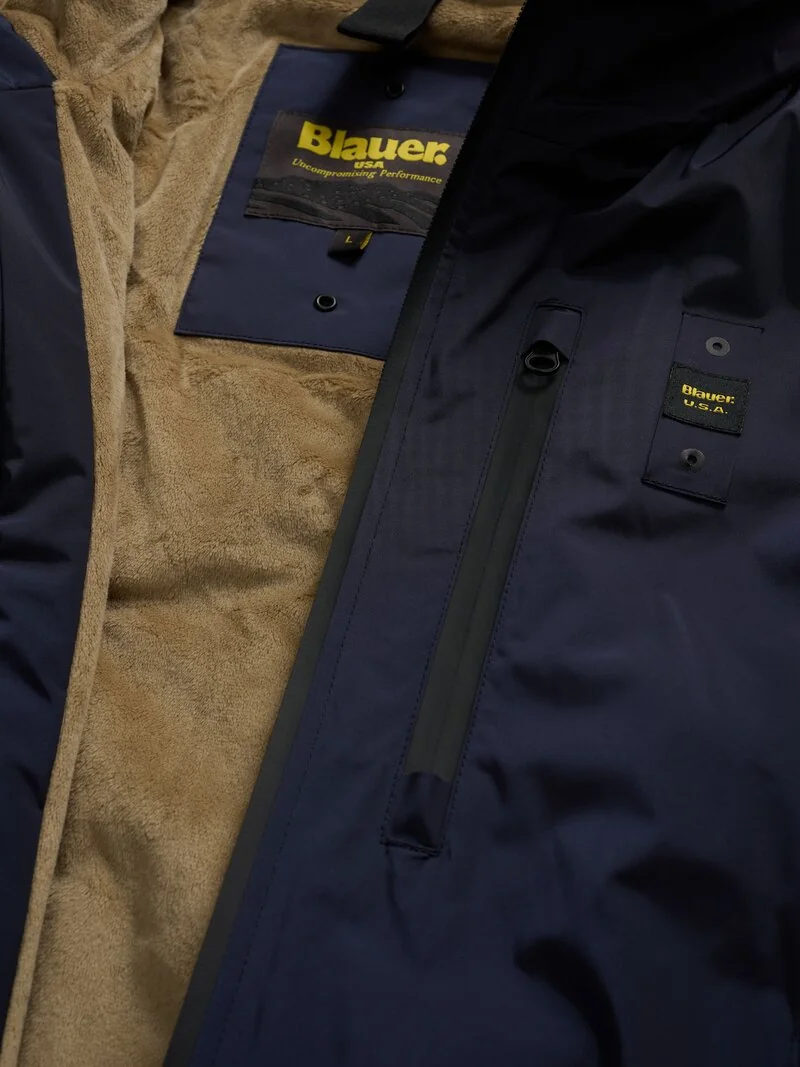 Smooth jacket on the outside but with soft and warm faux fur on the inside. Water-repellent fabric with Thermofix taped internal seams. A garment for those who want to stay pampered even on rainy days. • Fixed hood • Lightweight wadding padding • Faux fur lining on the body • Heat-sealed internal seams • Contrasting coated zip closure • Drawstring cover on the collar • Striped elastic on the edge of the hood, bottom and sleeves • Pockets with coated zip • Internal pockets with Velcro • Logo patch and loop