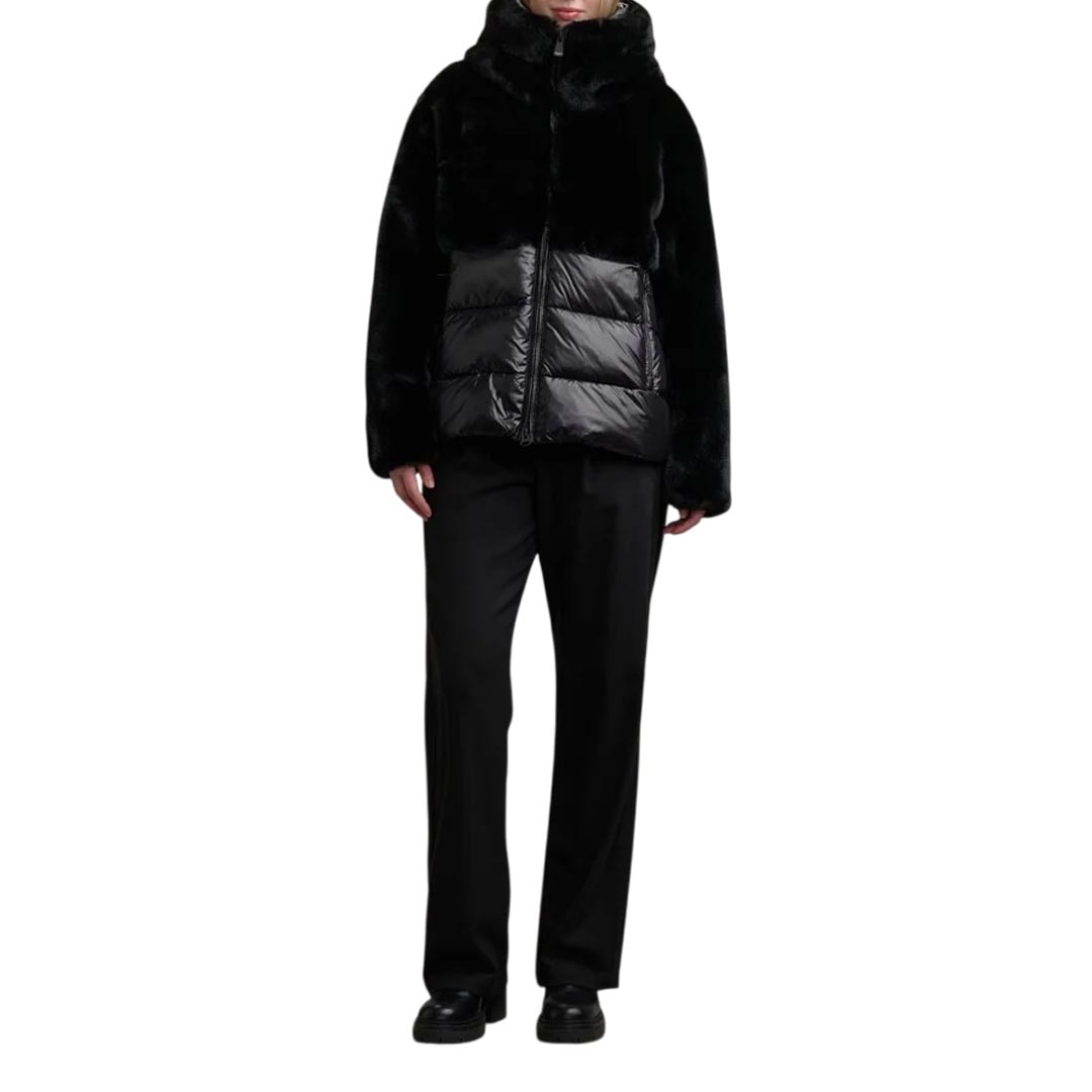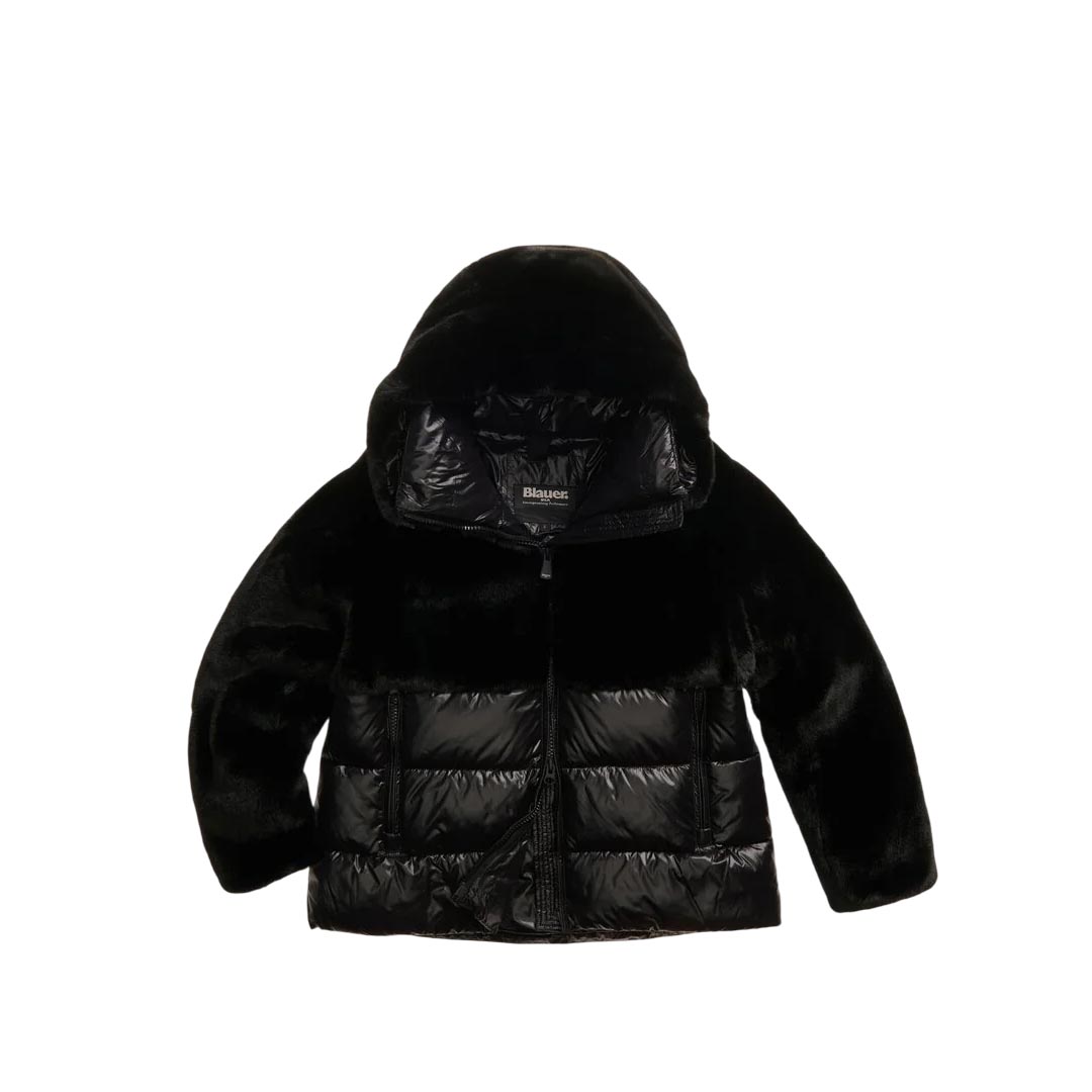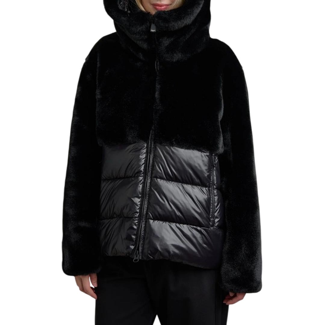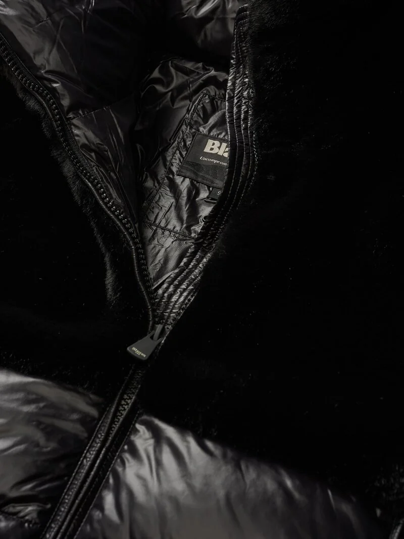 Jacket with faux fur on the upper part and shiny nylon on the lower part. Warm hood and horizontal striped stitching underneath; a garment designed to protect from the harshest winters without sacrificing style. • Fixed faux fur hood with drawstring • Made of nylon and faux fur • Lined in matching shiny nylon • Filled with Sorona® Aura wadding • Zip closure • Pockets with zip and slider cover • Double cuffs with internal elastic • Drawstring at the bottom • Internal pockets with Velcro