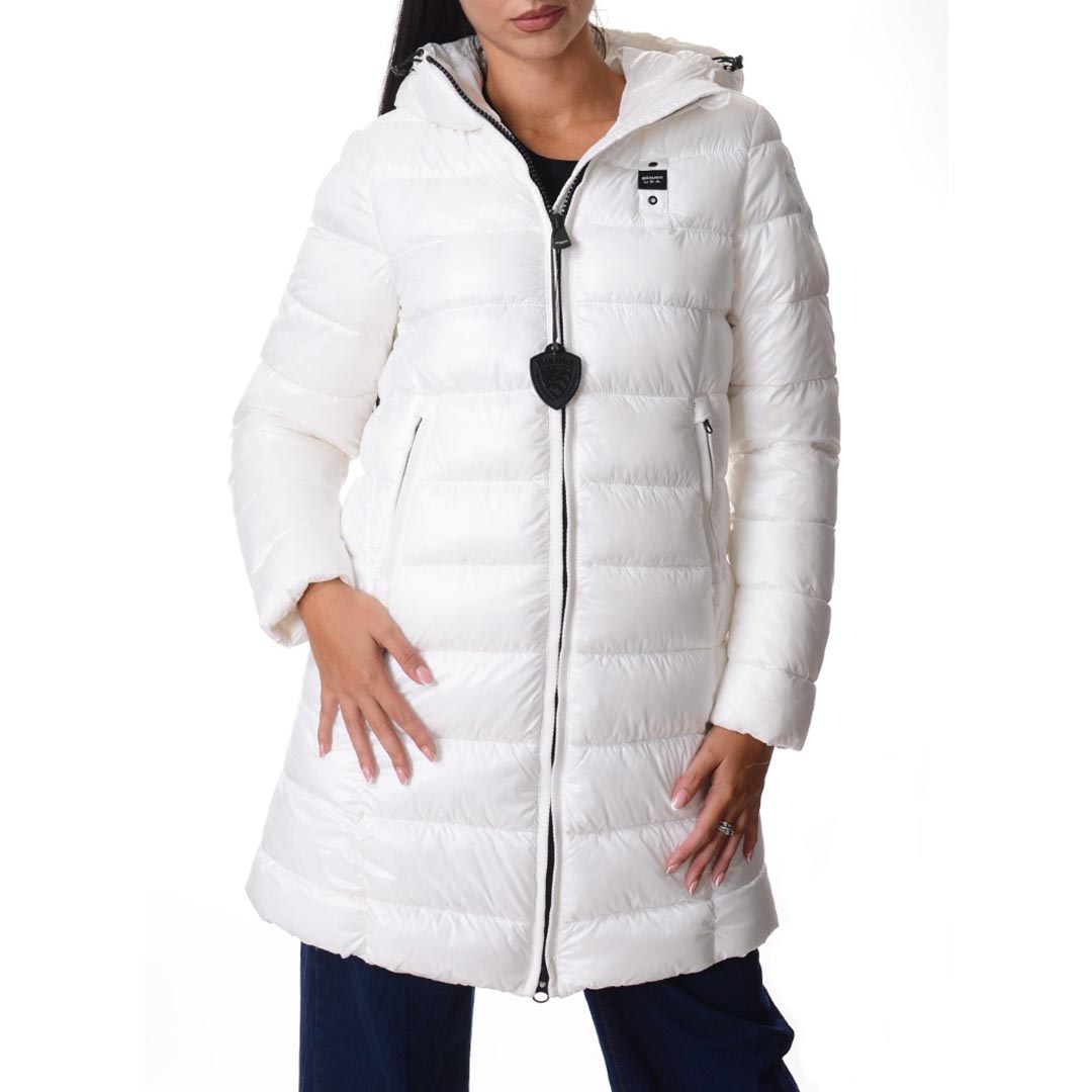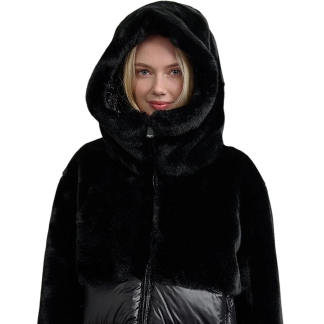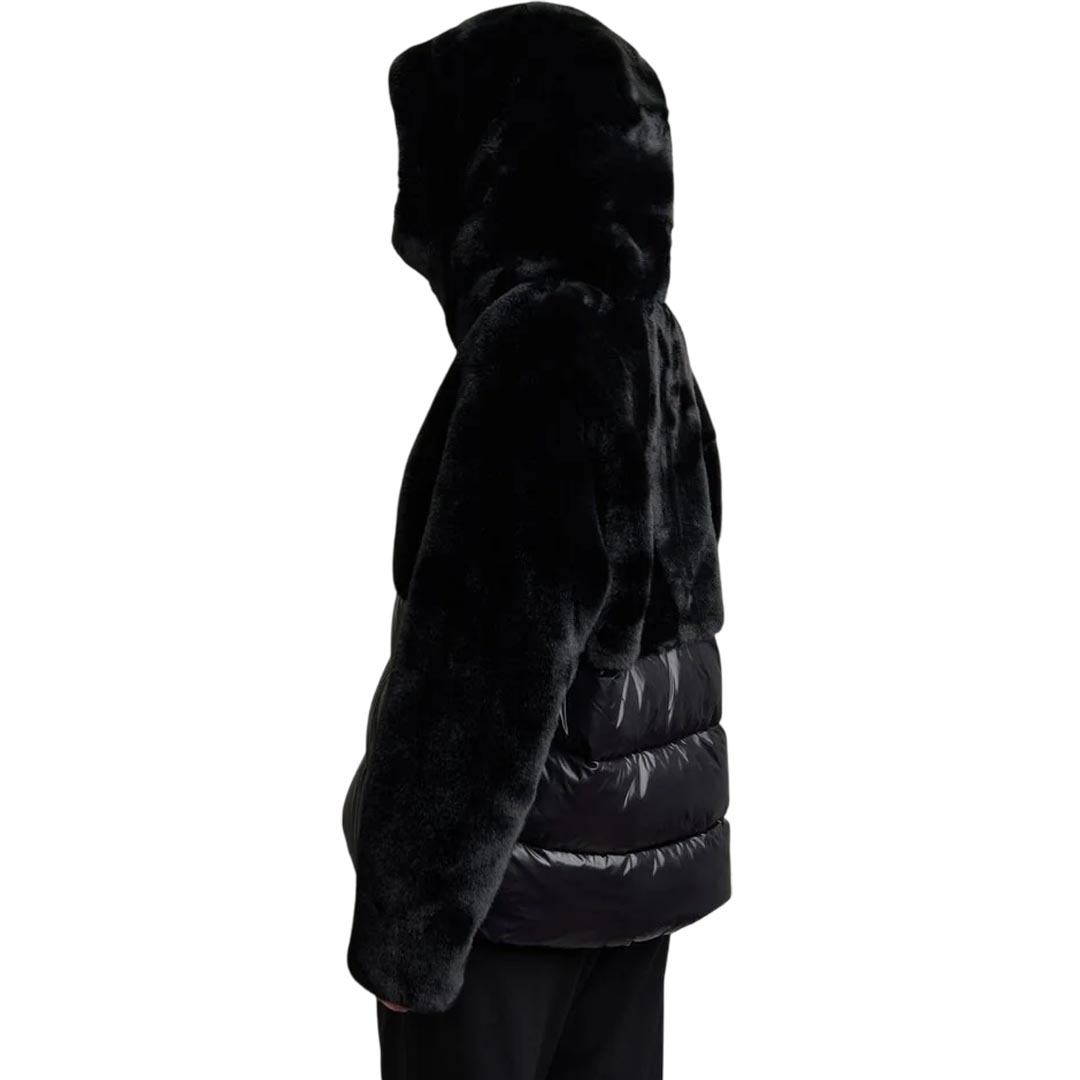 Jacket with faux fur on the upper part and shiny nylon on the lower part. Warm hood and horizontal striped stitching underneath; a garment designed to protect from the harshest winters without sacrificing style. • Fixed faux fur hood with drawstring • Made of nylon and faux fur • Lined in matching shiny nylon • Filled with Sorona® Aura wadding • Zip closure • Pockets with zip and slider cover • Double cuffs with internal elastic • Drawstring at the bottom • Internal pockets with Velcro