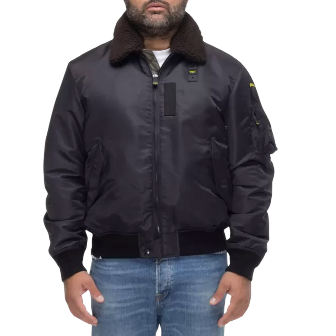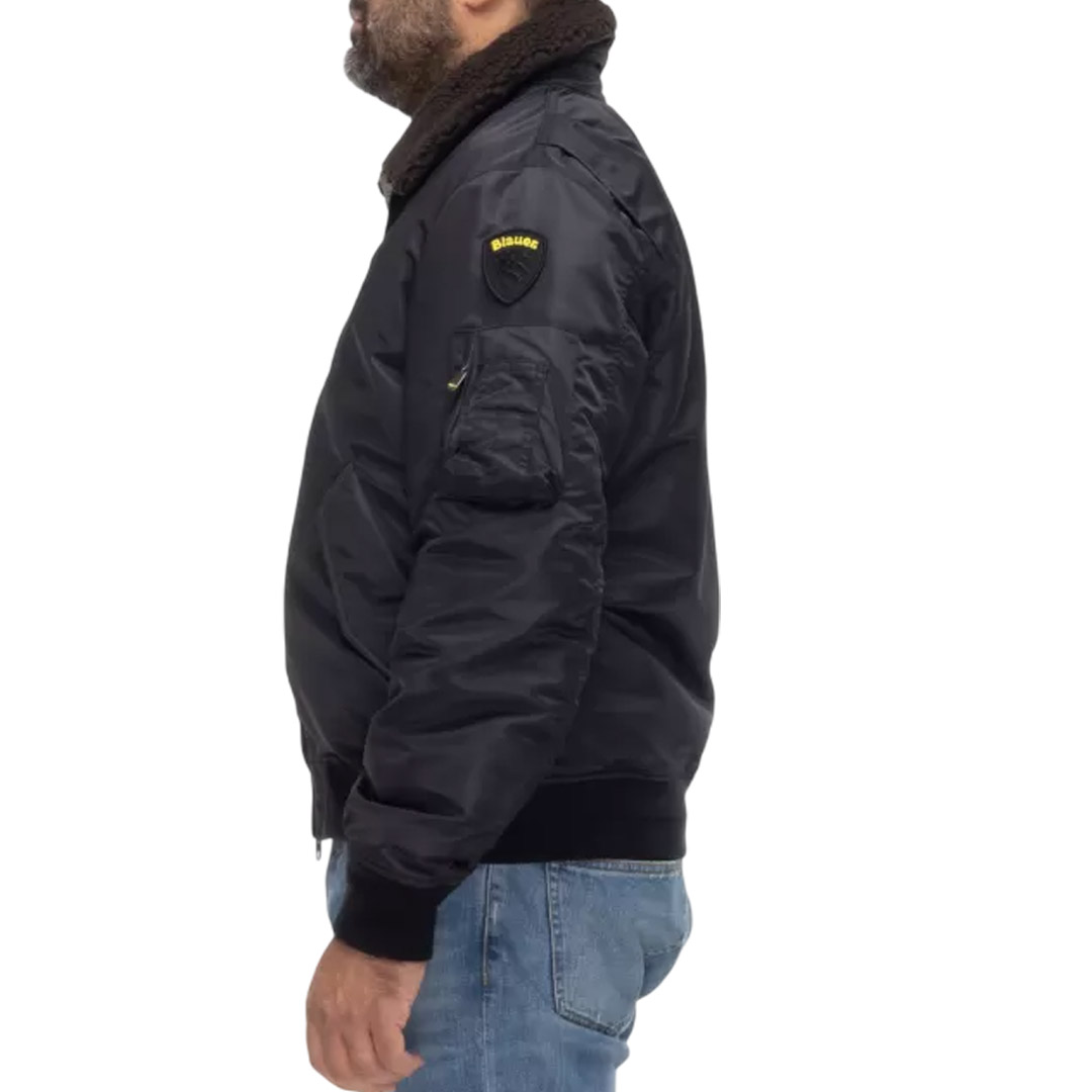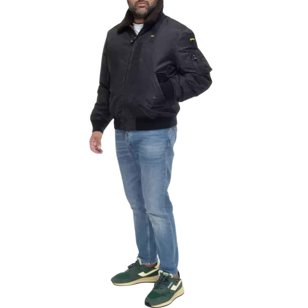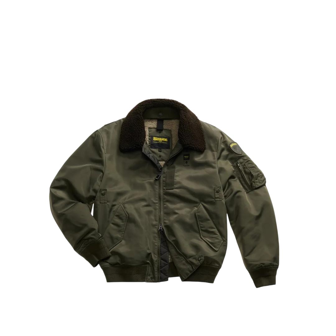 Water-repellent bomber jacket with eco-friendly padding. A classic and contemporary piece that combines military style with urban style. Removable faux sheepskin collar. • Faux fur collar • Sorona® Aura wadding filling • Zip closure • Snap pockets • Zippered left sleeve pocket with pen holder • Matching ribbing on the bottom and cuffs • Inside snap pockets • Logo patch and loop