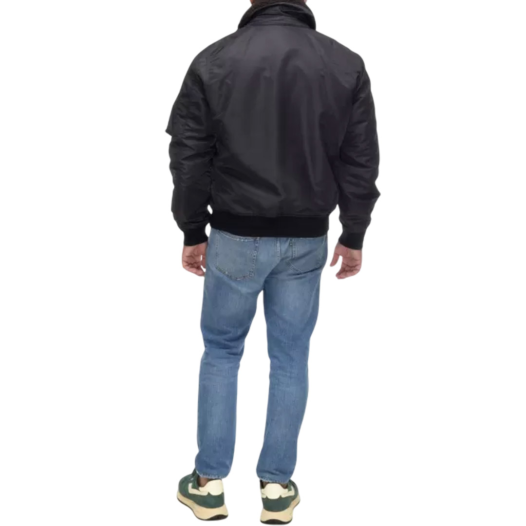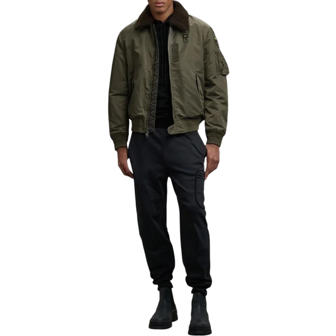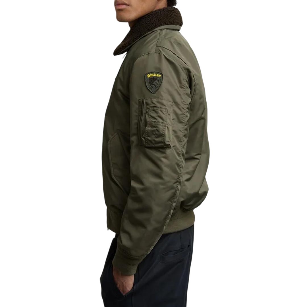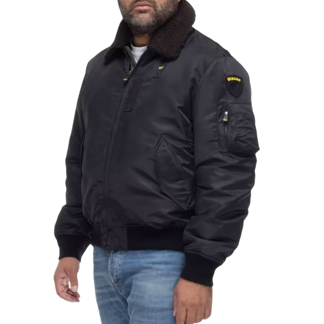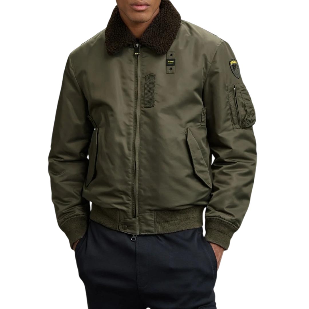 Water-repellent bomber jacket with eco-friendly padding. A classic and contemporary piece that combines military style with urban style. Removable faux sheepskin collar. • Faux fur collar • Sorona® Aura wadding filling • Zip closure • Snap pockets • Zippered left sleeve pocket with pen holder • Matching ribbing on the bottom and cuffs • Inside snap pockets • Logo patch and loop