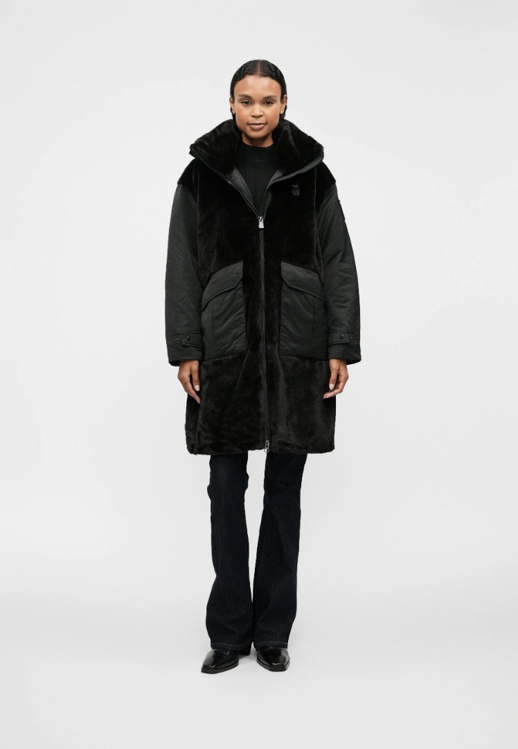 Monochromatic down jacket in nylon with horizontal wave stitching and fixed hood. Striped elastic tape in contrasting color on the edge of the hood, on the bottom of the garment and on the cuffs of the sleeves. Central closure with double-slider zip, internal zip guard, tonal herringbone tape profile and slider cover on the neck. Two front pockets with vertical zip hidden by herringbone tape to match the jacket. Characteristic Blauer loop sewn on the left chest and patch on the sleeve with velcro and Swarovski.