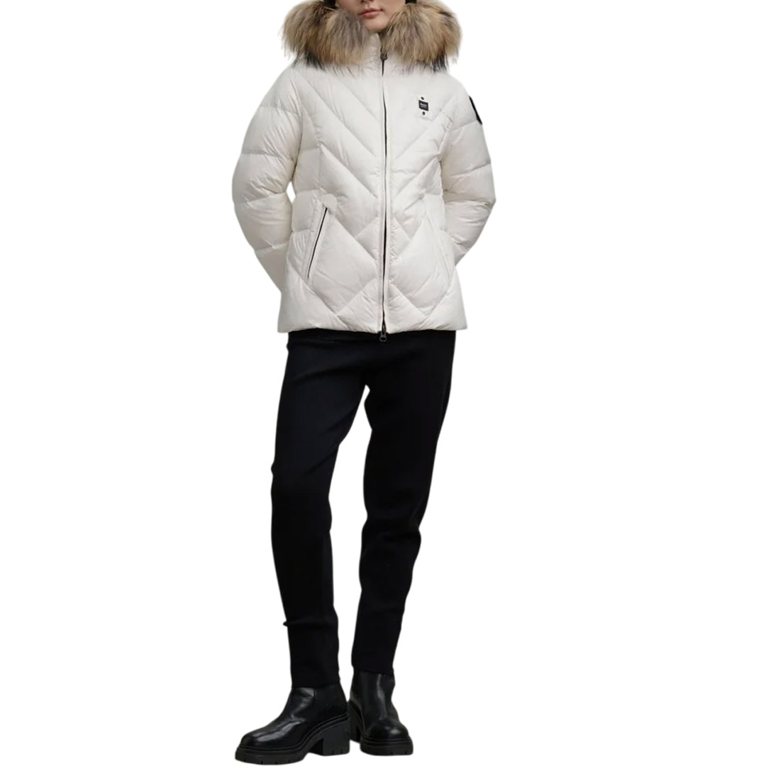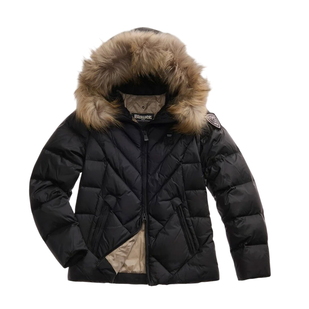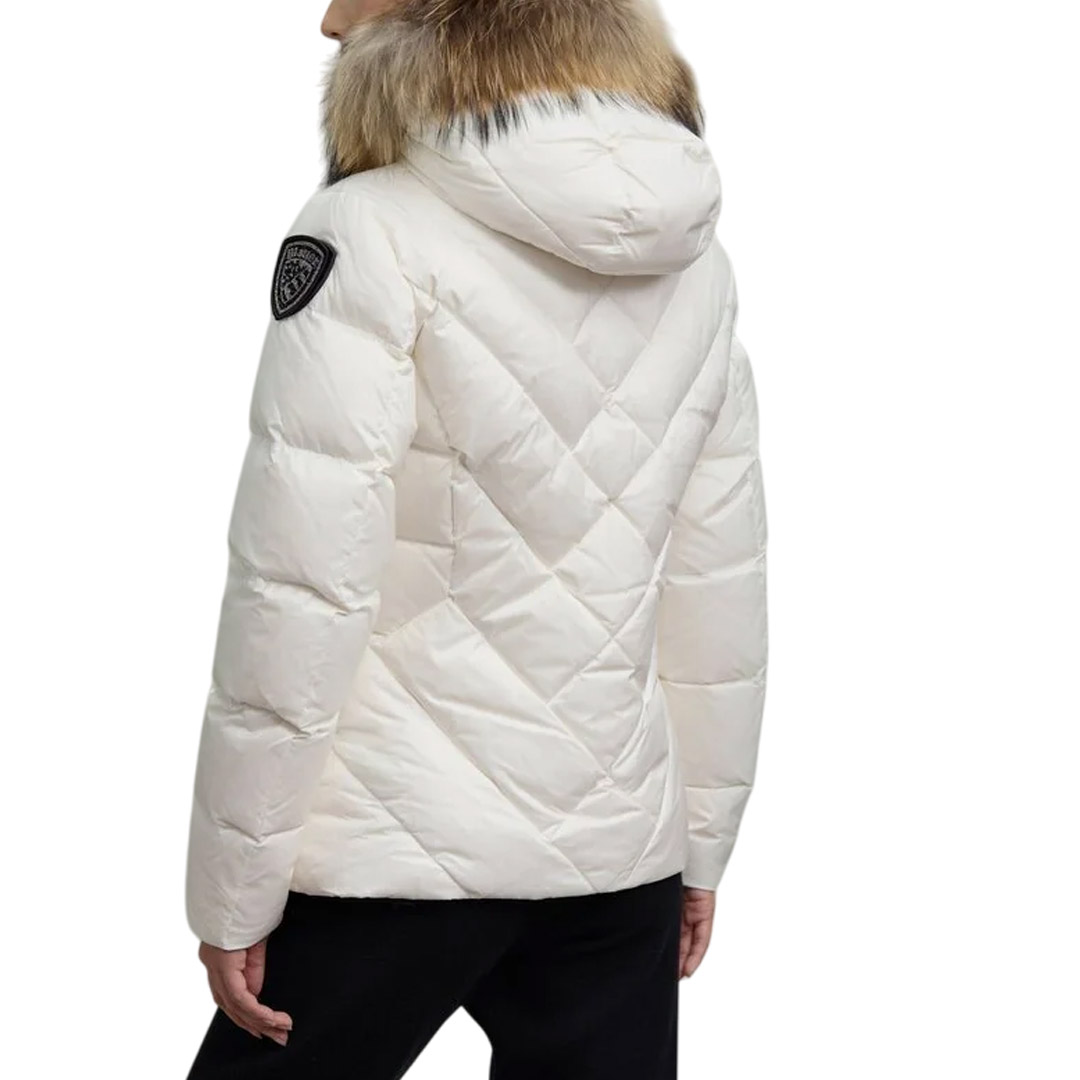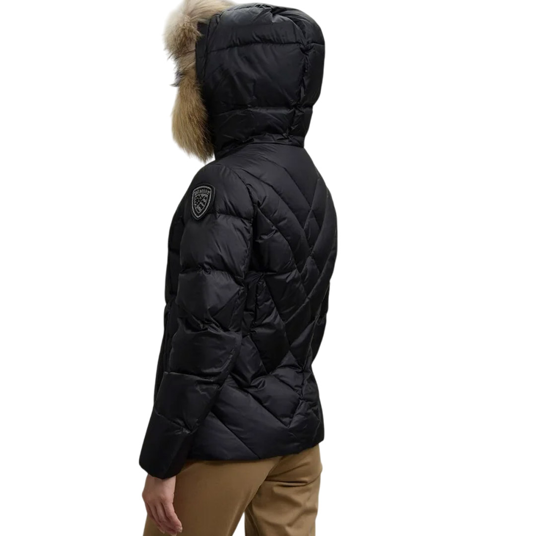Water-repellent quilted down jacket with geometric lines. Fitted down jacket to accentuate the waist. • Fixed hood • Removable real fur trim • Made of shiny nylon • Lined in contrasting nylon • Filled with 90/10 255g down • Concealed zip fastening • Zip pockets • Internal pockets with Velcro and zip • Drawstring at the bottom • Glitter patch and logo loop