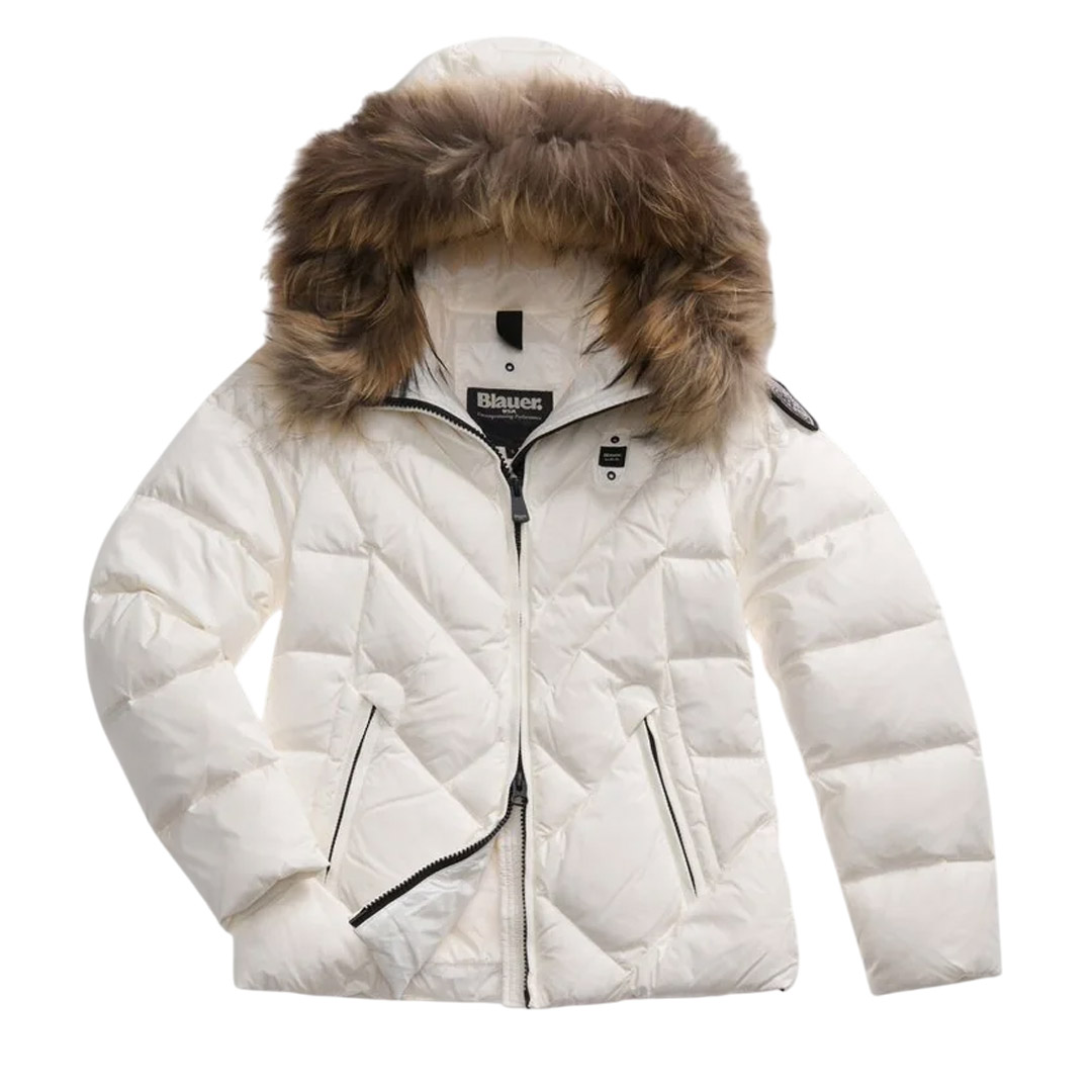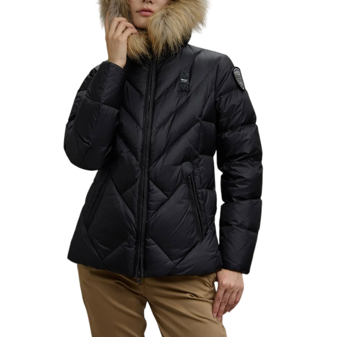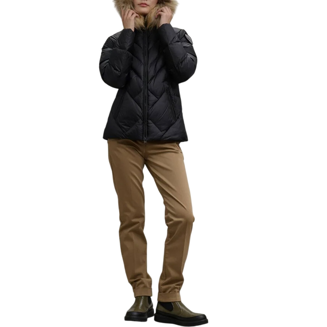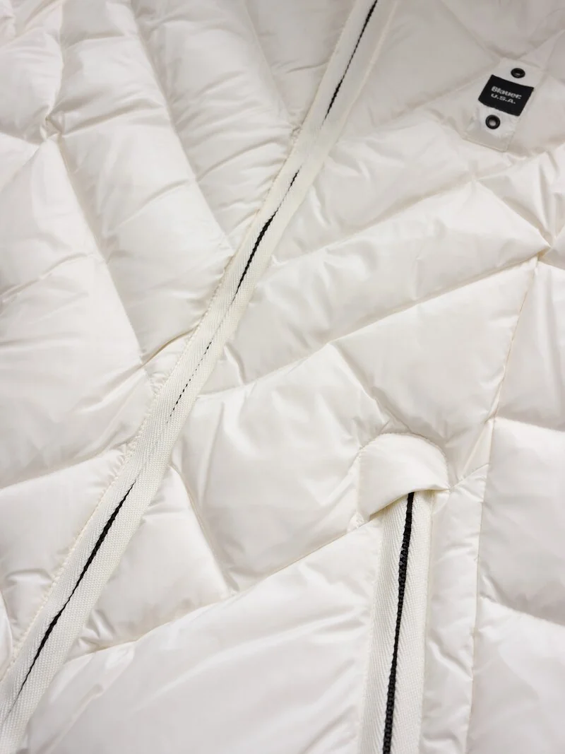 Water-repellent quilted down jacket with geometric lines. Fitted down jacket to accentuate the waist. • Fixed hood • Removable real fur trim • Made of shiny nylon • Lined in contrasting nylon • Filled with 90/10 255g down • Concealed zip fastening • Zip pockets • Internal pockets with Velcro and zip • Drawstring at the bottom • Glitter patch and logo loop