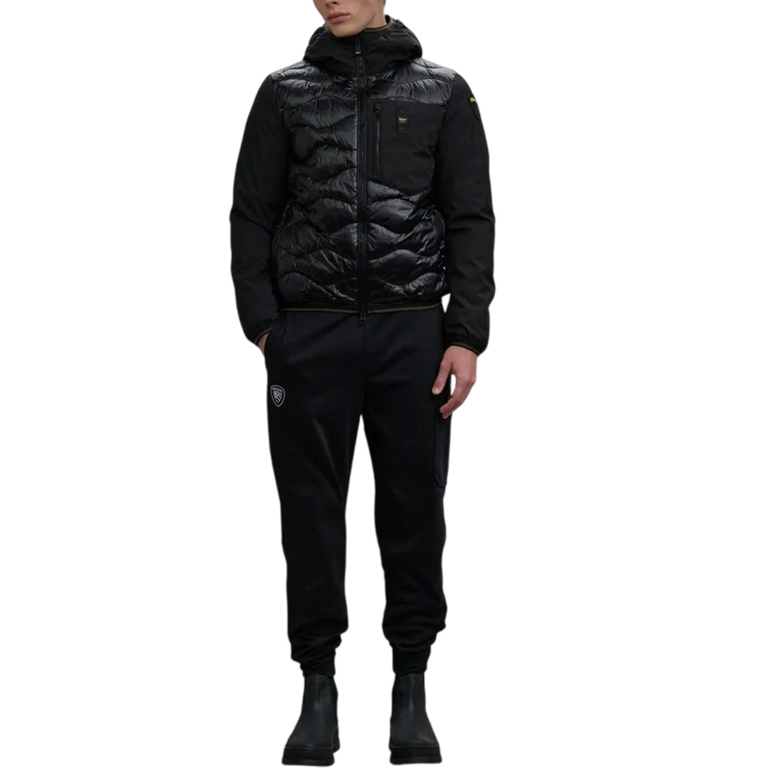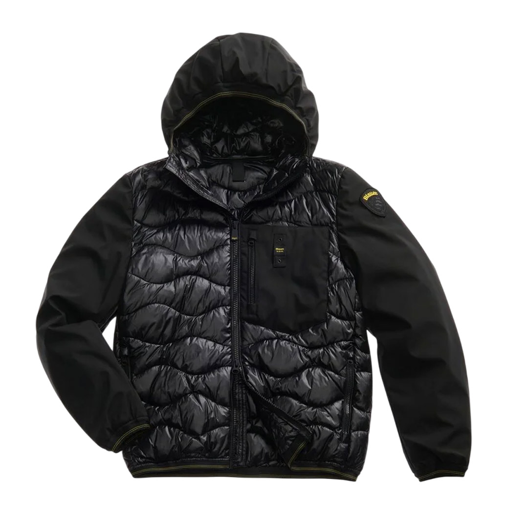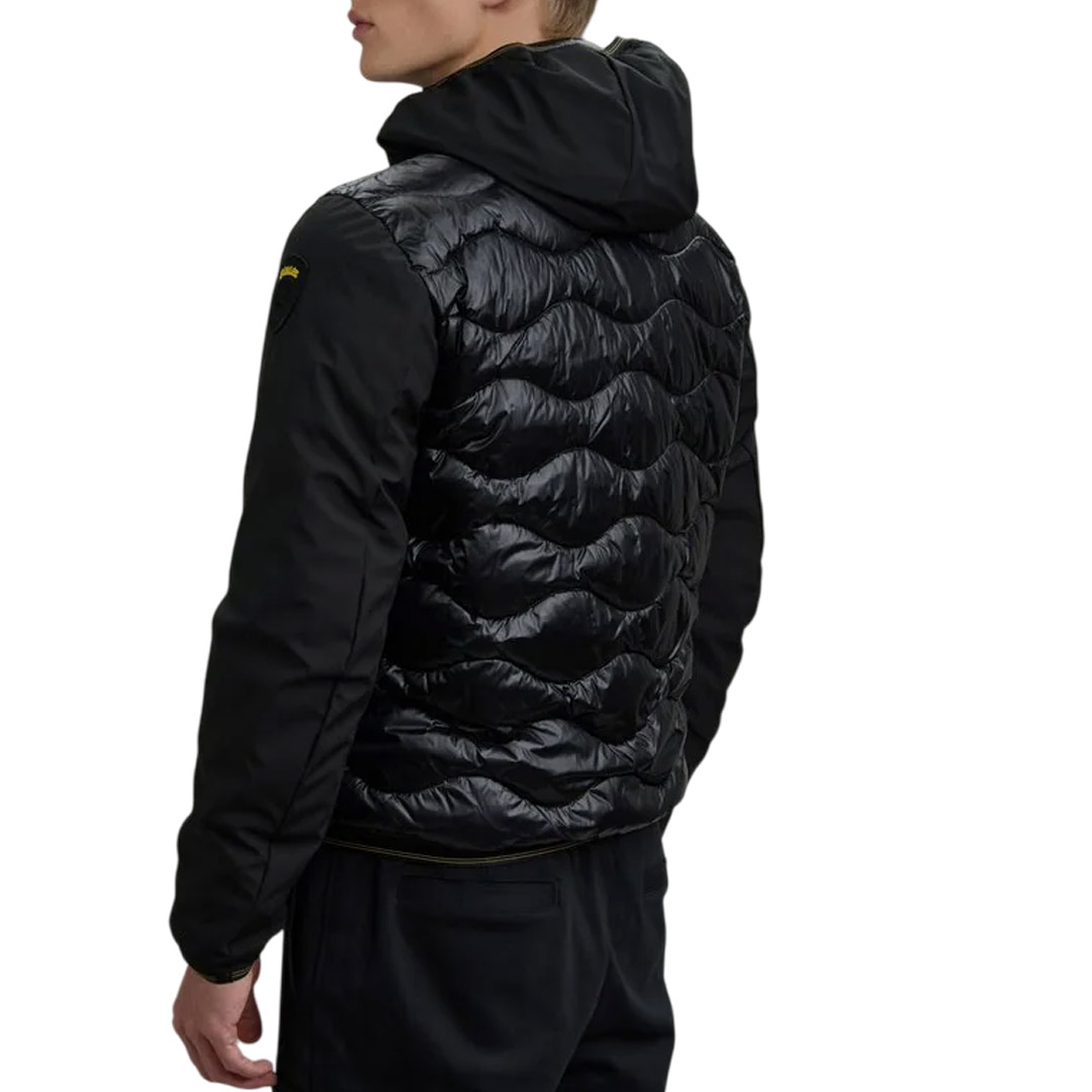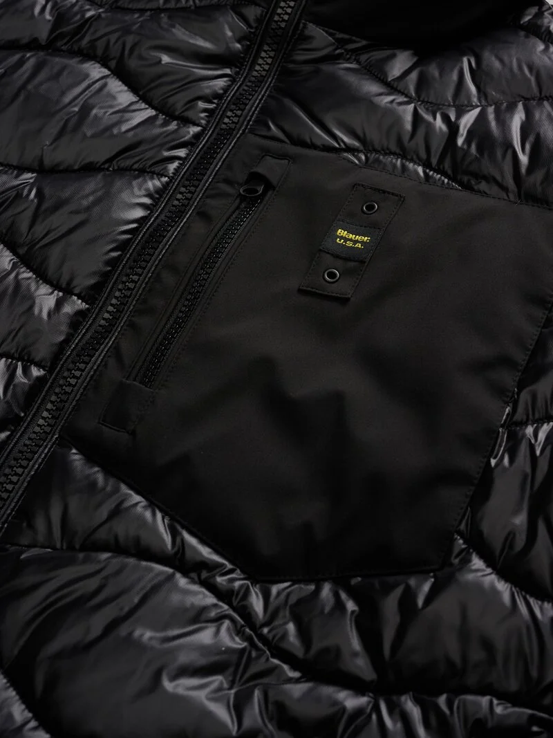 Monochrome down jacket in lightweight, smooth neoprene on the sleeves and shiny nylon with wave stitching on the body. Mixed padding for warmth even in adverse weather conditions. • Fixed hood • Matching lining • 50% polyester and 50% feather padding • Zip closure • Slider cover on the collar • Zip pockets • Zip pocket on the chest • Striped elastic on the hood profile, cuff and hem. • Internal pockets with Velcro • Logo patch and loop