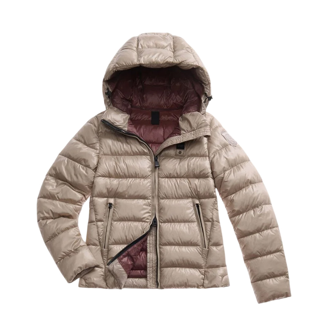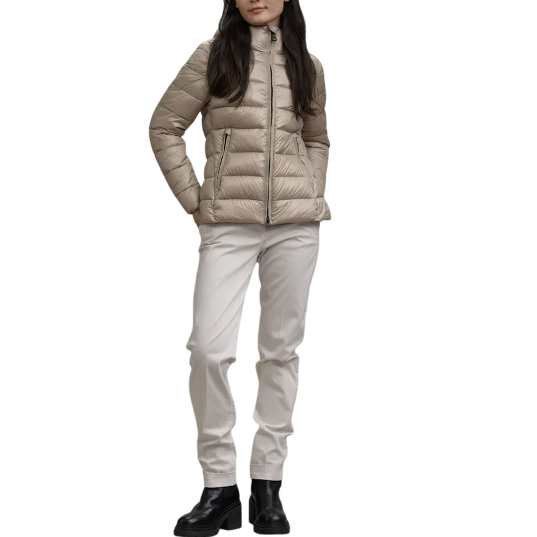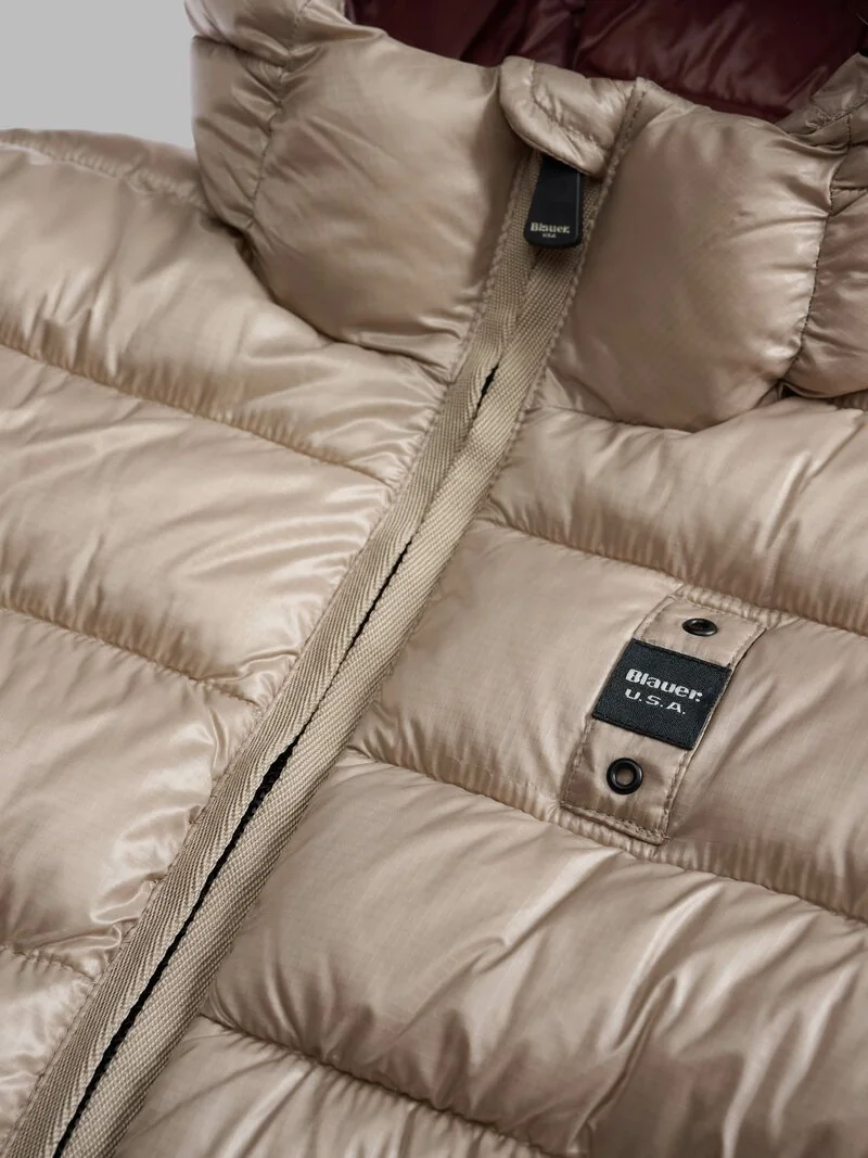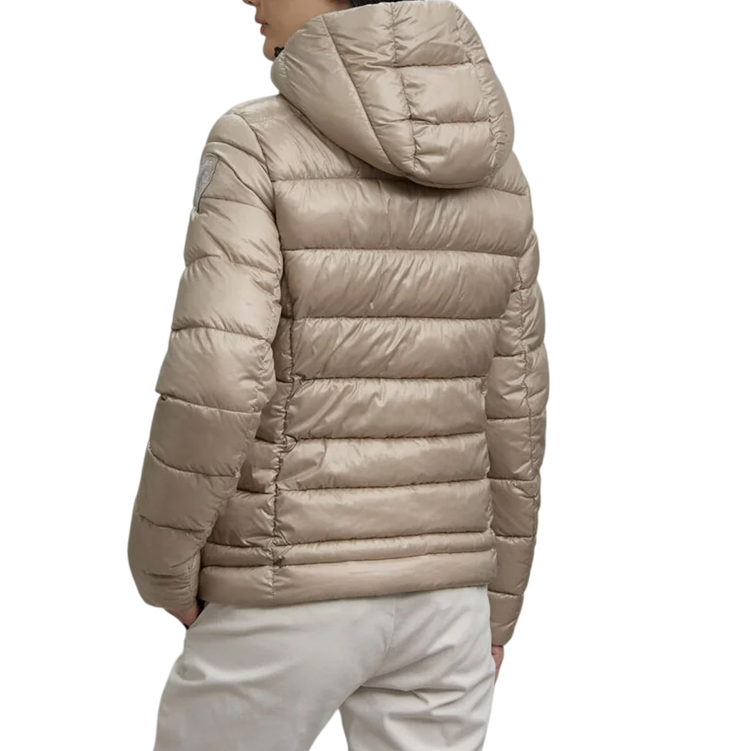 Winter jacket in water-repellent micro-rip nylon. Sustainable padding, slim-fit effect in trendy colors. • Fixed hood with drawstring • Made of micro-rip nylon with a light check pattern • Lined in contrasting nylon • Filled with Sorona® Aura wadding • Hidden zip fastening • Slider cover on the collar • Zipped pockets with slider cover • Drawstring at the bottom • Internal pockets, one with zip and the other with Velcro • Logo patch and loop
