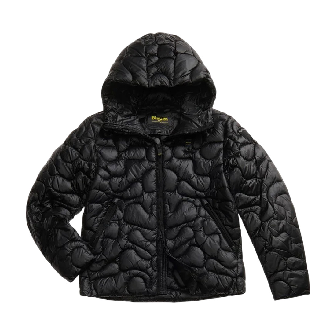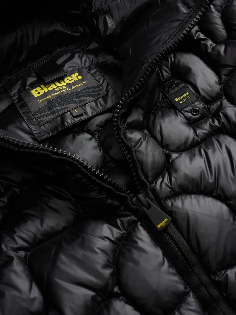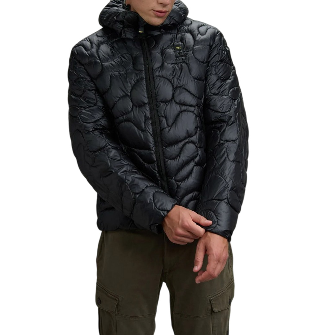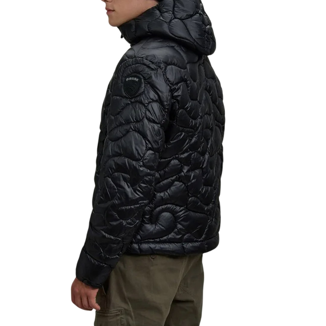 Synthetic padding jacket with scattered wave stitching reminiscent of a camouflage print. The modern design makes this garment shiny and innovative. • Fixed hood with drawstring • Zip closure • Made and lined in nylon • Filled with Sorona® Aura wadding • Zipped pockets • Internal pockets with Velcro • Drawstring at the bottom • Velcro patch and logo loop