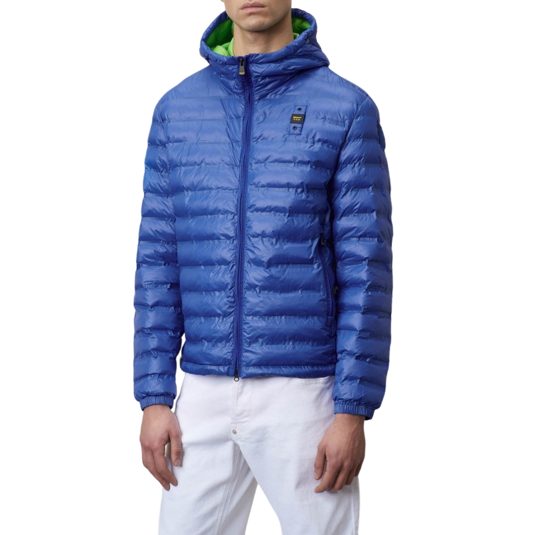 Packable nylon down jacket with light stitching, horizontal striped taped seams and fixed hood. Lightweight and eco-friendly Repreve padding made from recycled plastic bottles for eco-sustainable use. Center front closure with zip, internal zip guard and matching ribbon that hides the zip. Two front pockets with zip hidden by matching tape. Two internal open pockets with additional internal patch pocket and velcro closure. Internal lining in contrasting color with horizontal striped taping. Sleeve bottom with elastic in the cuff. Drawstring with elastic tubing on the edge of the hood and on the bottom of the garment. Characteristic Blauer loop sewn on the left chest and Blauer shield patch sewn on the Regular Fit sleeve