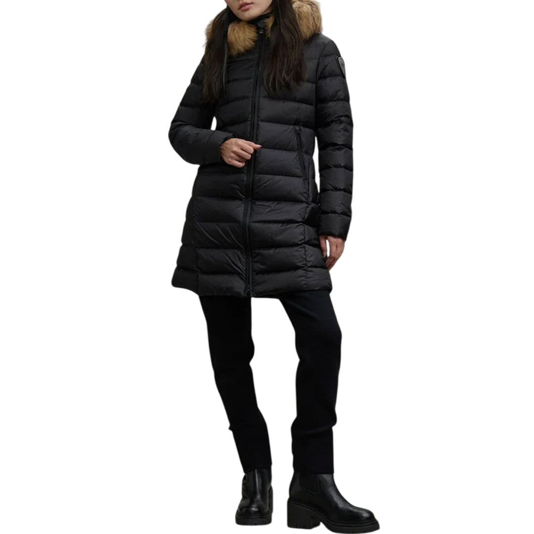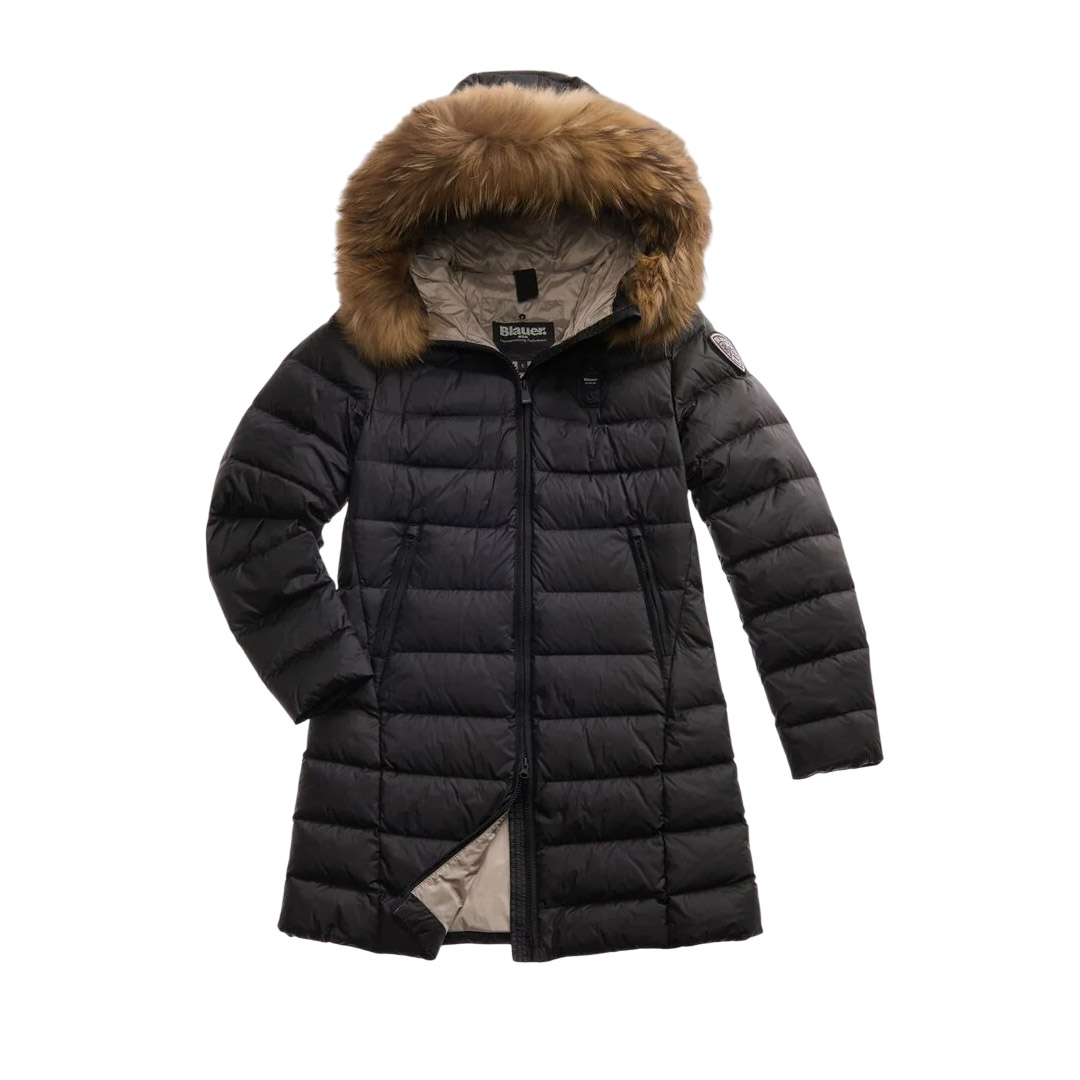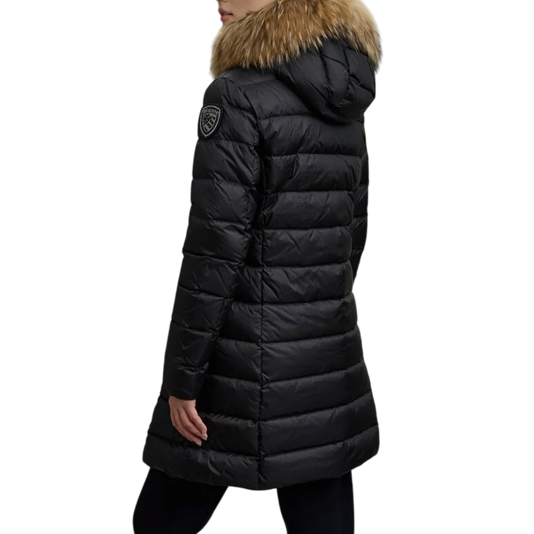 Long, shiny, quilted down jacket with horizontal stripes and a fixed hood, removable fur trim, and contrasting-color lining. This women's item features fashionable colors and a cut that accentuates the waist. • Fixed hood • Removable genuine raccoon fur • Contrasting-color lining • 90/10 down filling (215g) • Hidden zip closure • Collar slider cover • Zip pockets • Internal pockets with Velcro and zip • Glitter patch and logo loop
