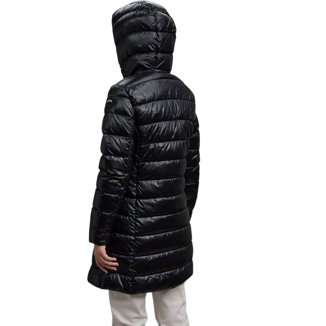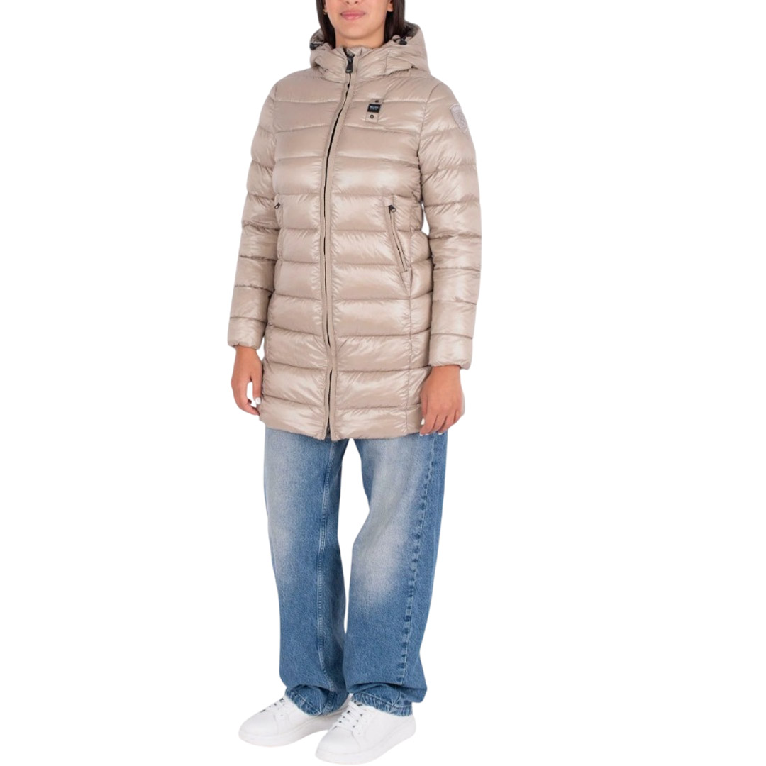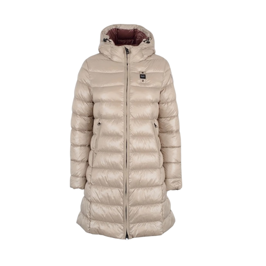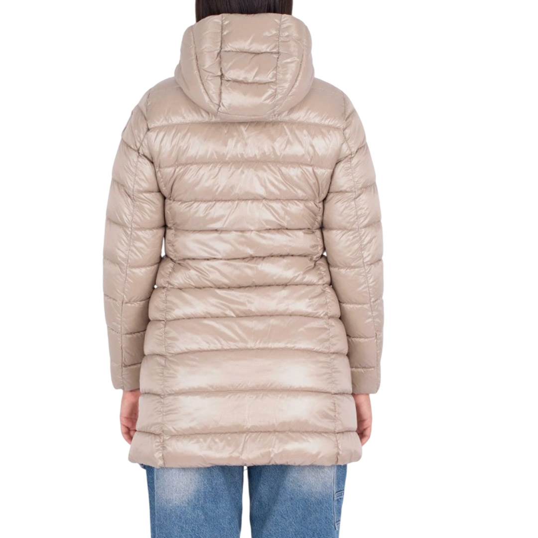 Long winter jacket in micro-rip nylon with a hood stitched with horizontal lines. This piece features eco-friendly padding, trendy colors, and a slim fit. • Fixed hood with drawstring • Fabric with a light check pattern • Contrasting lining • Filled with Sorona® Aura wadding • Hidden zip fastening • Collar slider cover • Pockets with hidden zip and slider cover • One internal pocket with zip and one with Velcro • Logo patch and loop