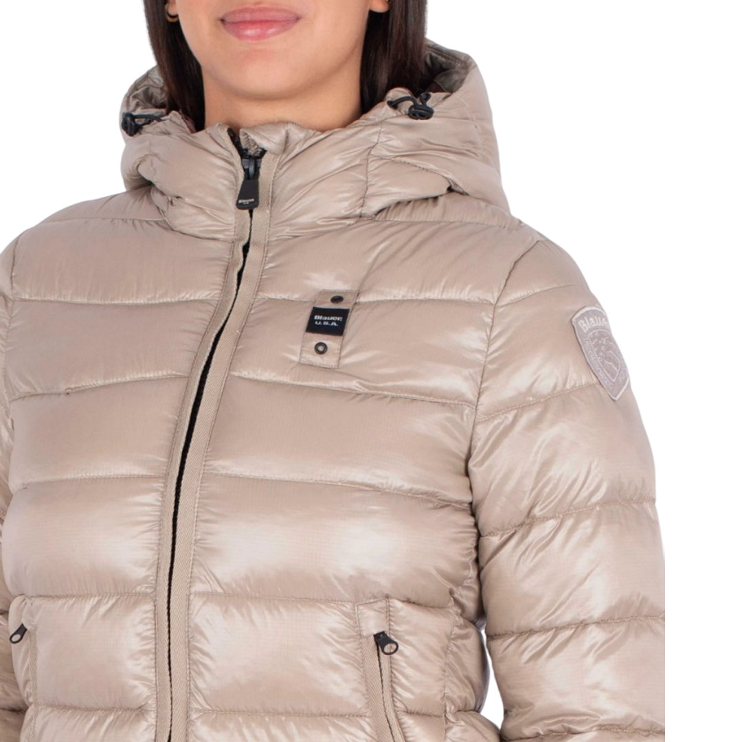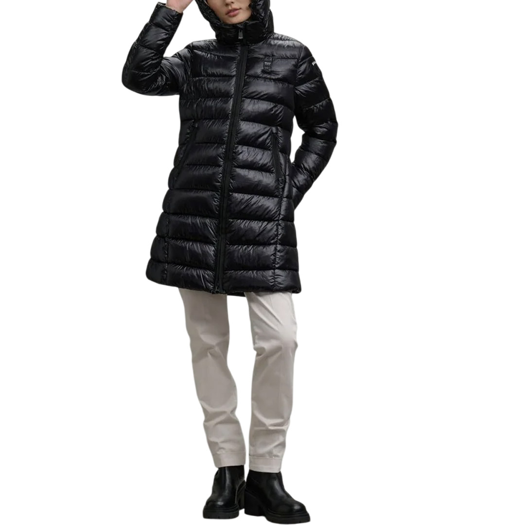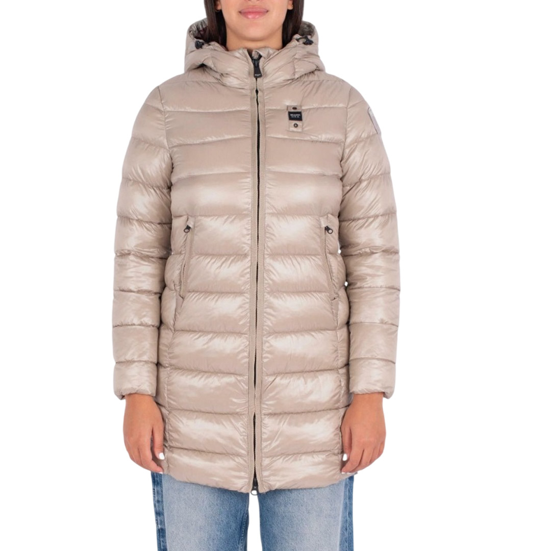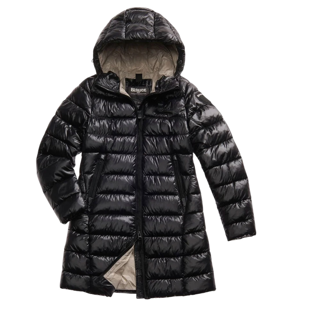 Long winter jacket in micro-rip nylon with a hood stitched with horizontal lines. This piece features eco-friendly padding, trendy colors, and a slim fit. • Fixed hood with drawstring • Fabric with a light check pattern • Contrasting lining • Filled with Sorona® Aura wadding • Hidden zip fastening • Collar slider cover • Pockets with hidden zip and slider cover • One internal pocket with zip and one with Velcro • Logo patch and loop