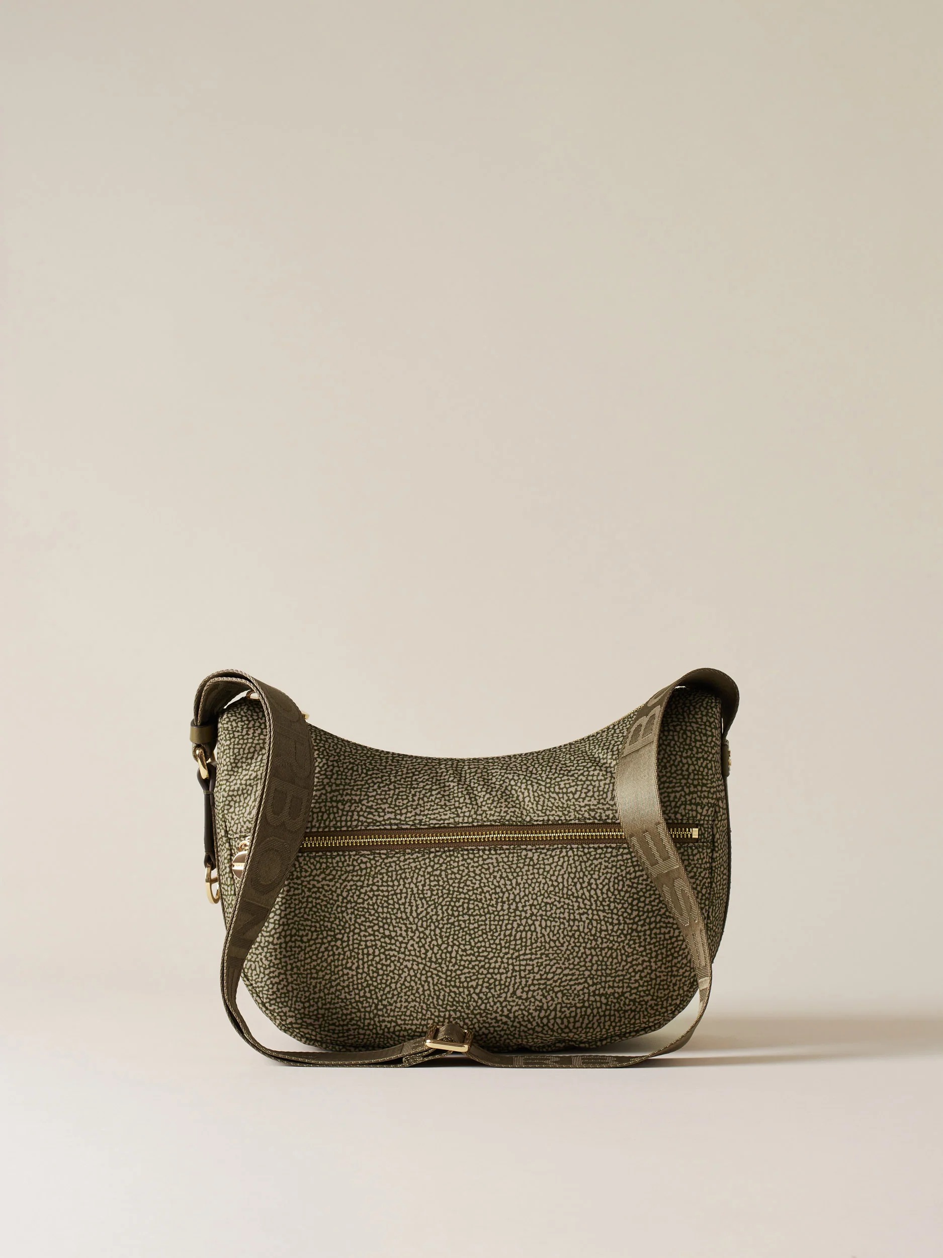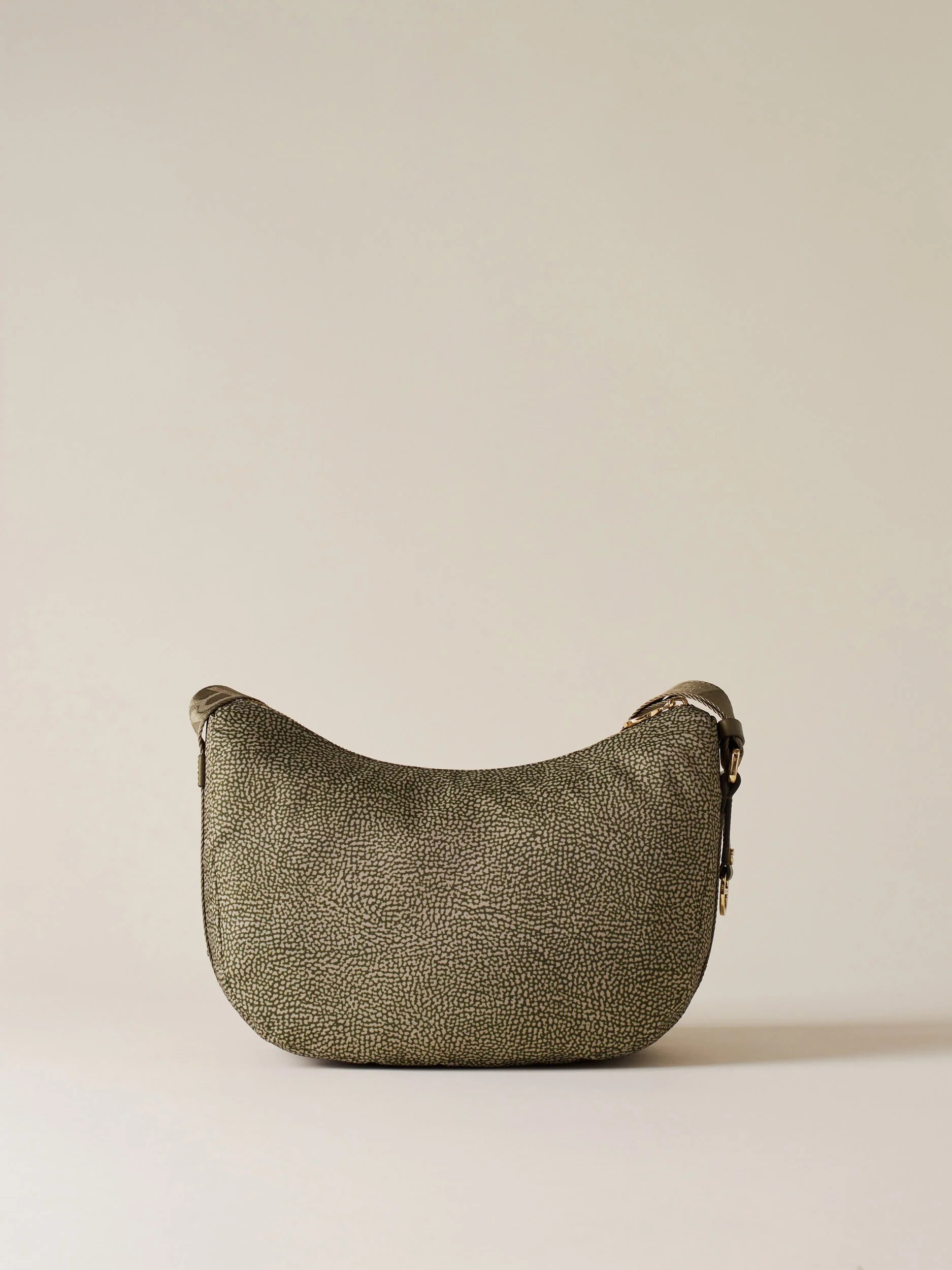 Recycled fabric with Op print Leather details Zip fastening External pocket with zip Screw-shaped zip puller, symbol of the brand Adjustable shoulder strap with logoed ribbon Lined interior Three internal pockets, one of which with zip Light gold metal details Shoulder strap measurements: Min 35 cm Max 67 cm Small size Width 11 cm Height 24 cm Depth 28 cm