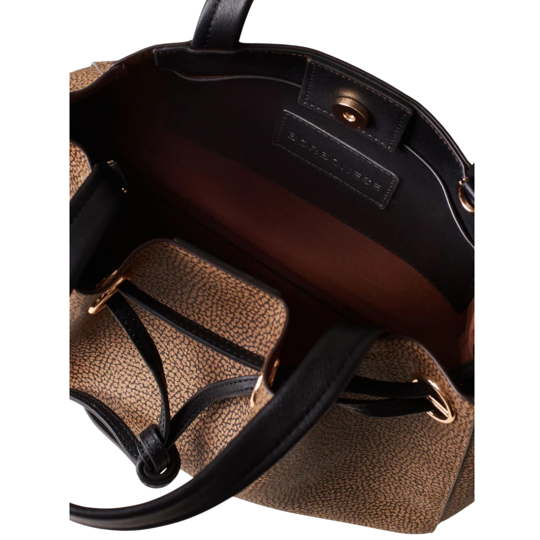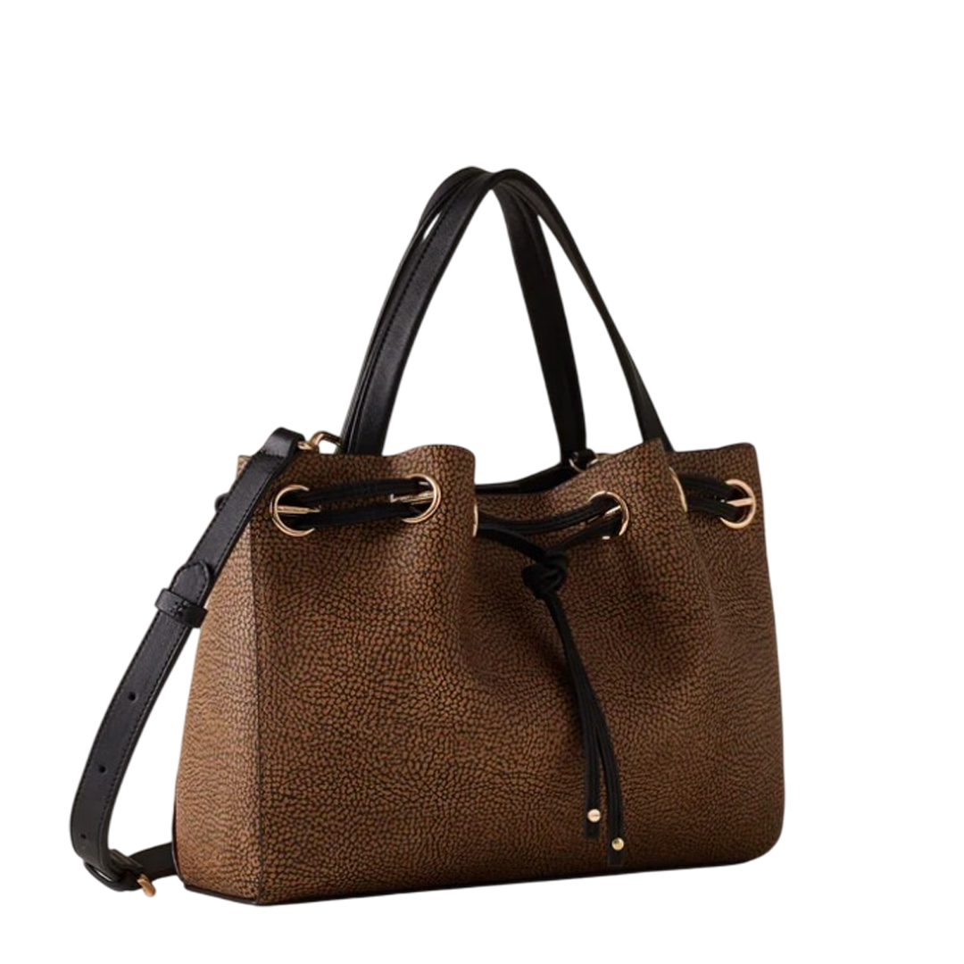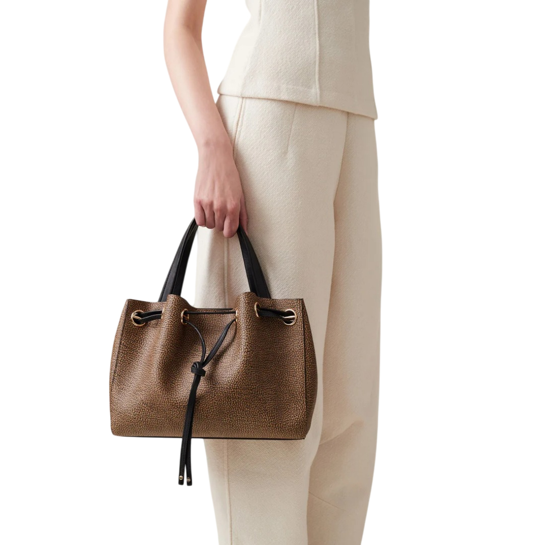 The vine, the iconic symbol of Borbonese, is the protagonist of the Marèe line, where the bags are enriched with soft folds created by a drawstring effect. OP coated canvas Calfskin details Double handle Leather drawstring and metal rings Magnetic closure Adjustable and removable leather shoulder strap Suede-effect fabric lining Interior with open pocket Light Gold hardware Medium size Dimensions (cm): 10x30.5x23
