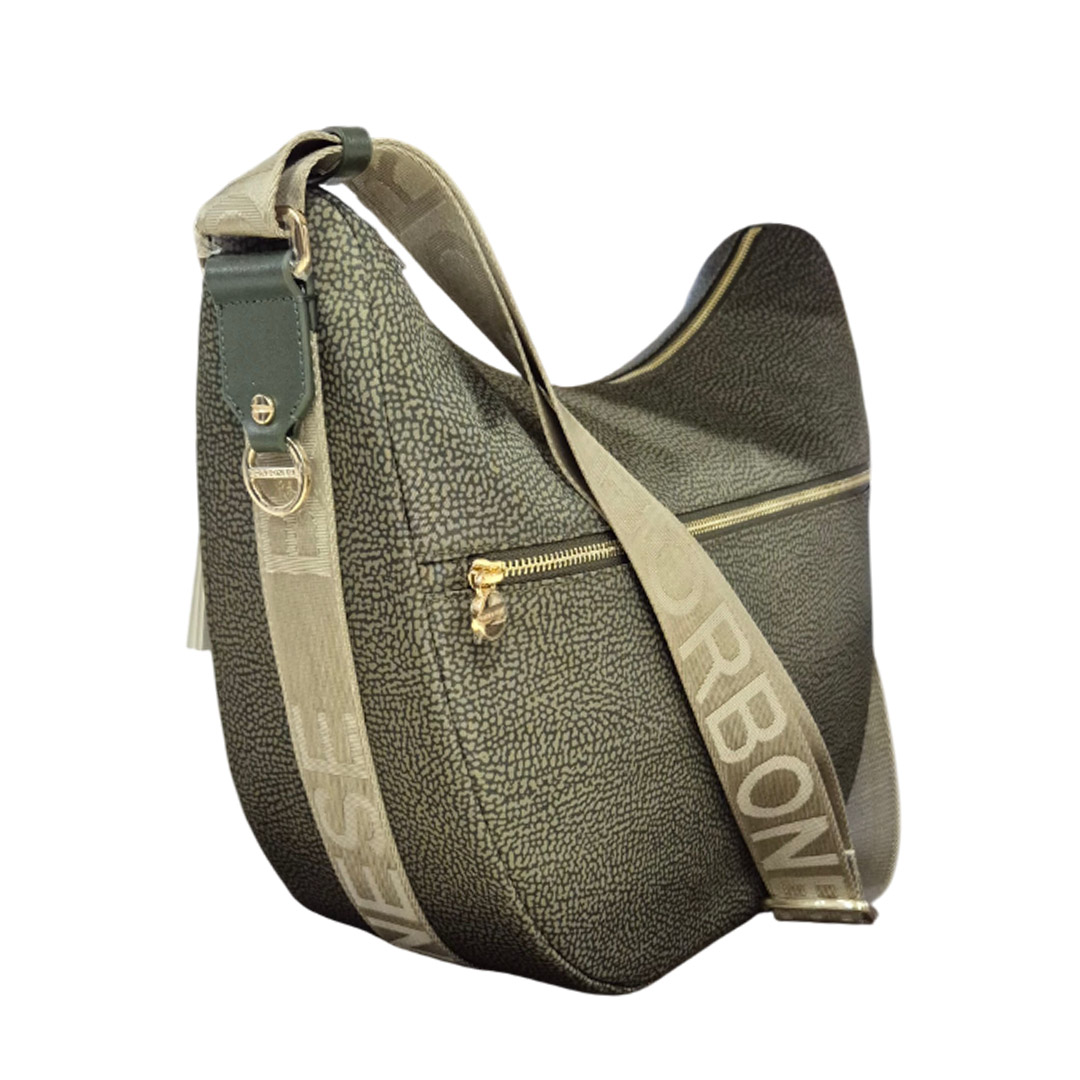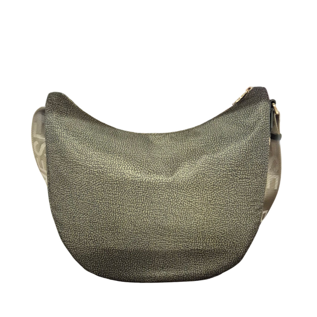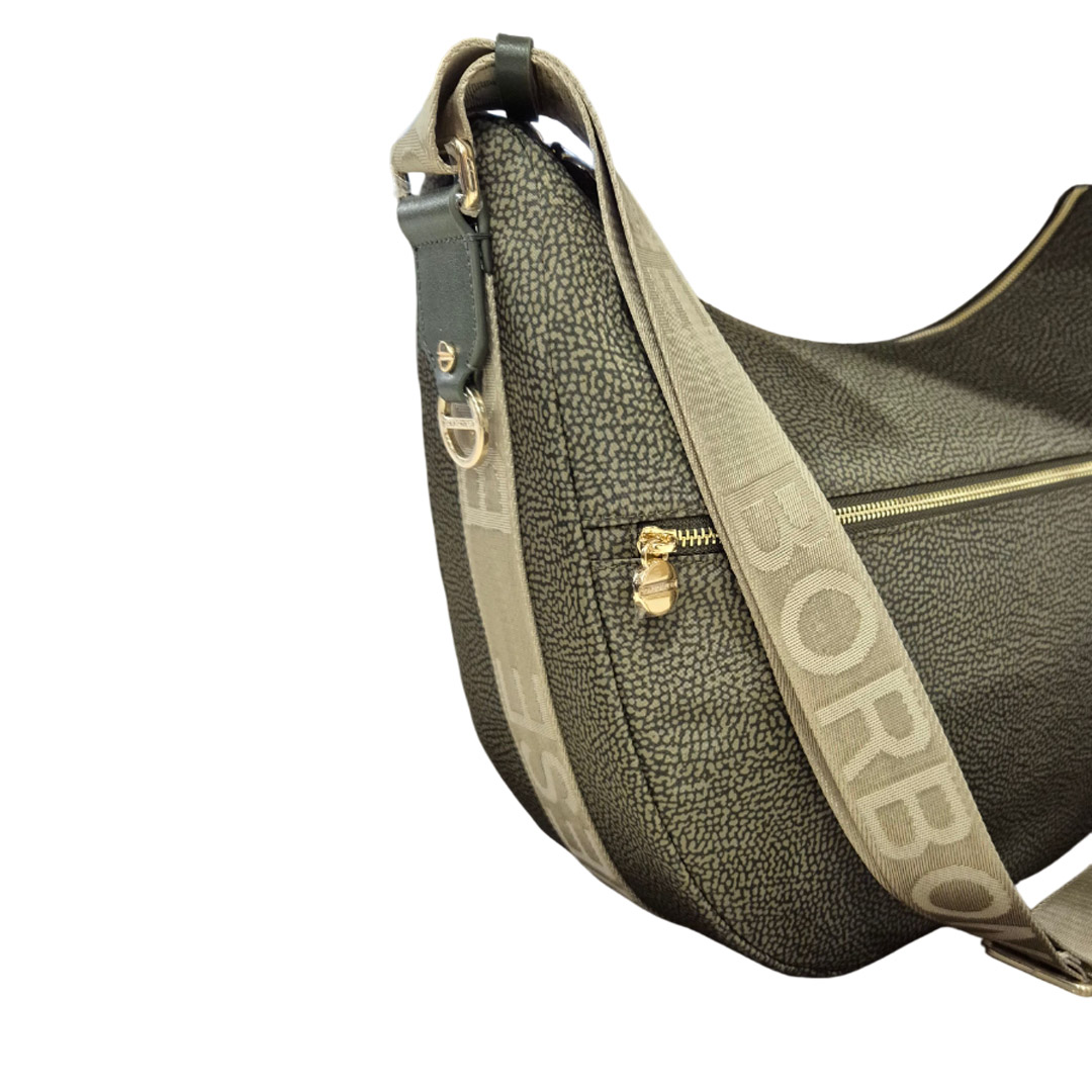 Borbonese's iconic Luna Bag is a medium hobo bag made of recycled OP nylon and leather. The adjustable shoulder strap is made of branded nylon with a self-locking buckle. The main closure and the external pocket are secured by a zipper with a pull in the shape of a stylized screw, the brand's symbol. The jacquard-lined interior has three pockets, one of which is zipped. The hardware is light gold-plated. Depth: 15 cm Width: 35 cm Height: 38 cm