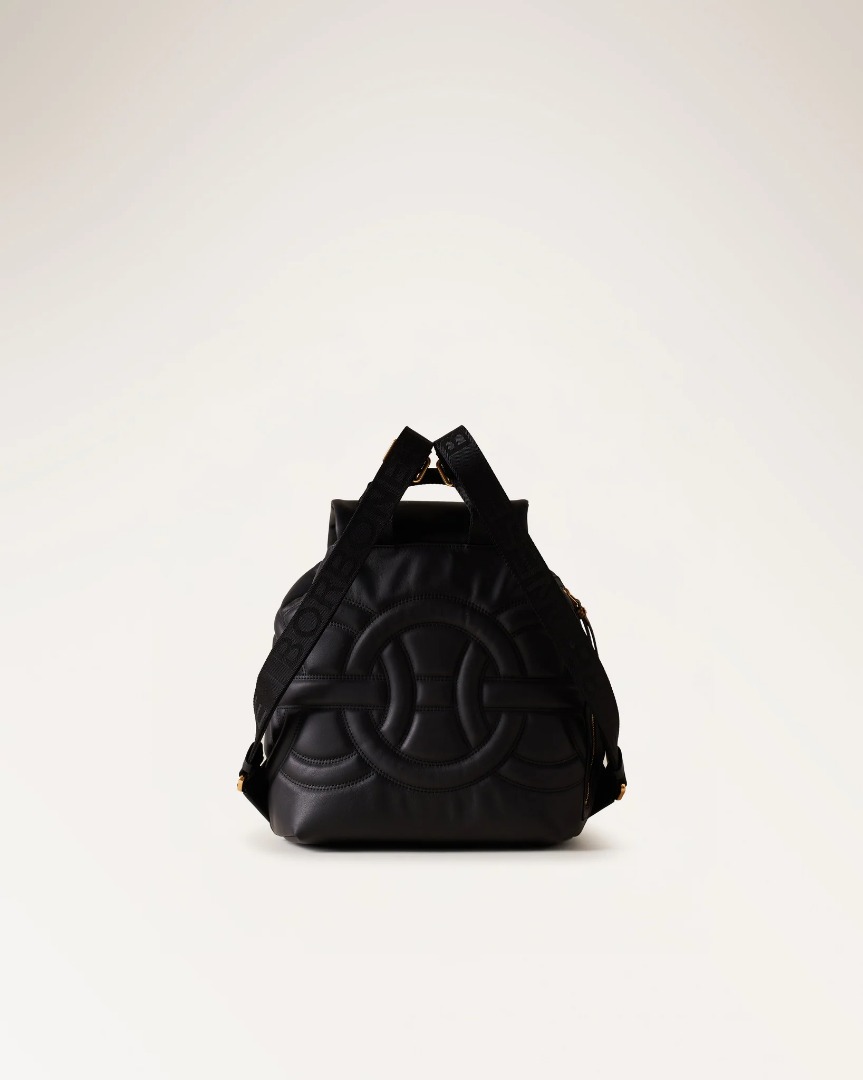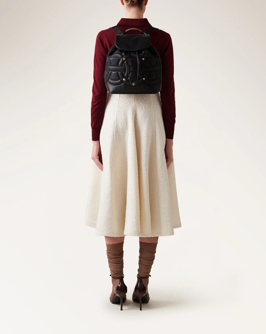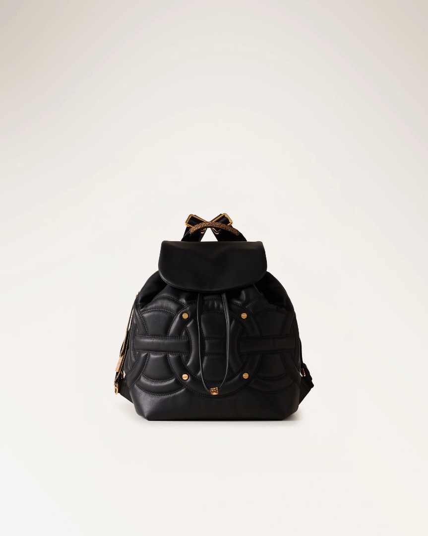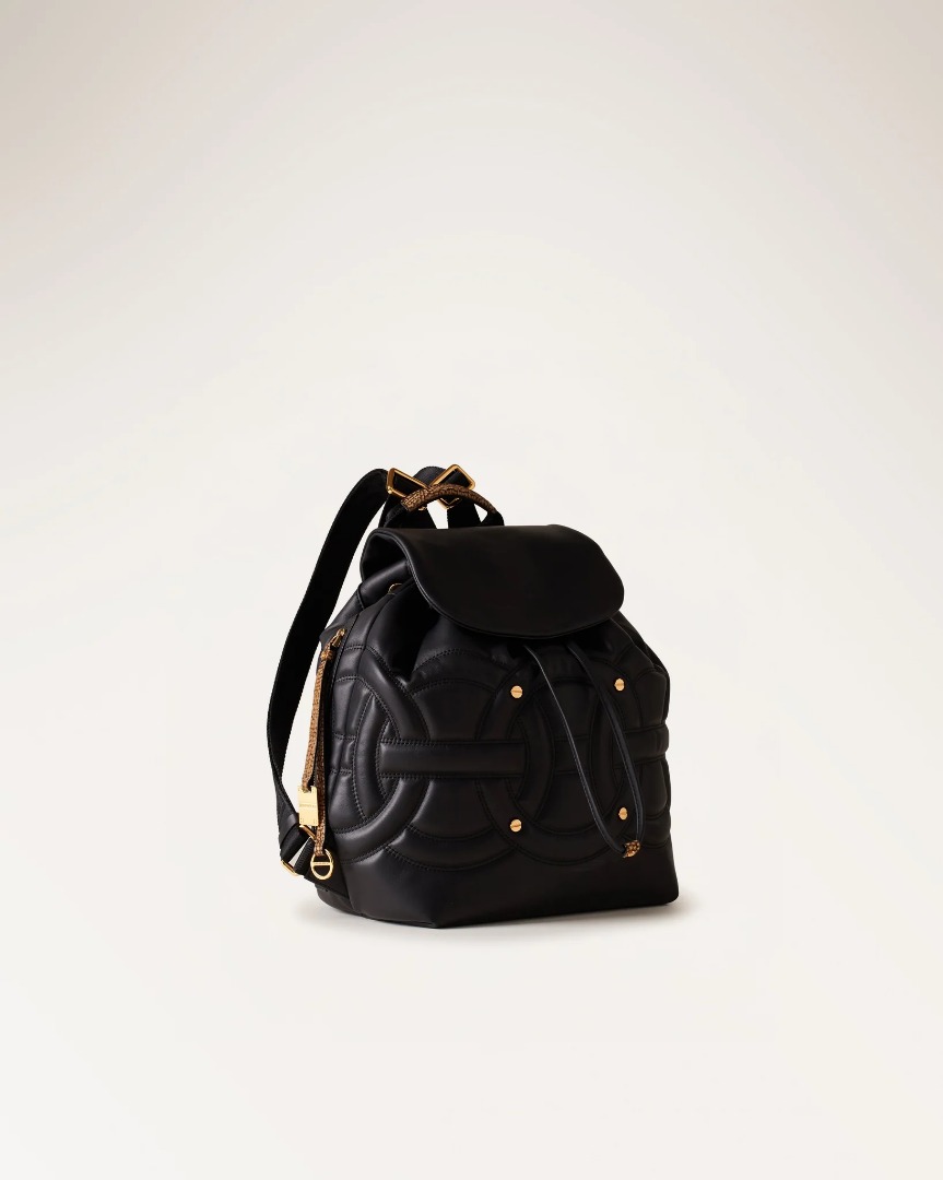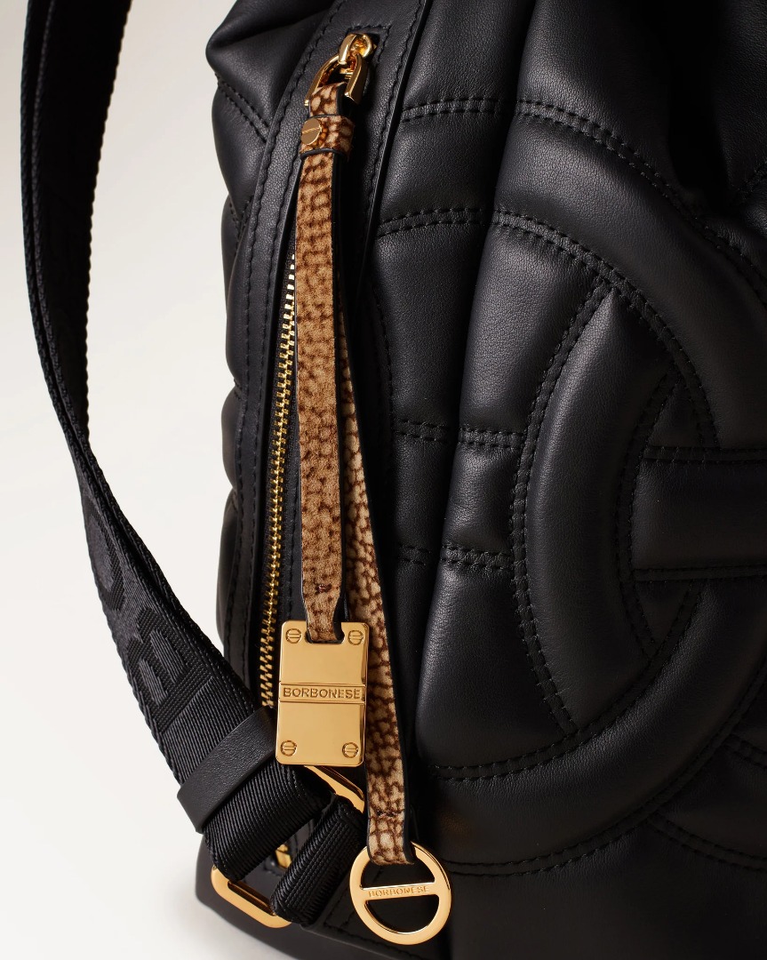 Matellasse' nappa calfskin with screw design Op Suede details Recycled jacquard fabric lining Drawstring and flap closure Op Suede zip puller with screw decorative elements and logoed plate Logoed nylon shoulder straps Gold hardware Large size dimensions: 27x32x17