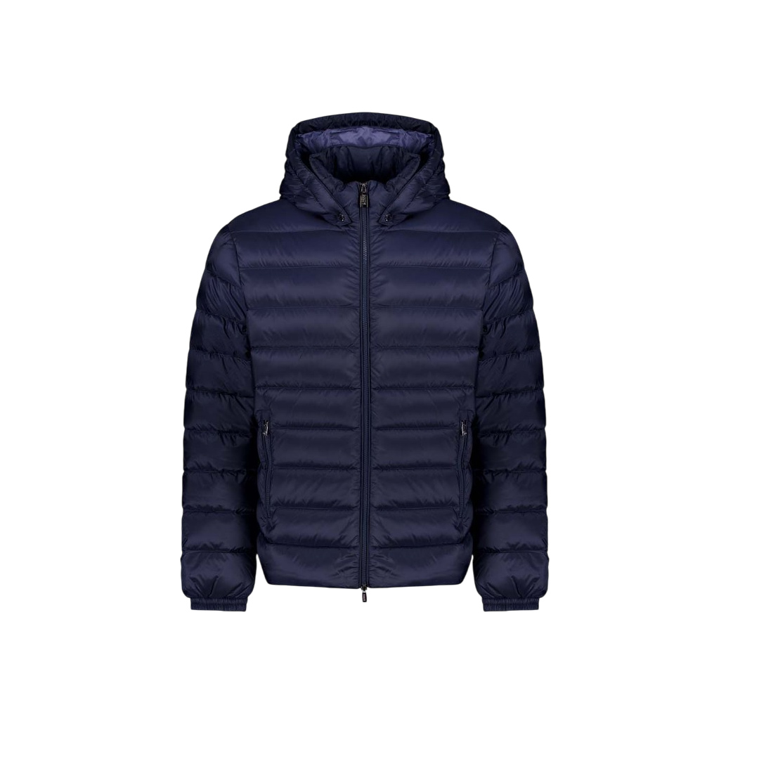 Men's 200-gram down jacket with detachable hood and two pockets, designed for both outdoor and urban activities. It is made of nylon cire fabric, with a matte appearance, wind resistant, and a contrasting lining. The 800 fill power 200-gram certified down padding, adjustable bottom and elasticated cuffs retain heat and guarantee technical performance, functionality and an exceptional warmth-to-weight ratio. -regular fit -contrast lining -elasticated cuffs and adjustable hem with elastic drawcord and stopper -inner collar for additional warmth and detachable hood -logoed pullers -tone-tone zip -inner mesh pockets -waterproofing treatment (DWR) -tone-tone rubber logo on the left sleeve