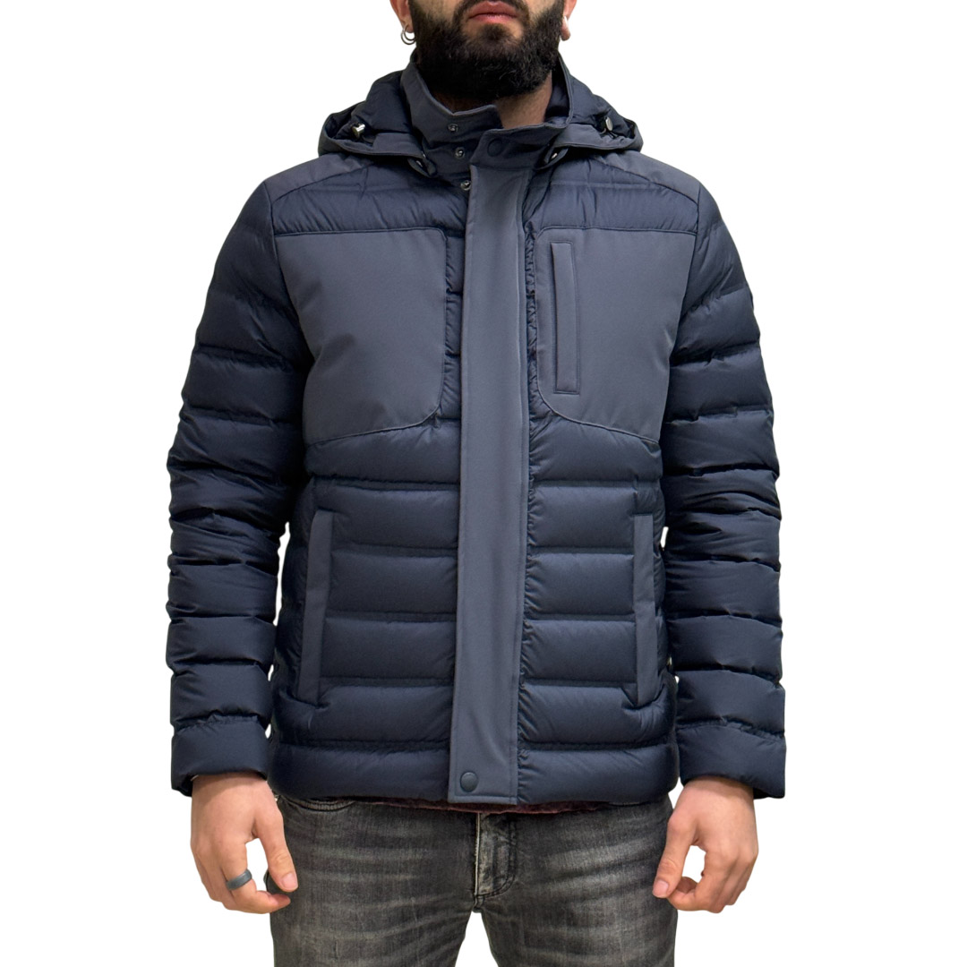 Main fabric: 85% Polyamide + 15% Elastane Secondary fabric: 100% Polyester Lining: 100% Polyester Padding: 90% Duck down + 10% Duck feather