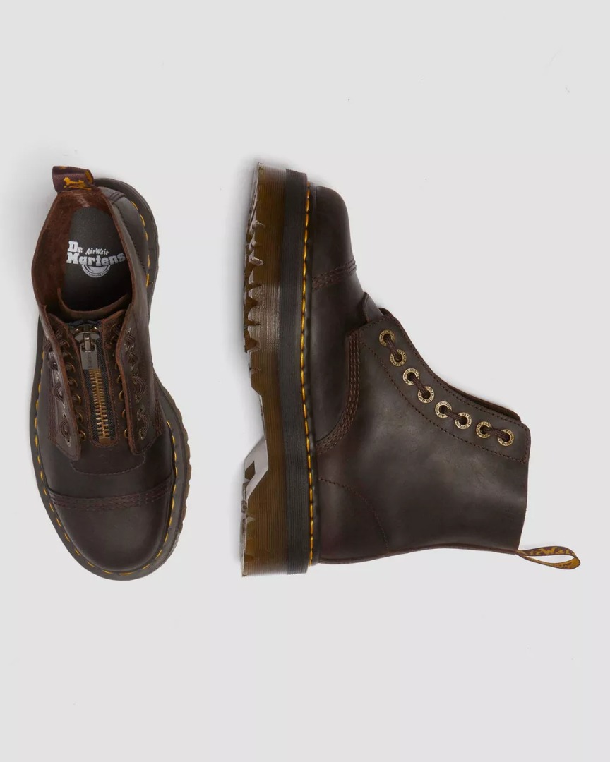 A Sinclair boot in brown Crazy Horse leather that looks like it's already seen many summers and been to hundreds of festivals: a new pair, but with a worn-in look. The grooved sole is further reinforced with yellow and brown stitching, the same colors you'll find on the AirWair heel tab. For maximum versatility, it's up to you whether you wear this pair with its classic front zipper or not. You'll make an impression either way. Crazy Horse is a sturdy, textured leather with a worn-in look.