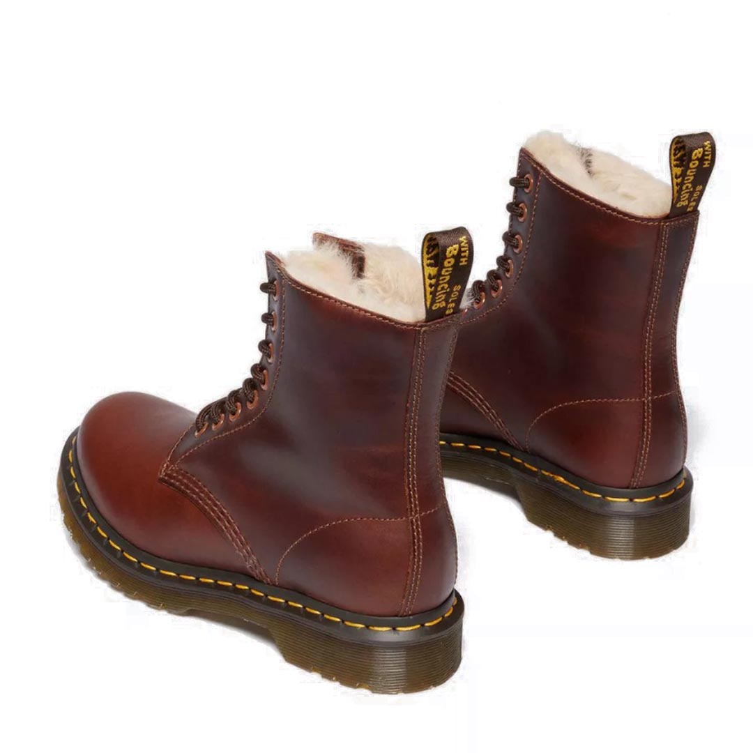 Get ready for winter: This cold-weather version of the classic Dr. Martens 8-eye boot features an extra-rugged sole with a lug tread for a stable ride; plus, the boot is lined with a soft, rich white faux fur. Faux fur lining Featuring the iconic comfort of the Dr. Martens air-cushioned sole Designed for durability with a Goodyear welt In Orleans, a soft, waxy, lightly textured leather Features all the classic Docs DNA, including grooved edges, exposed stitching, and a heel-loop