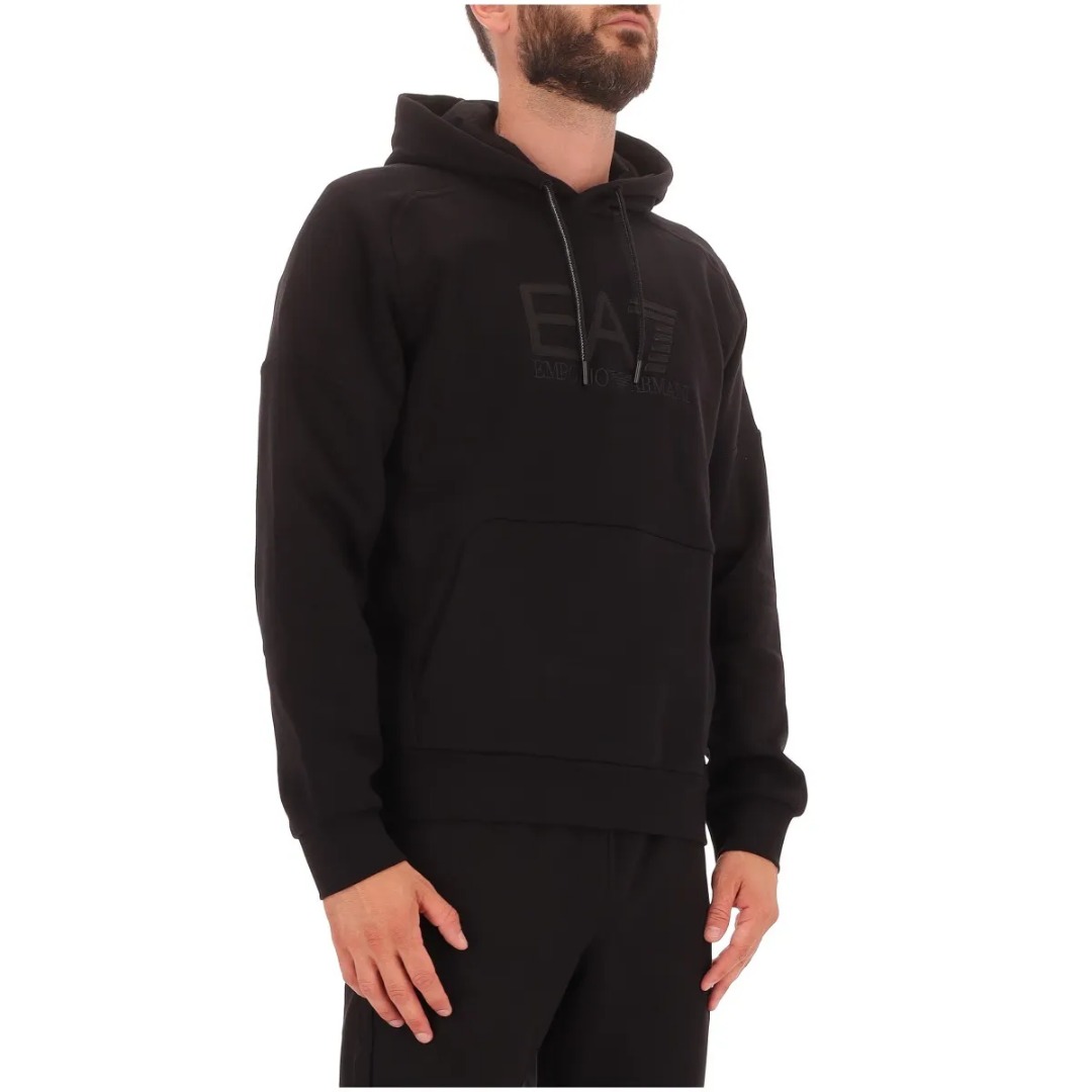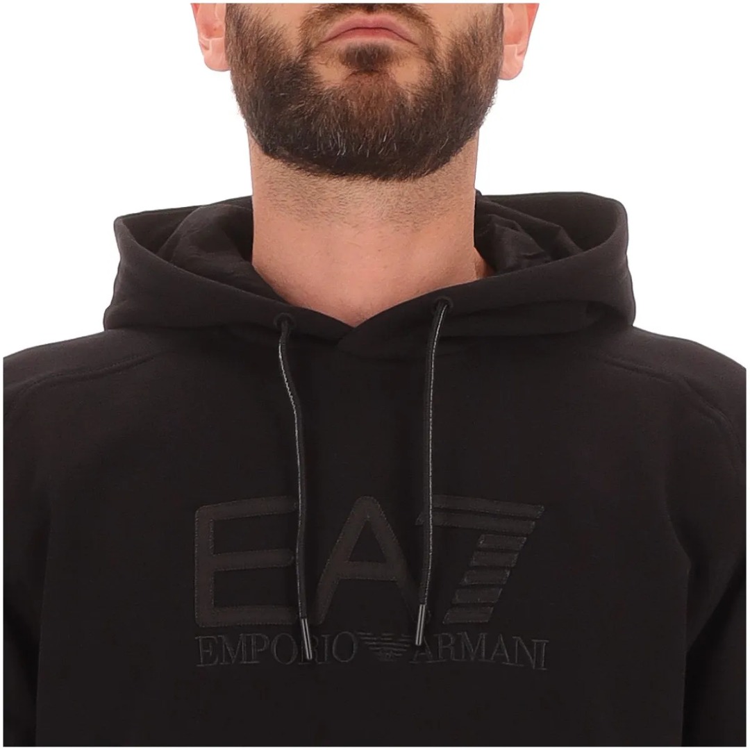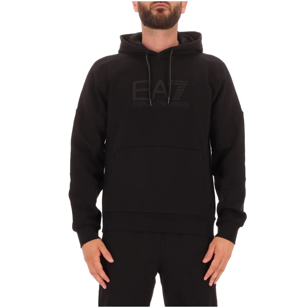 Hooded sweatshirt made of a cotton blend, a fabric that ensures maximum comfort, ideal for leisure time or before and after training. The model, designed for those seeking the perfect mix of functionality and essential design, features a kangaroo pocket and is personalized with the maxi EA7 logo on the chest. A perfect option for those seeking a discreet yet distinctive look. Regular fit. Drawstring hood. Contrasting EA7 logo on the chest. One front kangaroo pocket. Long sleeves.
