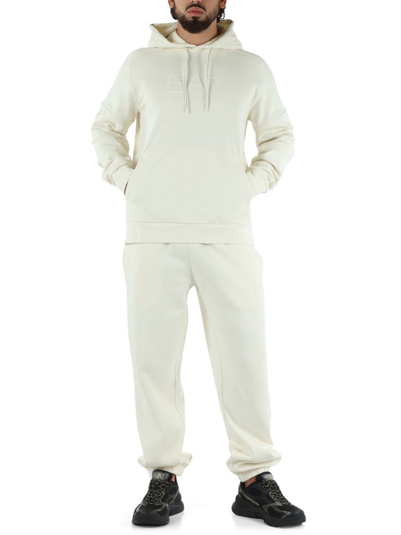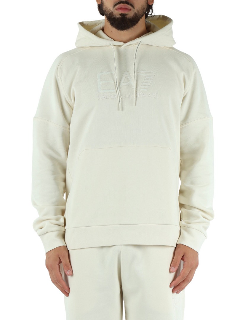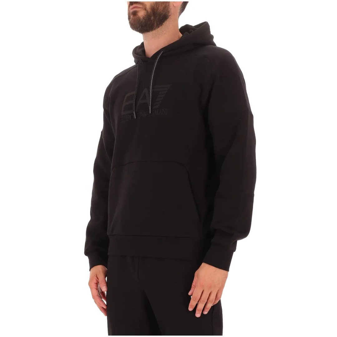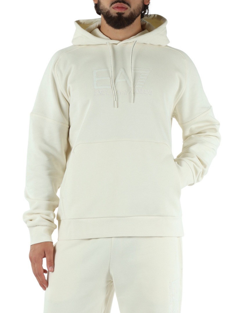 Hooded sweatshirt made of a cotton blend, a fabric that ensures maximum comfort, ideal for leisure time or before and after training. The model, designed for those seeking the perfect mix of functionality and essential design, features a kangaroo pocket and is personalized with the maxi EA7 logo on the chest. A perfect option for those seeking a discreet yet distinctive look. Regular fit. Drawstring hood. Contrasting EA7 logo on the chest. One front kangaroo pocket. Long sleeves.