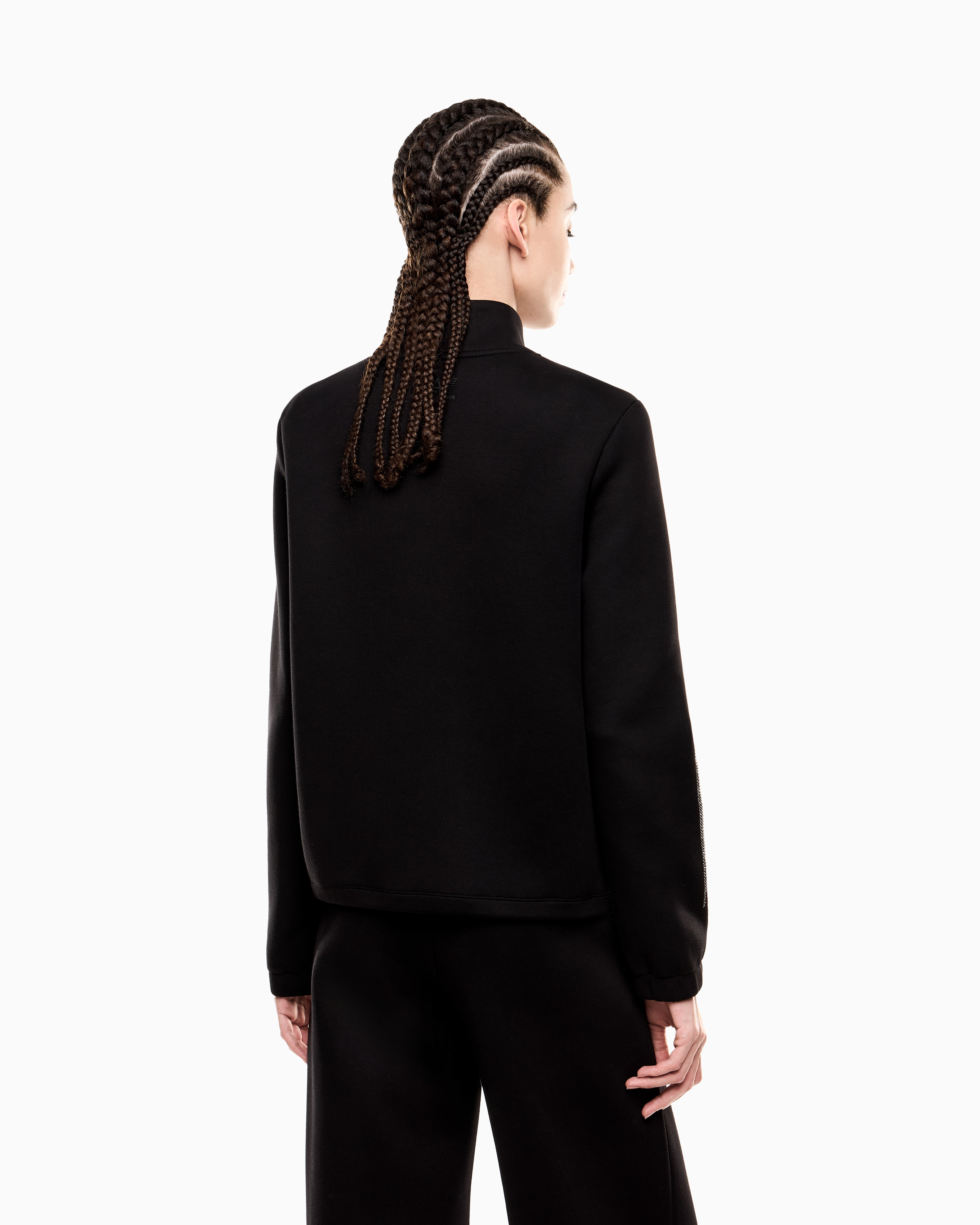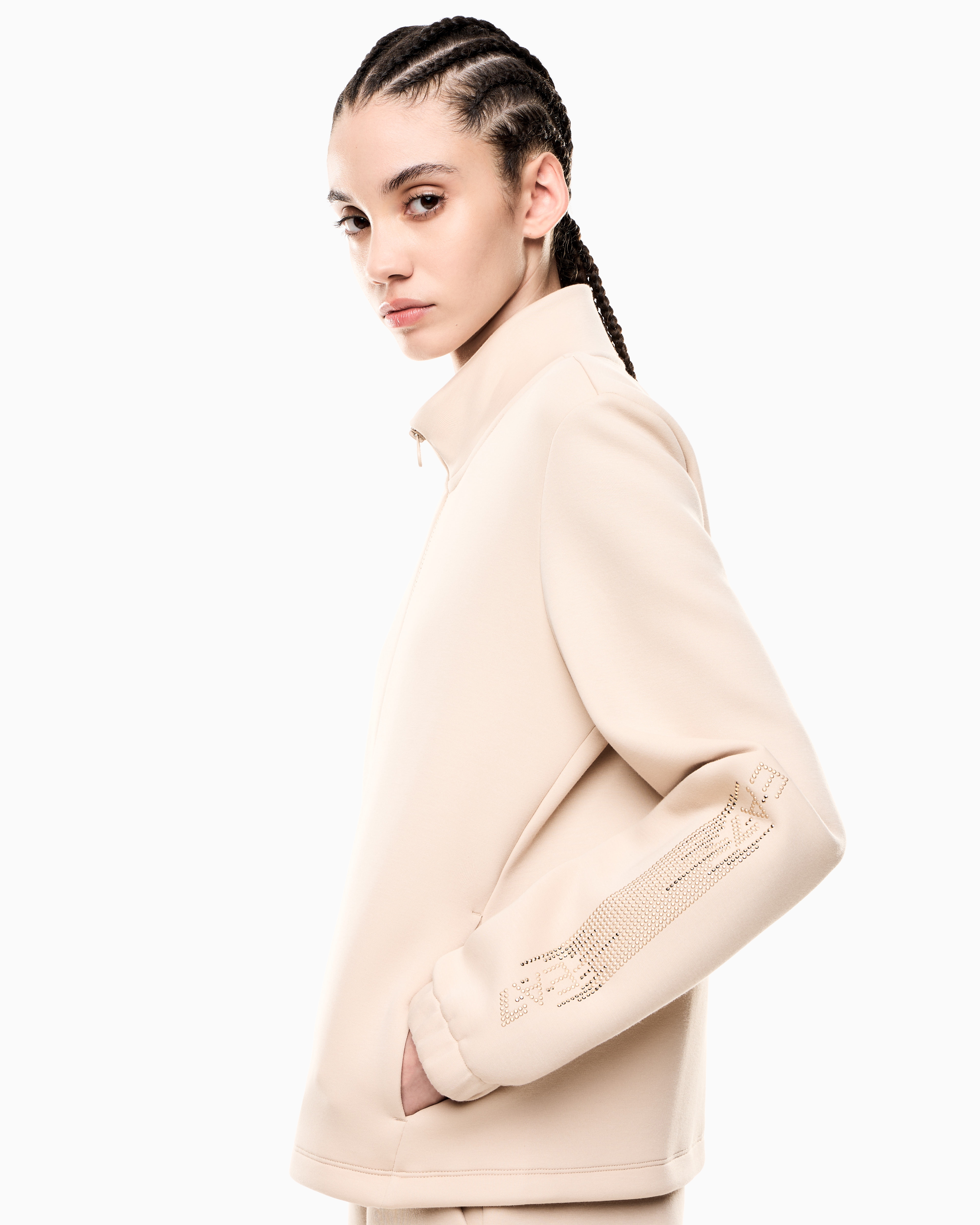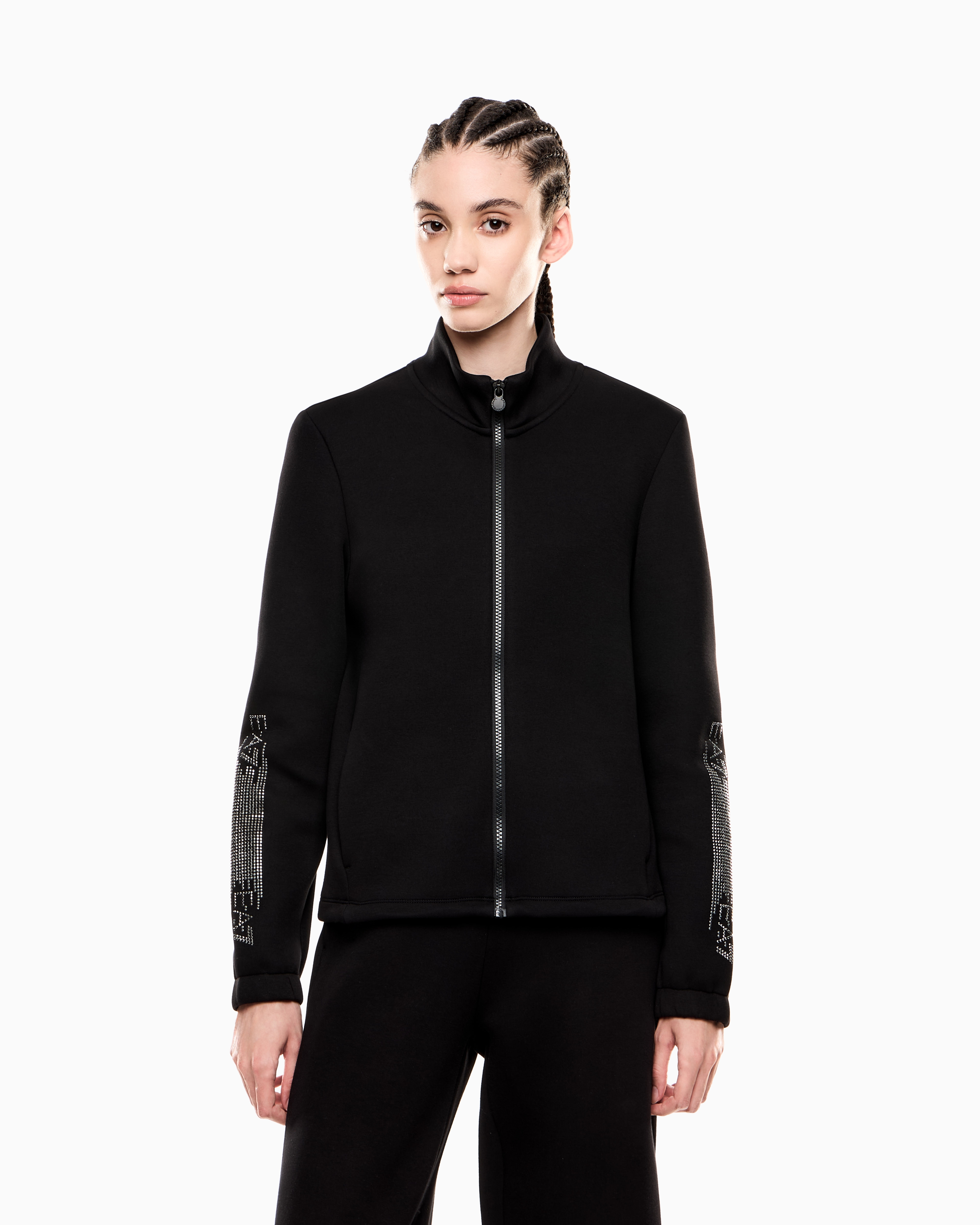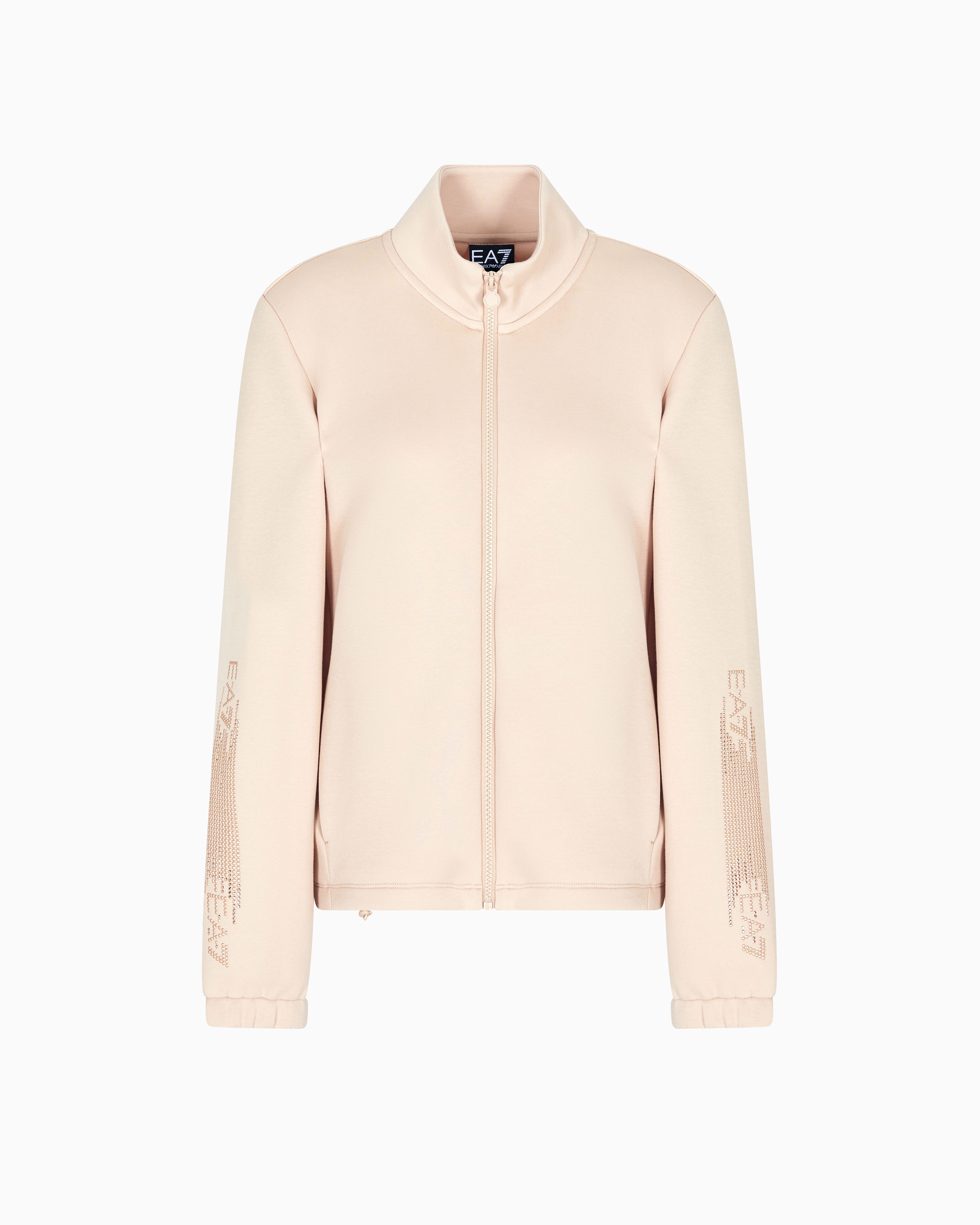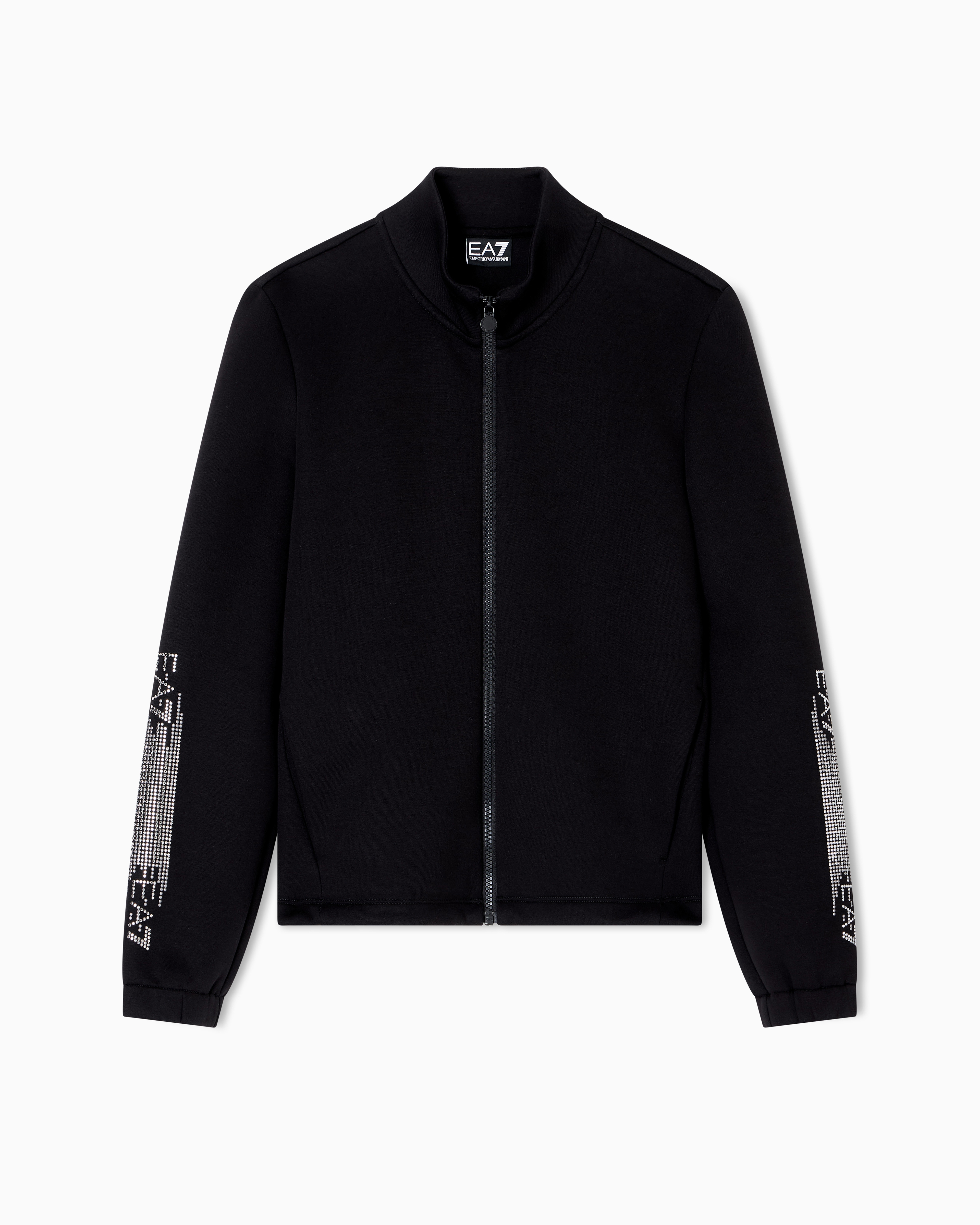 A cotton blend sweatshirt with a high collar and full zip closure. The piece is embellished with a logo made entirely of micro studs, which adorns the cuffs. The EA7 logo is the true protagonist of the Logo Series collection, which this season features different animations: tone-on-tone, retro graphics, and mini sizes. Comfortable and versatile pieces, perfect for relaxing and leisurely wear.