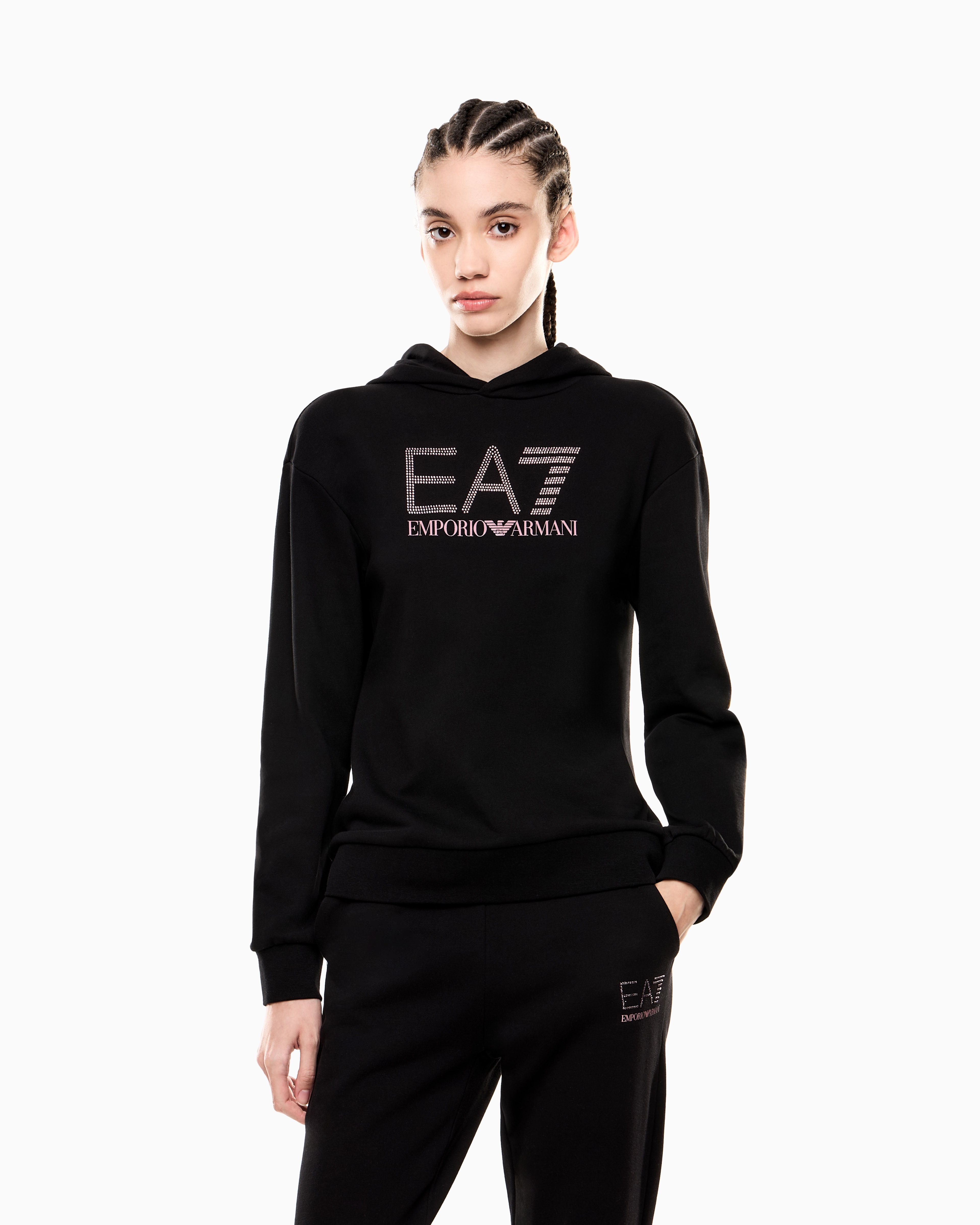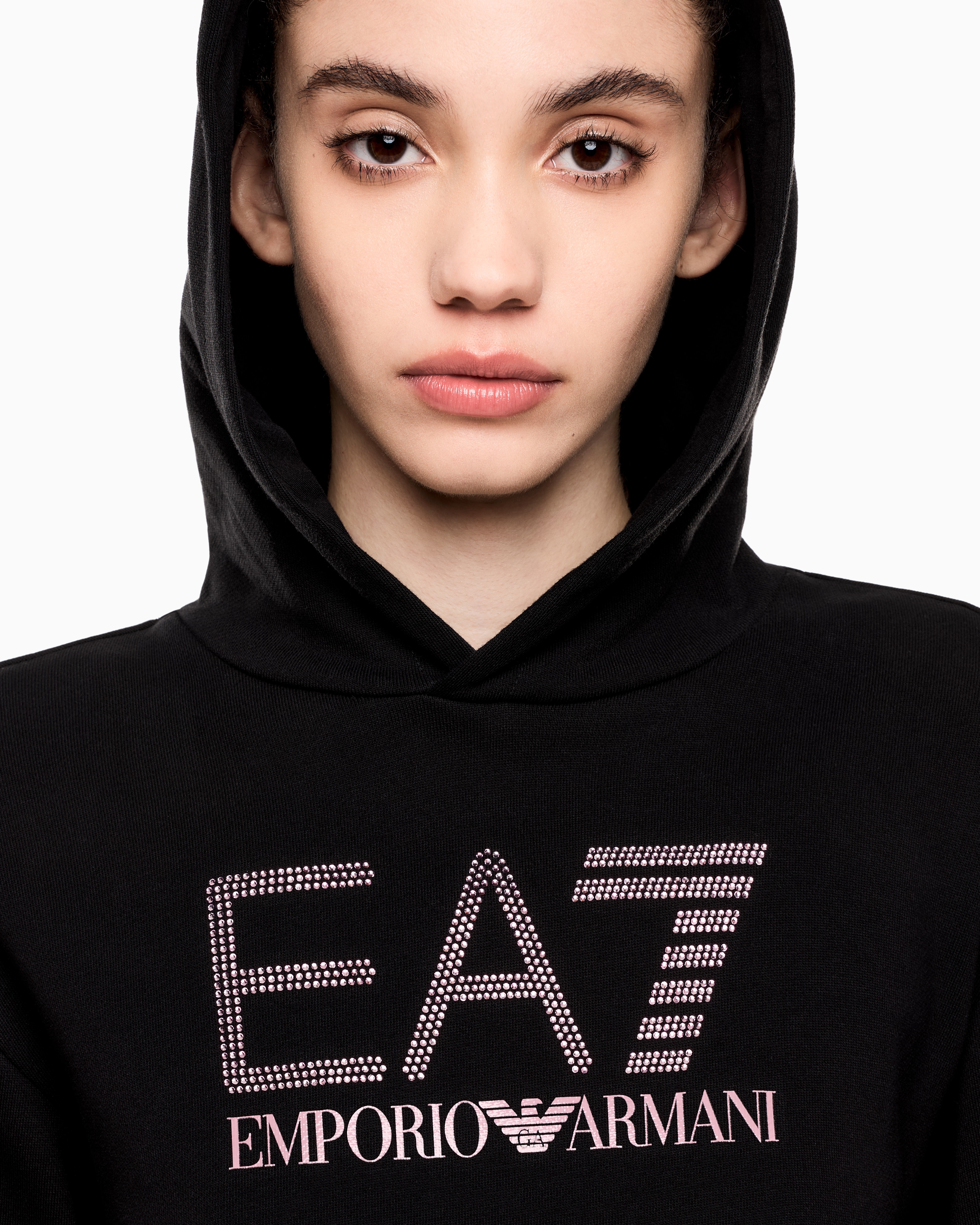 Hooded sweatshirt made of organic cotton. The piece is embellished with a large rhinestone logo on the front, creating numerous highlights and elevating the garment. The EA7 logo is the true protagonist of the Logo Series collection, which this season features different animations: tone-on-tone, retro graphics, and mini sizes. These comfortable and versatile pieces are perfect for relaxing and leisurely wear.
