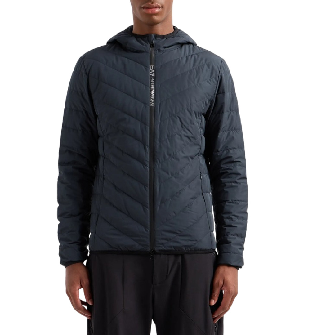 This down jacket combines goose down padding with technical fabric to create a warm and versatile garment suitable for sports and leisure. The model features a front zip fastening, fixed hood, two practical side pockets and is personalised with a shield patch with logo. The garment is embellished with the new chevron-effect quilted motif and, being packable, can be stored in its dust bag. Packable model with dust bag Fixed hood Front zip fastening Two side pockets with zip EA7 shield patch on the left sleeve
