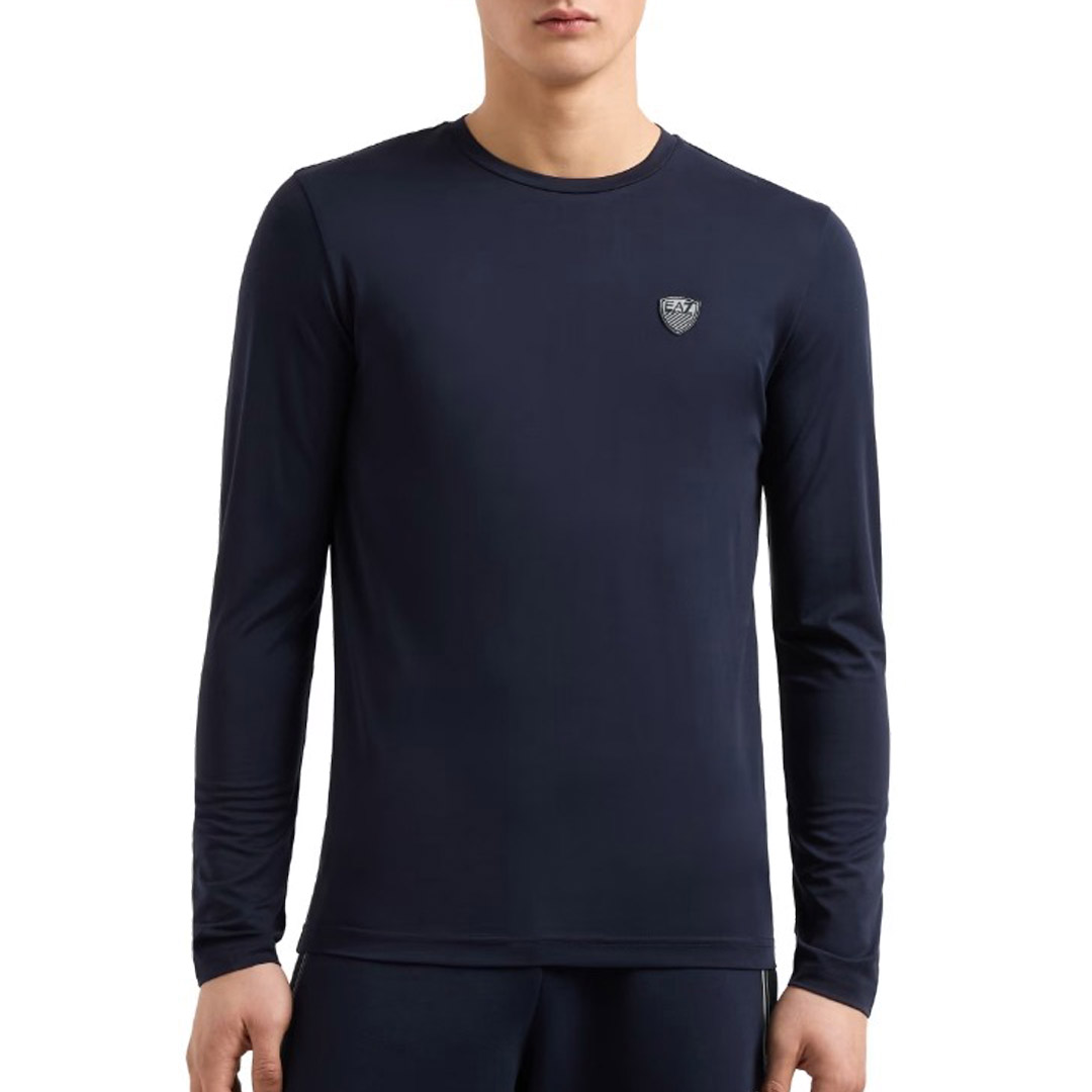 Crew neck, long-sleeved T-shirt made of stretch viscose blend jersey, embellished with the EA7 shield logo in a metallic finish. A versatile and comfortable garment, the perfect complement to sporty looks. Slim fit Crew neck Long sleeves EA7 shield logo in a metallic finish