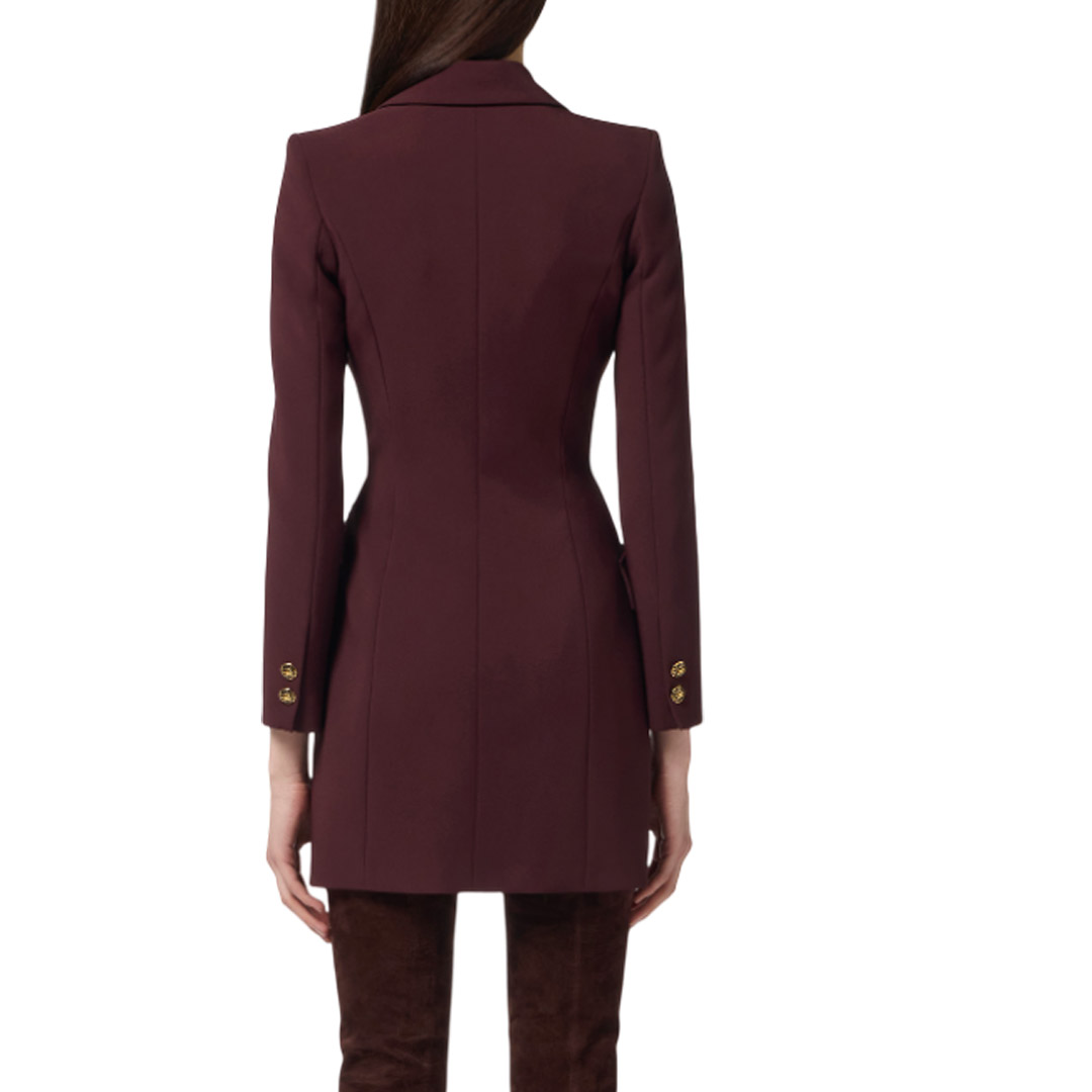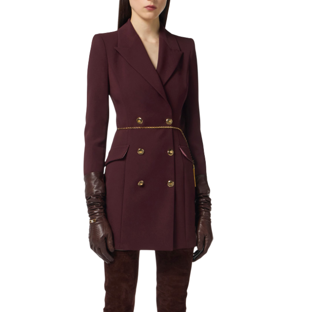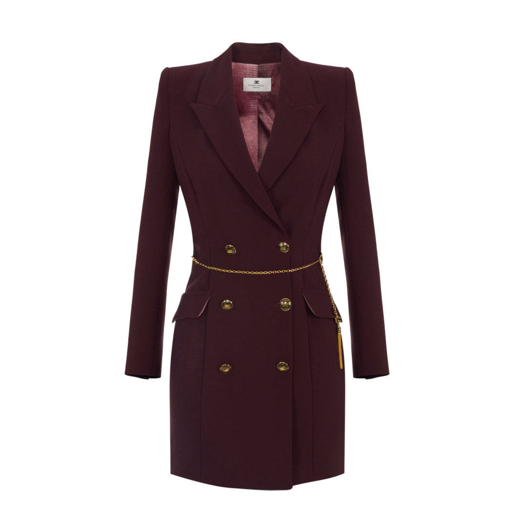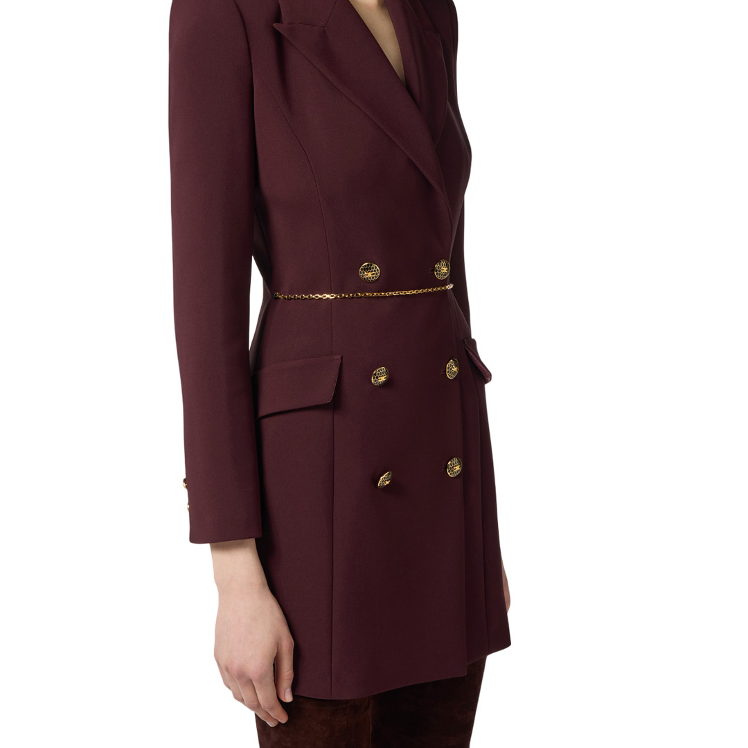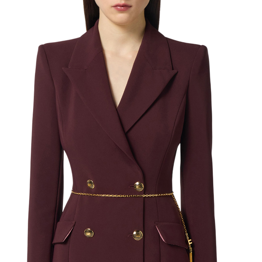 Lightweight crepe robemanteau dress. Inspired by the iconic blazer, the dress features structured shoulders, peak lapels with double-breasted buttons, and appliqué flaps. Precious details such as the buttons and the logo-embellished chain belt with snakeskin tassel add movement and sparkle. Fitted fit. Padded shoulders. Lining. Enamelled buttons with logo. Gold-tone metal jewel accessory with logo. Appliqué flaps.