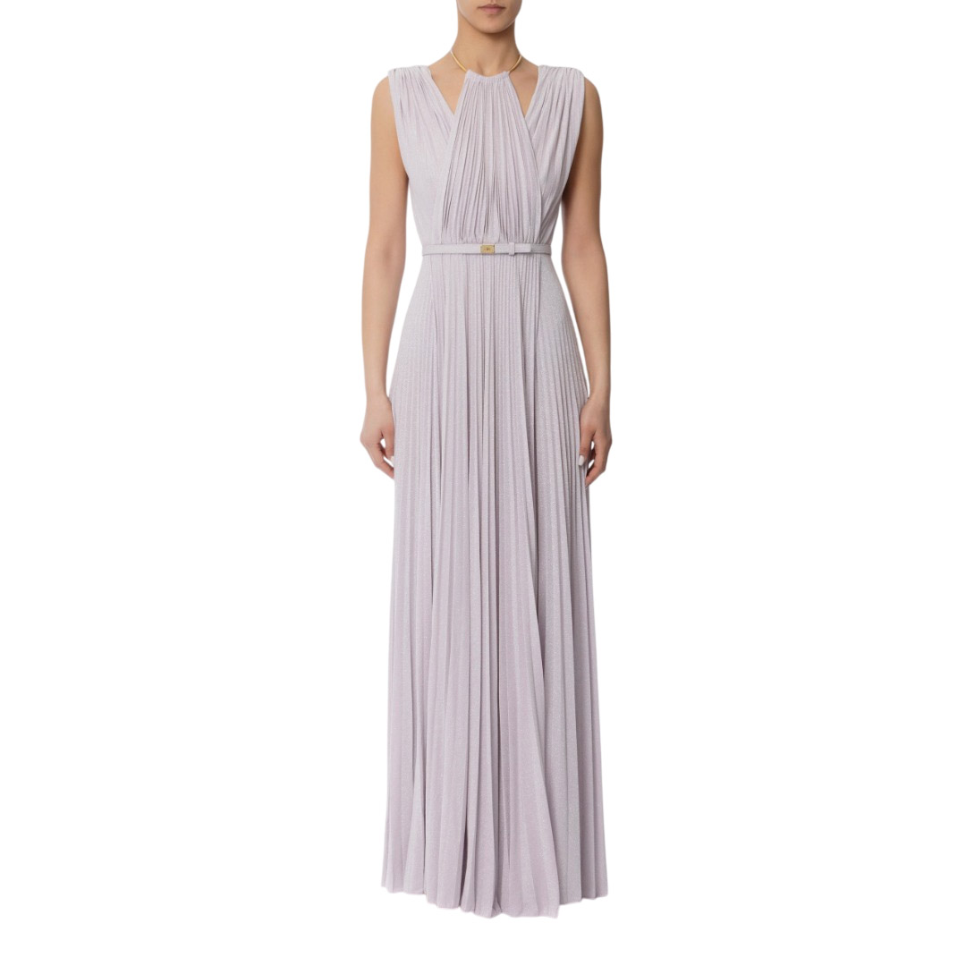 Long tulle dress with one-shoulder gathered top that converges in a series of gold metal grommets. The skirt has ample volume thanks to the different layers of tulle, in two different color combinations. The pendant logo accessory at the waist is removable. • Long dress • Tulle • Asymmetrical top • Gathered skirt • Logo accessory pendant at the waist is removable