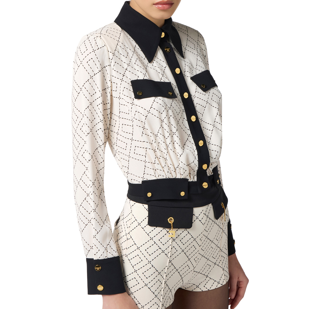 Slim-fit cropped georgette shirt. It features a classic collar and long sleeves. The collection's print creates a dynamic two-tone motif, enhanced by contrasting details. Highlights include gold-tone metal buttons. Gold-tone metal buttons with logo. Appliquéd plackets.