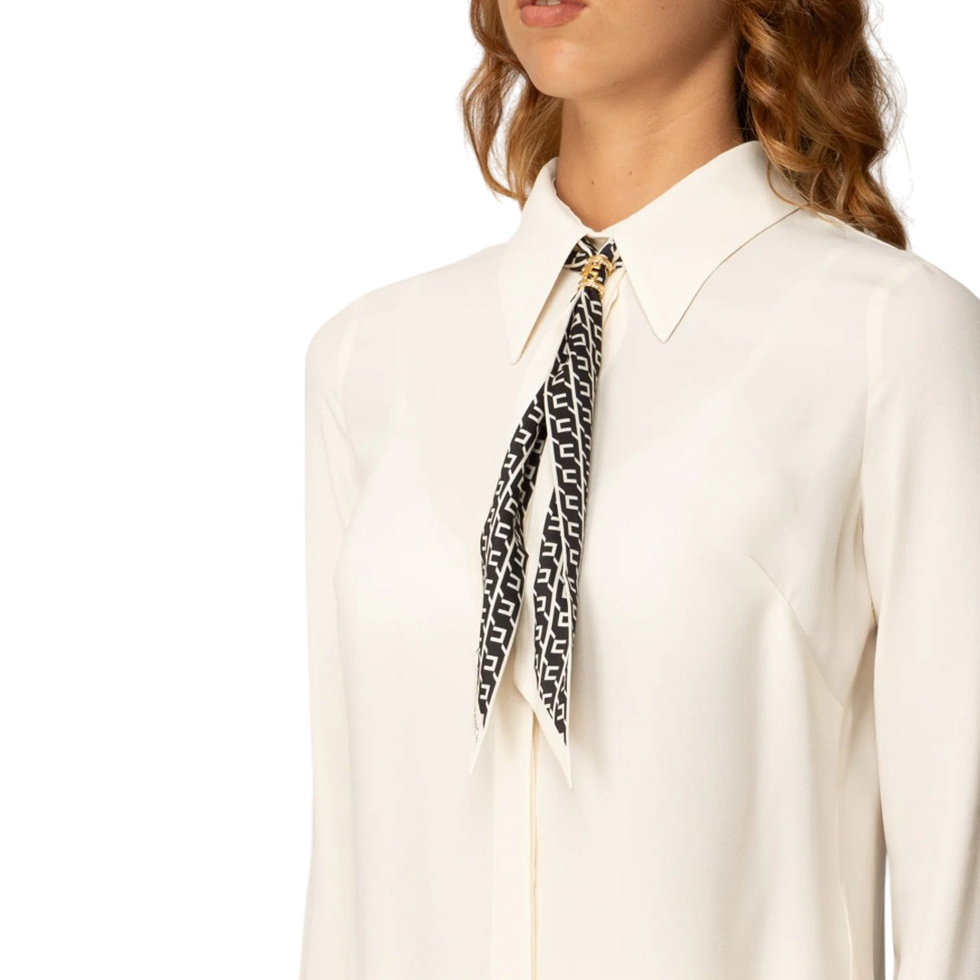 Slim-fit georgette shirt. The collar is embellished with a geometric print scarf, held in place by a logo-embellished loop. The cuffs feature a contrasting button and a double layer of organza for a refined sheer effect. Matching scarf. Logo buttons. Organza cuffs. Hidden closure.