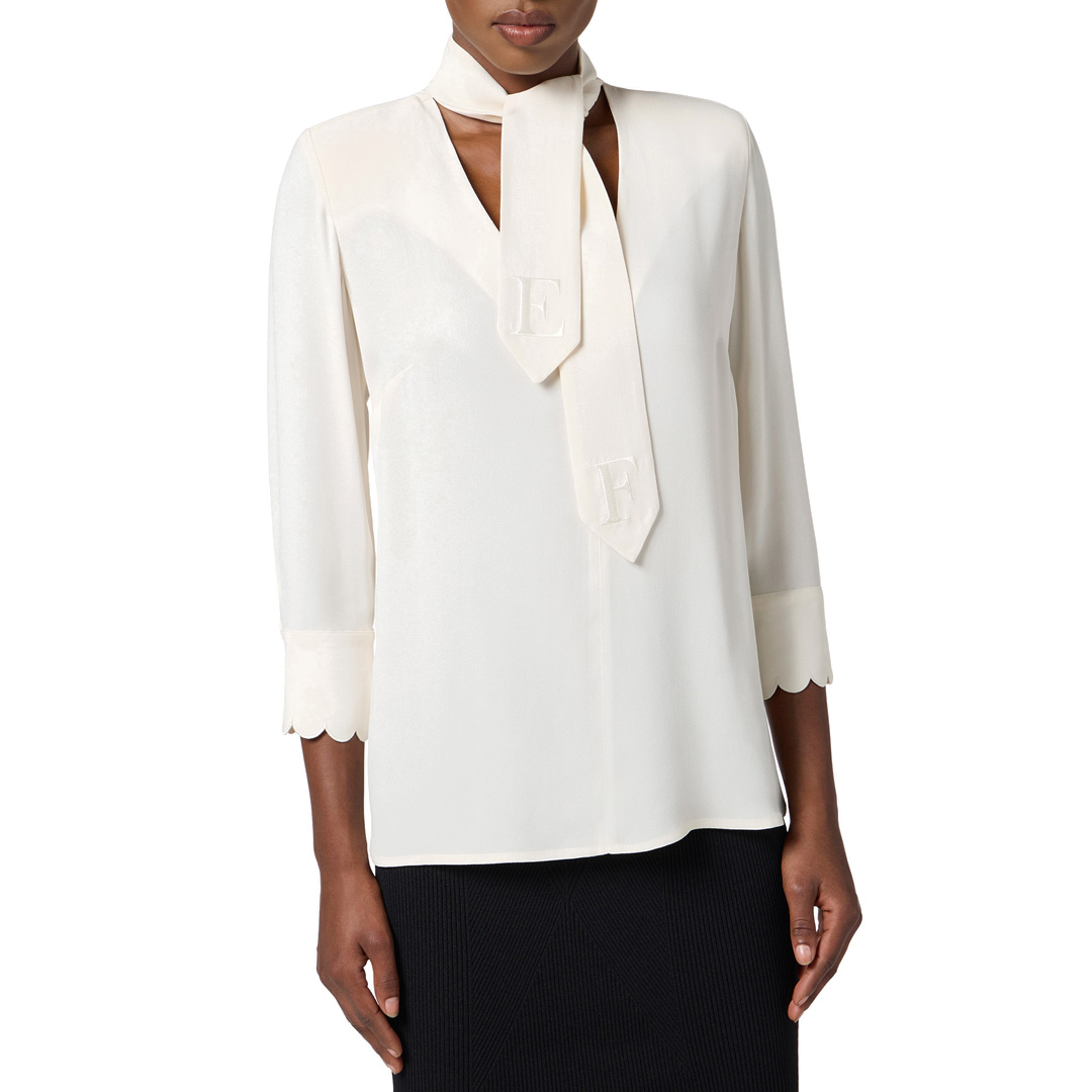 Regular-fit georgette shirt. It features a matching sash collar and embroidered logo at the hems. Scalloped cuffs add a delicate touch. Gold-tone metal buttons with logo. Padded shoulders.