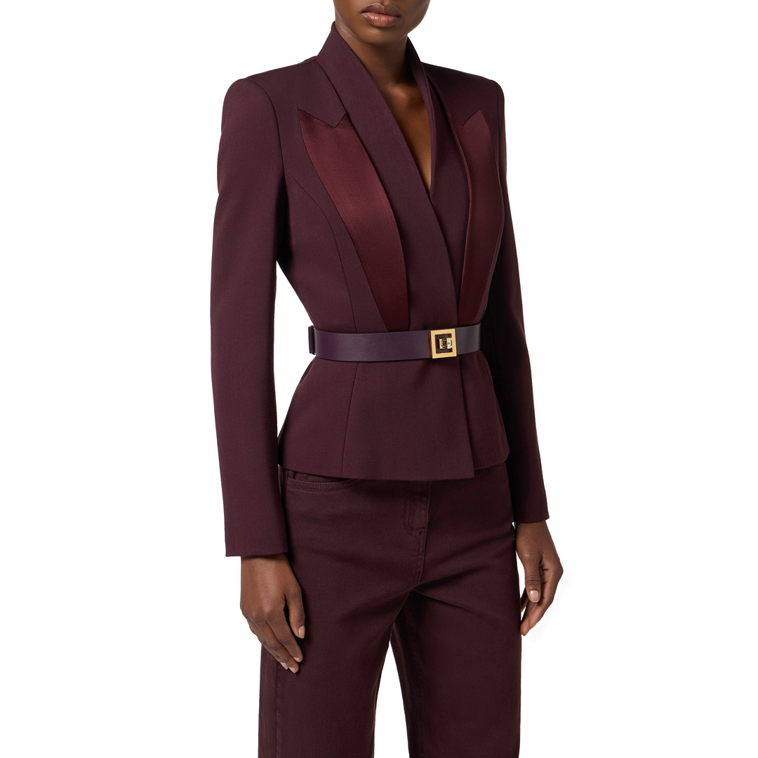 Slim-fit crepe jacket. The blazer features a shawl collar and double satin lapels, inlaid and matching to create interesting texture contrasts. The belted basque creates a bold and harmonious silhouette. Padded shoulders, monogrammed satin lining, belt with gold-tone metal logo, snap button closure.