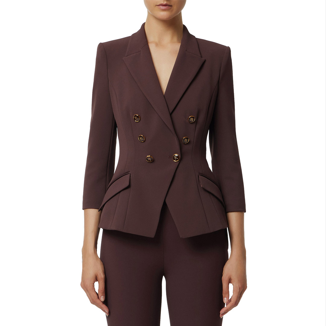 Slim-fit double crepe jacket. The blazer features structured shoulders, peak lapels, ¾ sleeves, and flaps with matching welts. The zips at the cuffs add unique details, while the enameled buttons embellish the piece. Part of the Essential collection, to build the perfect wardrobe. Padded shoulders, monogram satin lining, enameled buttons with logo, details in synthetic leather-like material, patch flaps, zip pulls on the sleeves.