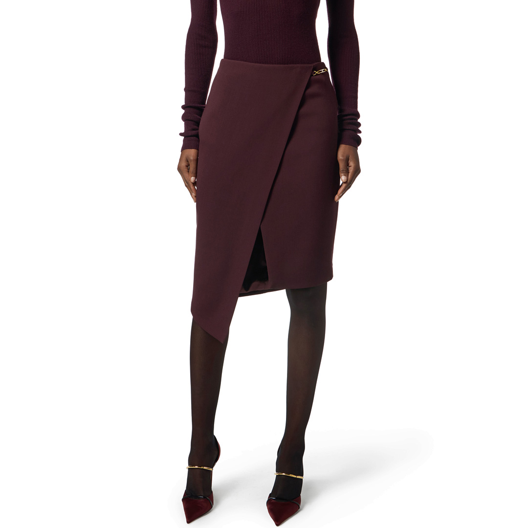 Slim-fit crepe pencil skirt. It features an asymmetrical panel construction and is embellished on one side with a gold-tone metal jewel detail featuring a logo and rhinestones. Monogram satin lining. Gold-tone metal detail with a logo and rhinestones. Invisible zip.