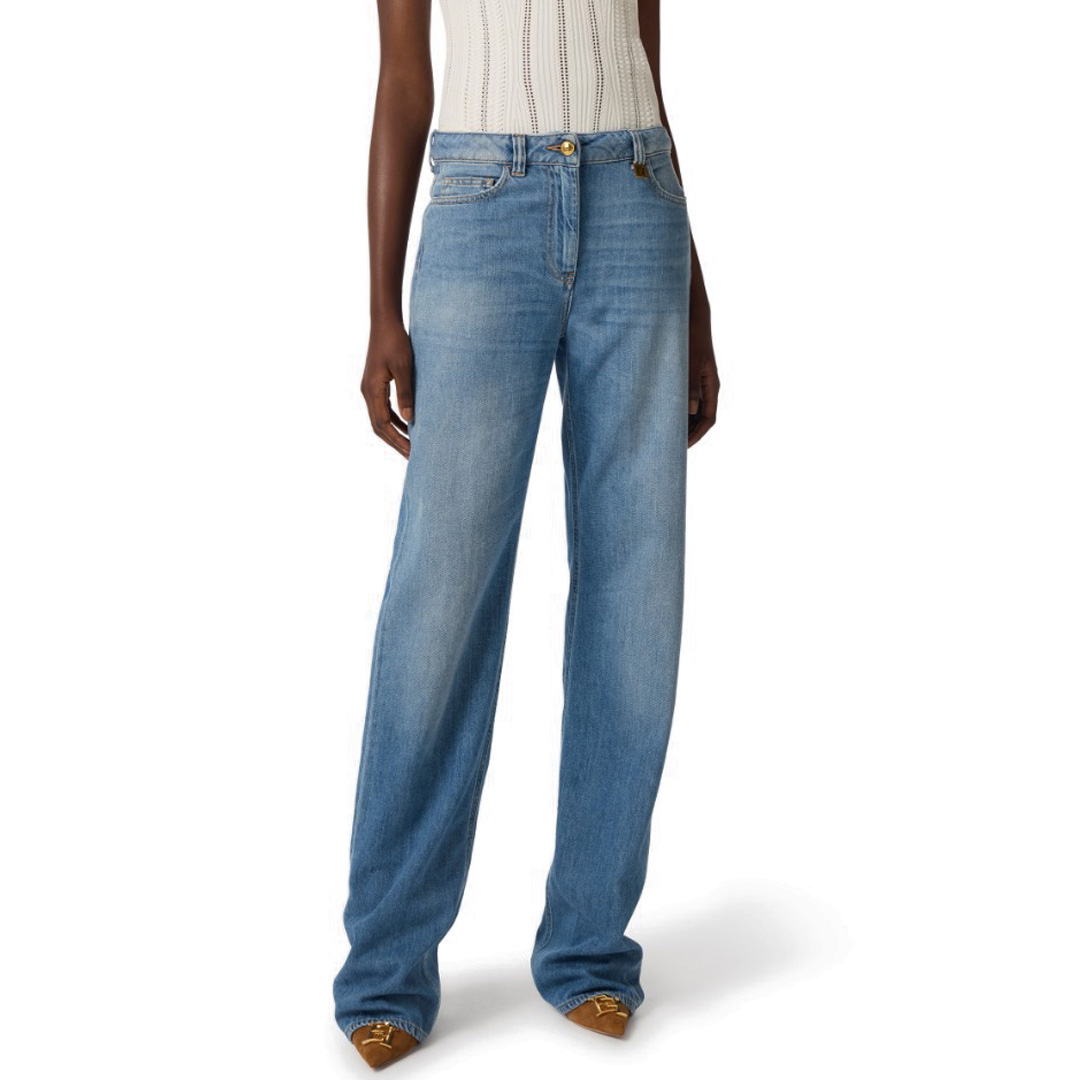 Denim trousers with a low rise and palazzo legs. Focus on the details: a logo plaque embellishes a belt loop, and a gold-tone metal button highlights the waistband. Patch pockets on the back, one of which is personalized with a diagonal logo tape. Oversized fit. Gold-tone metal detail with logo. Gold-tone metal button with logo. Back pockets.