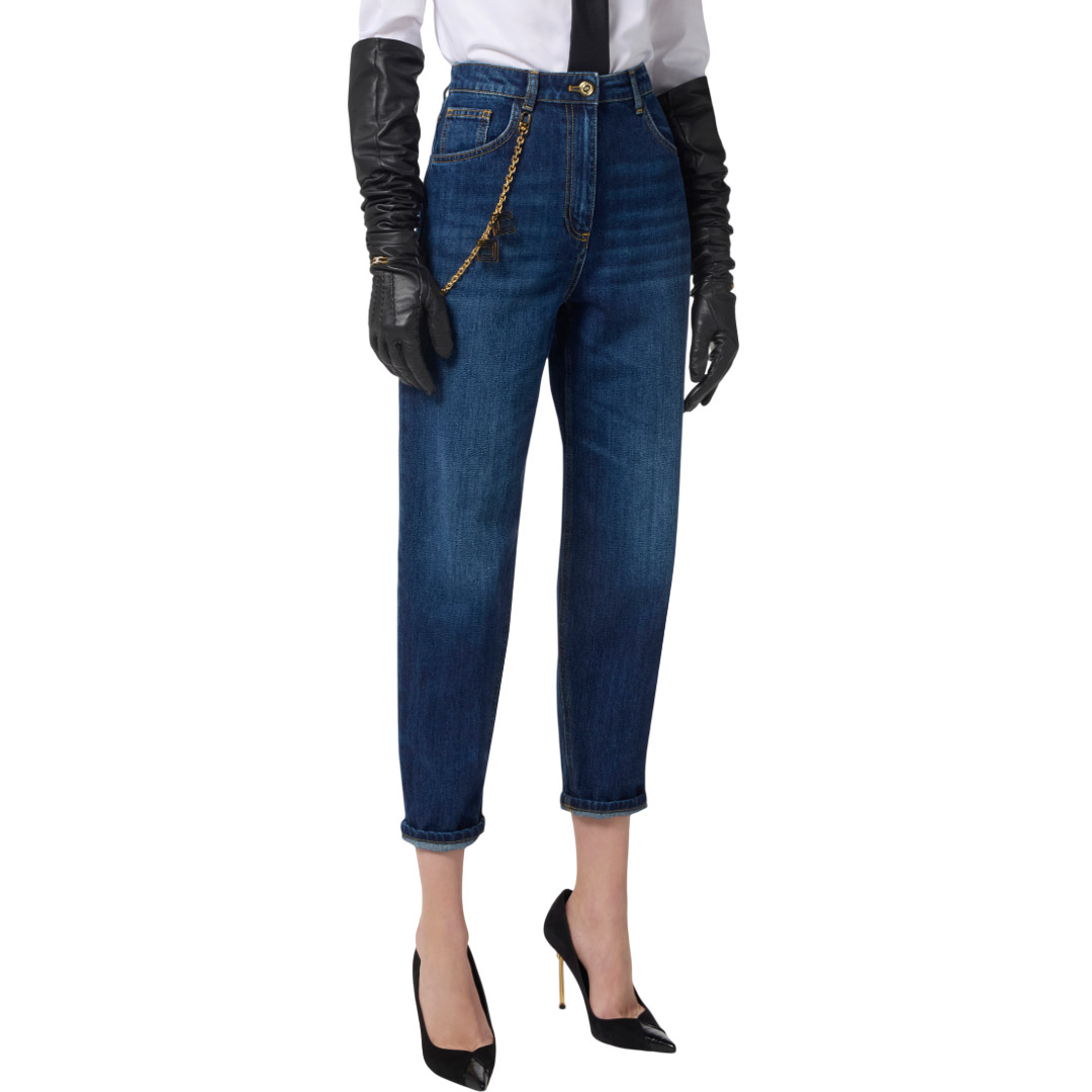 Regular-waisted denim trousers with a roll-up hem and a button fastening. Inspired by timeless five-pocket styles, they are embellished with a chain accessory featuring a gold-tone metal logo pendant. Logo tag on the back. Regular fit. Gold-tone metal button with logo. Gold-tone metal accessory with logo pendant.