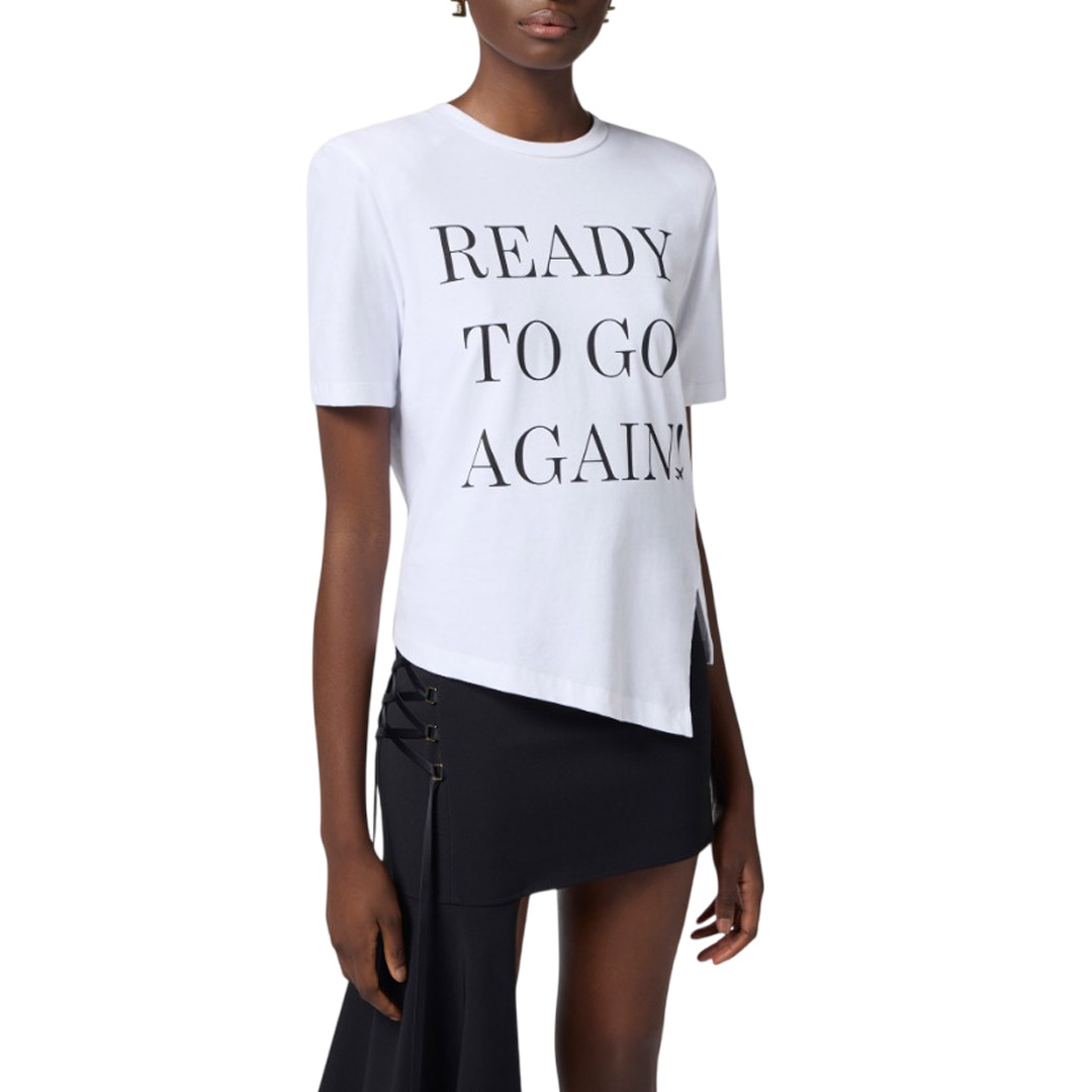 Short-sleeved T-shirt in cotton jersey with a slim fit. The piece has padded shoulders and an asymmetric hem that hugs the left hip. The lettering printed on the front adds a bold statement to an essential piece. Padded shoulders Lettering print Logo printed on the back