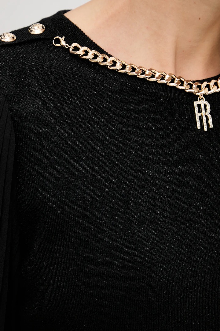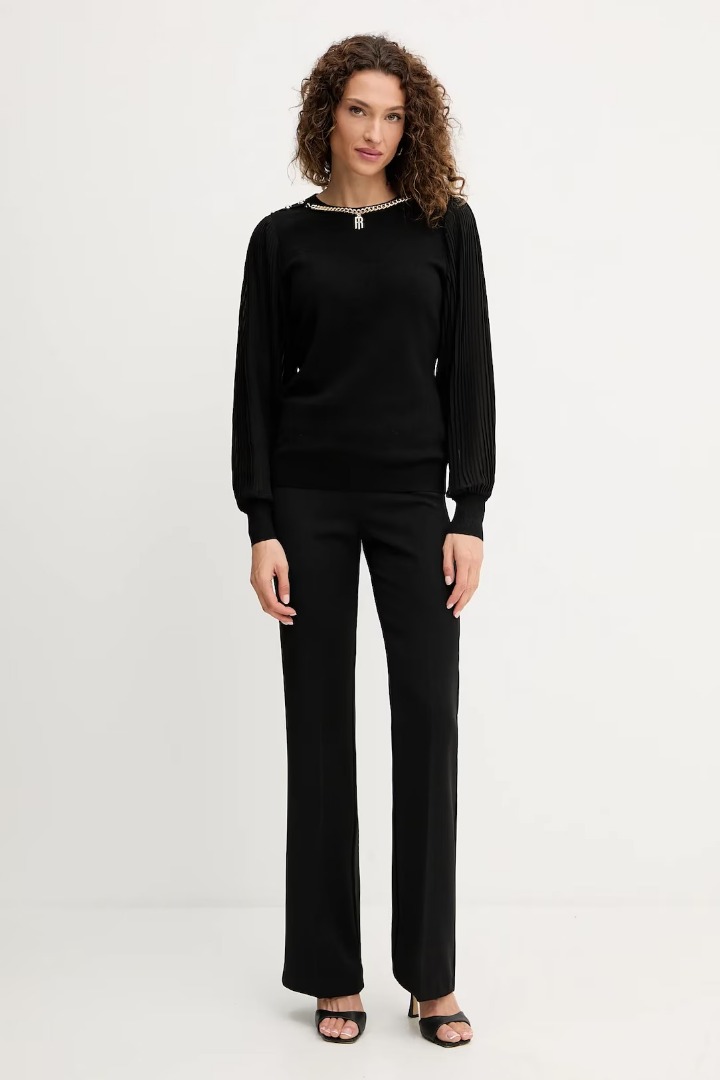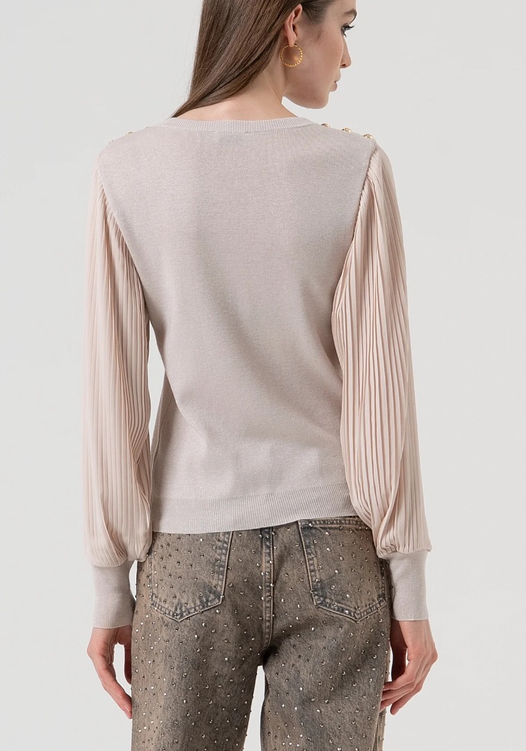 Regular-fit sweater in wool and lurex, crew neck with applied jewel accessory, and with long balloon sleeves in pleated georgette