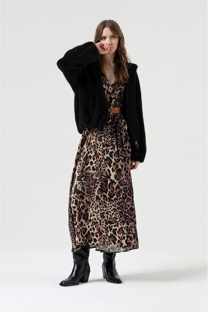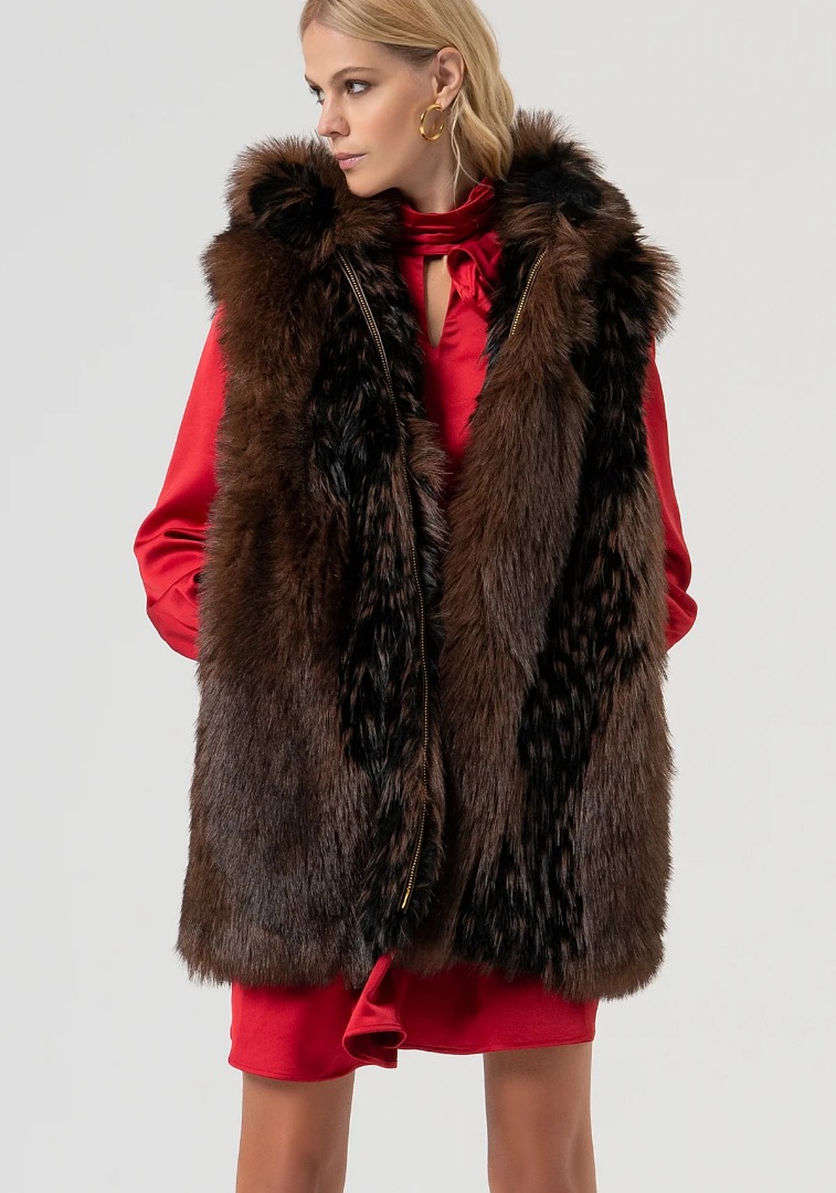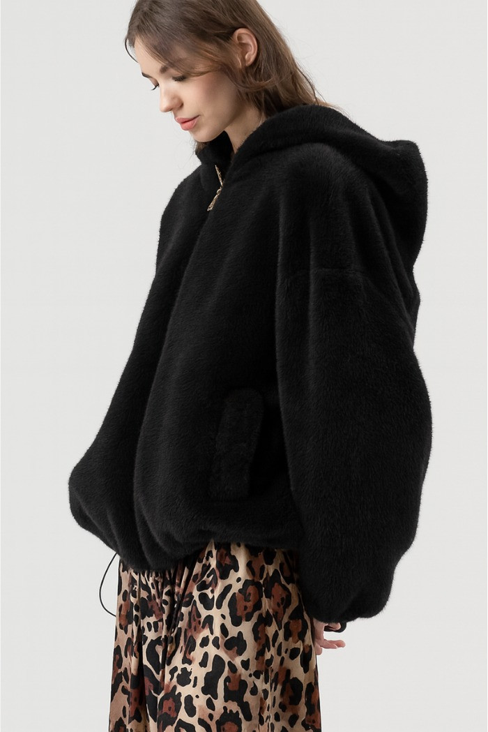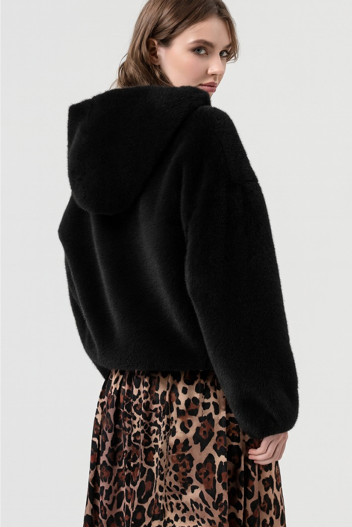 Regular fit bomber jacket in faux fur with hood, central zip opening, side pockets, drawstring at the bottom and long sleeves