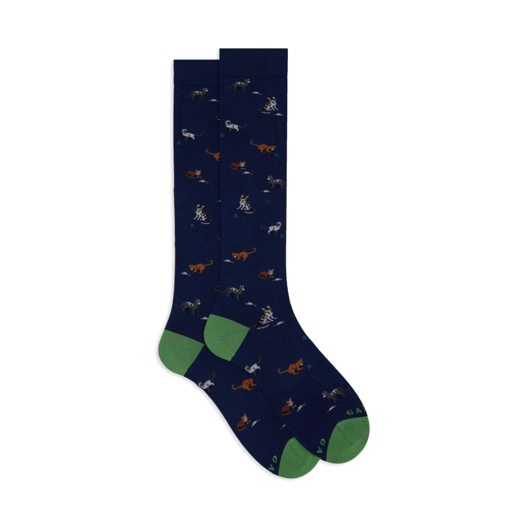 Men's long socks in very light cotton in shades of blue, made in Italy. Very soft to the touch, created for those who do not give up a detail of style. The pattern cats with mice balls makes them cool and fun. Suitable for a formal or sparkling look. The perfect fit Gallo, synonymous with Italian quality since 1927.